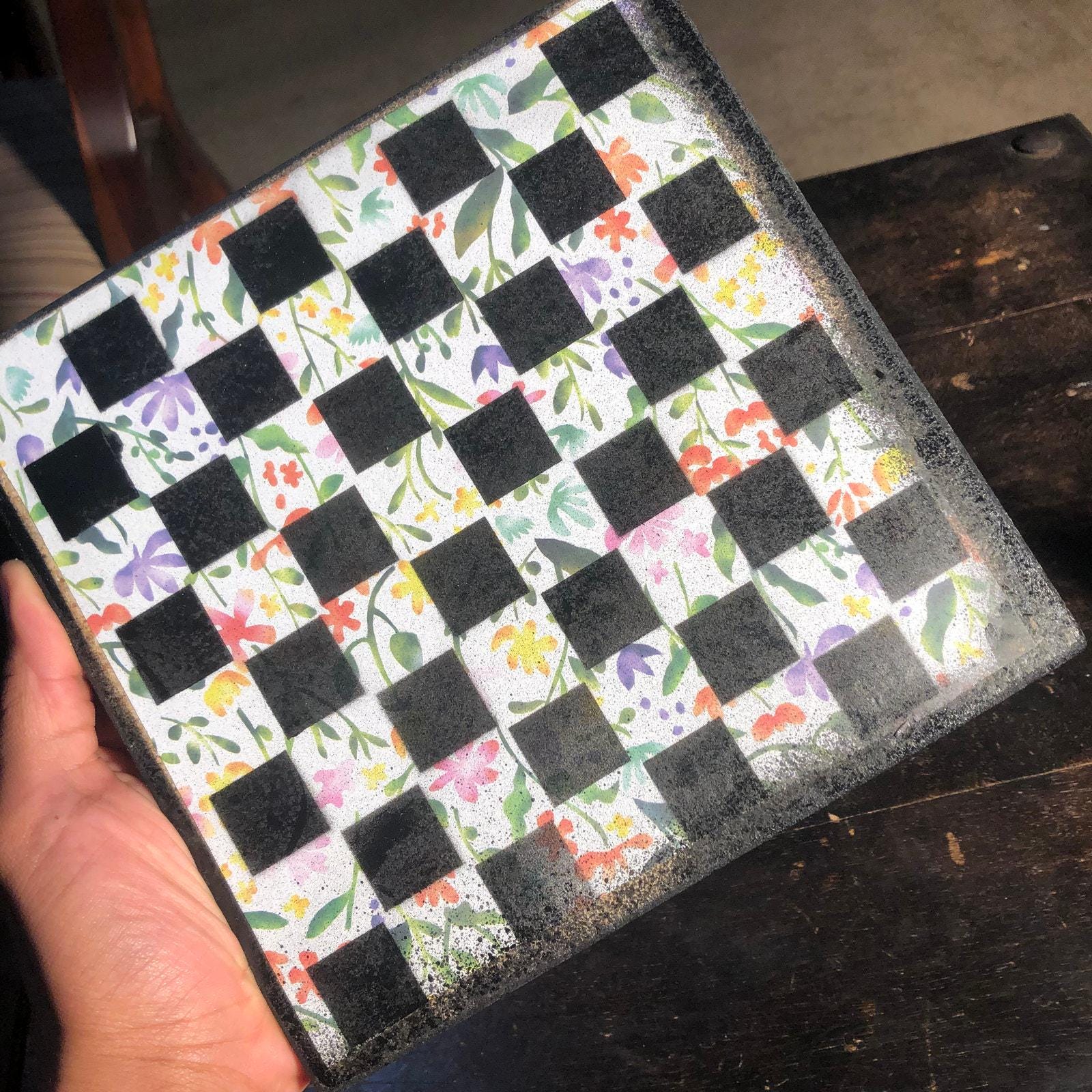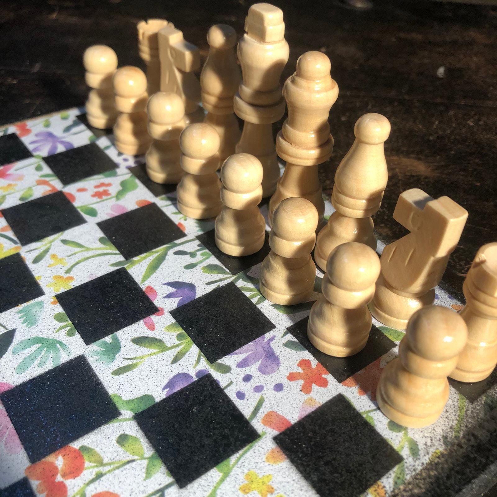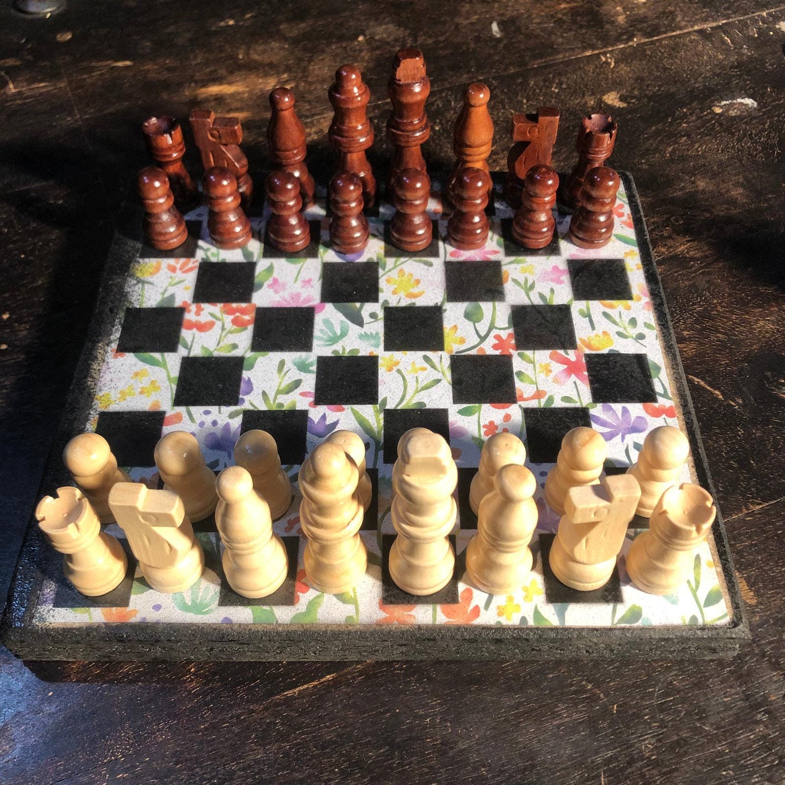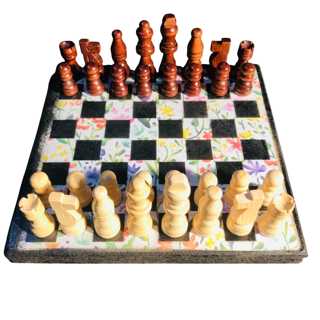 Introducing our exclusive Handcrafted Wooden Chess Set, meticulously designed with precision and care. Measuring 8 inches by 8 inches, this chess set features a beautifully painted particle board layered with a sheet of scrapbook paper board that doubles as a work of art. Each set is a unique, one-of-a-kind creation, crafted by hand to ensure that no two sets are alike. Elevate your gaming experience with this exceptional chess set that combines vibrant design with the touch of artisan craftsmanship. This chess board comes with chess pieces and is handcrafted as a one of one
