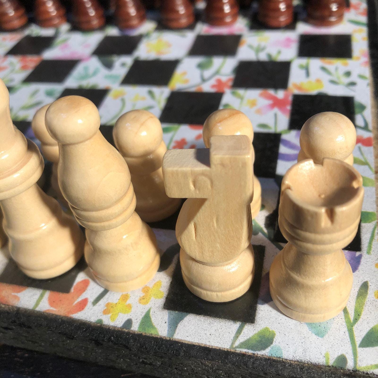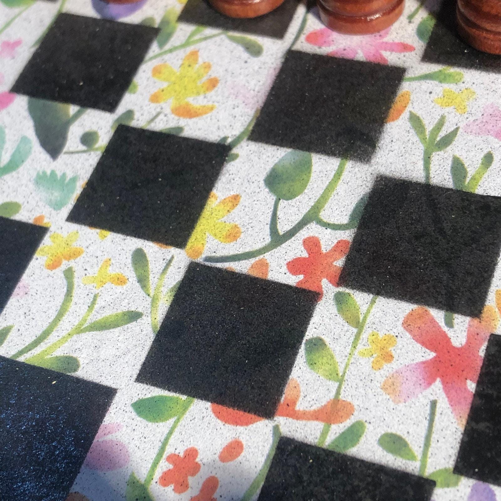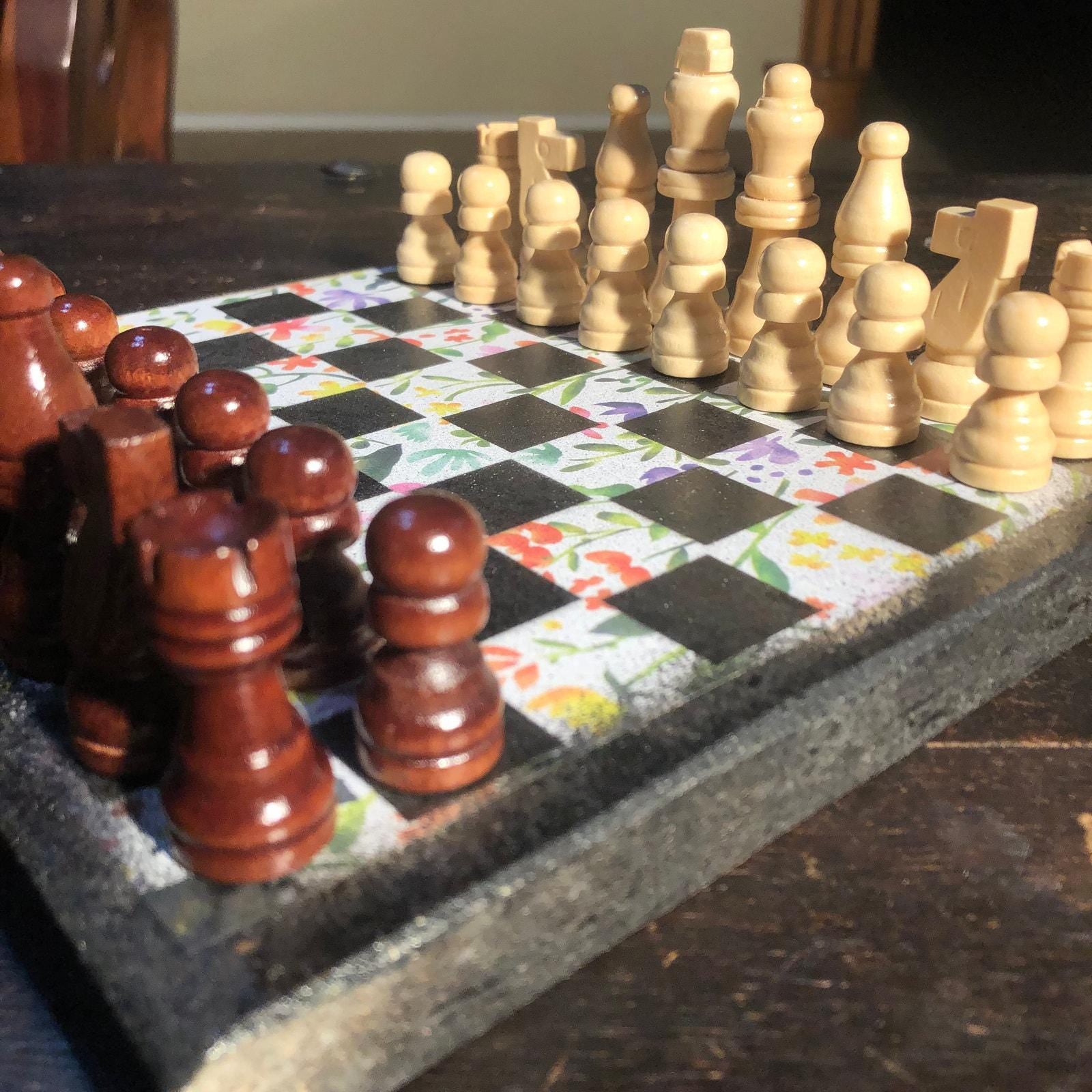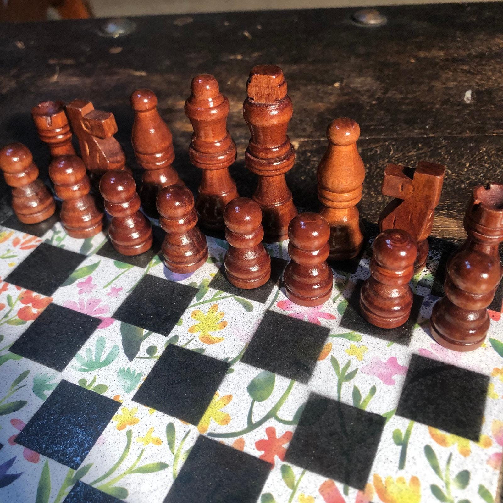 Introducing our exclusive Handcrafted Wooden Chess Set, meticulously designed with precision and care. Measuring 8 inches by 8 inches, this chess set features a beautifully painted particle board layered with a sheet of scrapbook paper board that doubles as a work of art. Each set is a unique, one-of-a-kind creation, crafted by hand to ensure that no two sets are alike. Elevate your gaming experience with this exceptional chess set that combines vibrant design with the touch of artisan craftsmanship. This chess board comes with chess pieces and is handcrafted as a one of one
