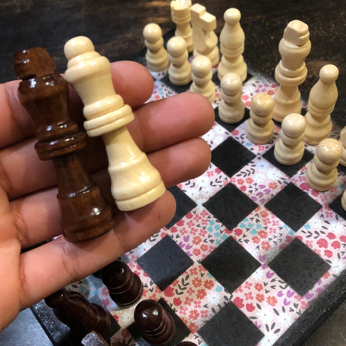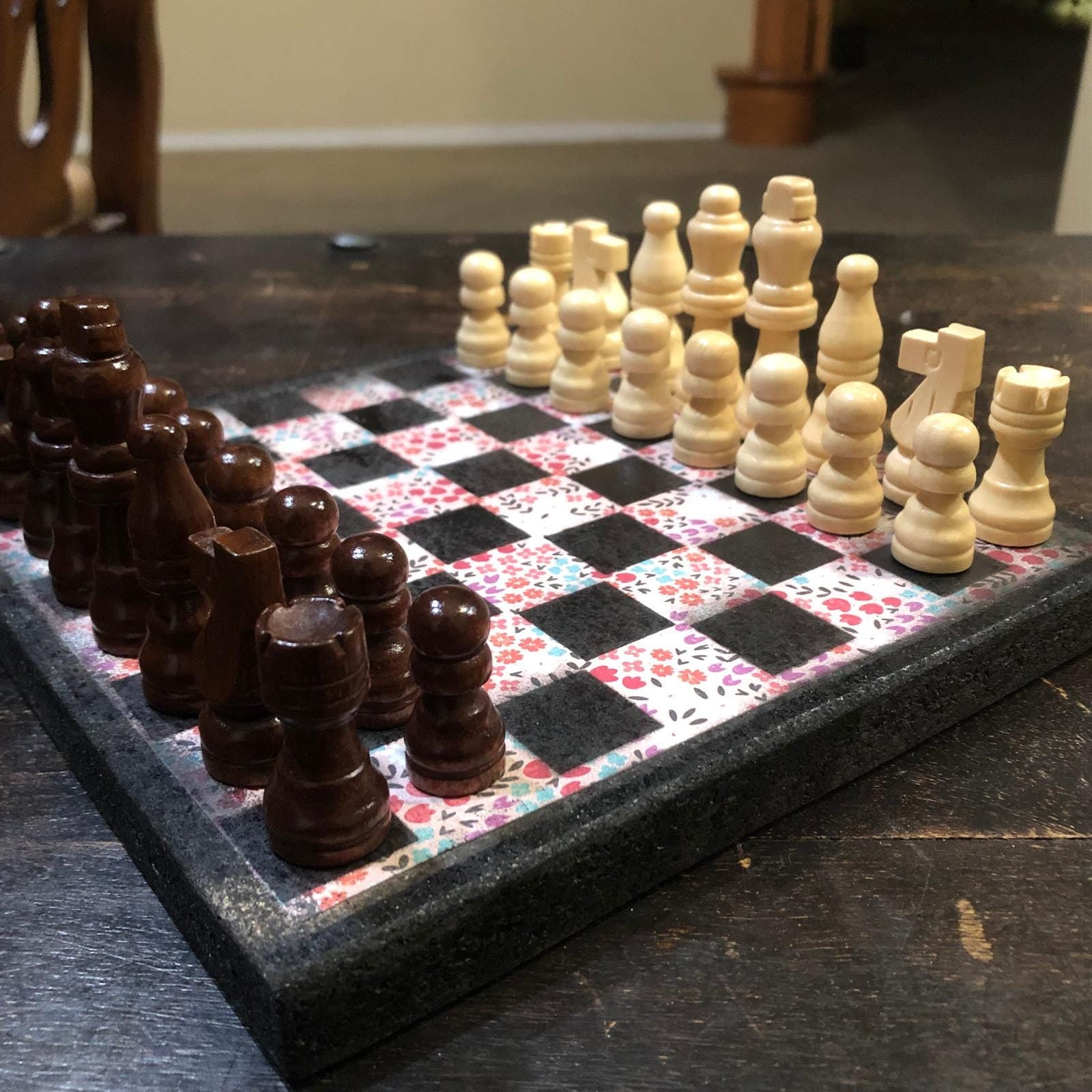 Introducing our exclusive Handcrafted Wooden Chess Set, meticulously designed with precision and care. Measuring 8 inches by 8 inches, this chess set features a beautifully painted particle board layered with a sheet of scrapbook paper board that doubles as a work of art. Each set is a unique, one-of-a-kind creation, crafted by hand to ensure that no two sets are alike. Elevate your gaming experience with this exceptional chess set that combines vibrant design with the touch of artisan craftsmanship. This chess board comes with chess pieces and is handcrafted as a one of one