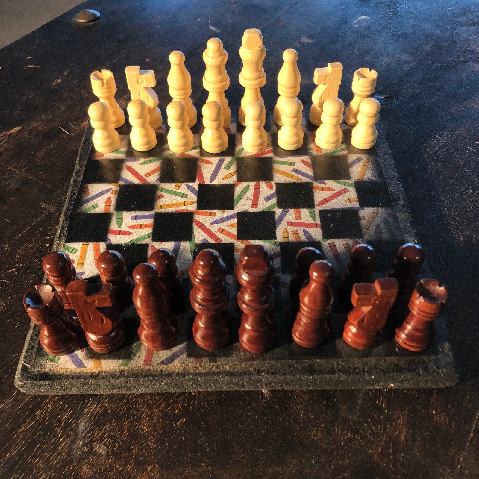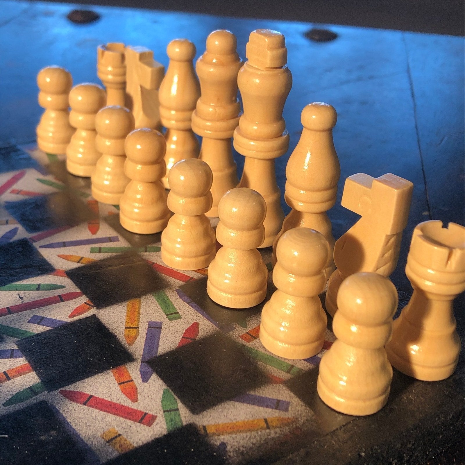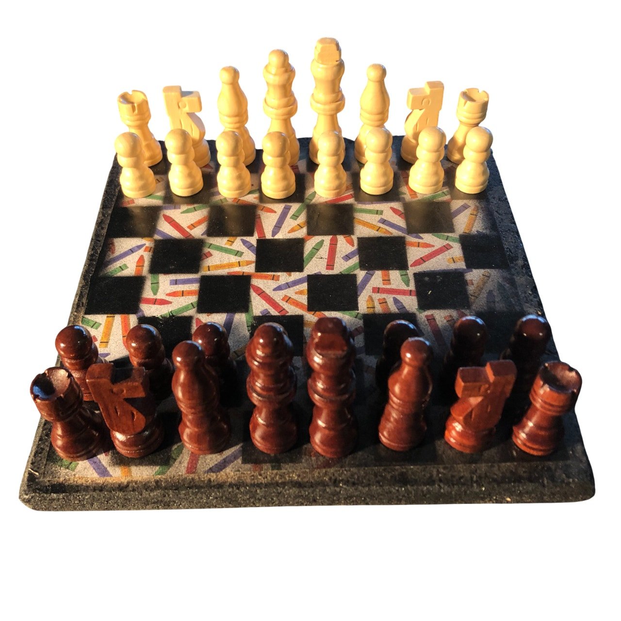 Introducing our exclusive Handcrafted Wooden Chess Set, meticulously designed with precision and care. Measuring 8 inches by 8 inches, this chess set features a beautifully painted particle board layered with a sheet of scrapbook paper board that doubles as a work of art. Each set is a unique, one-of-a-kind creation, crafted by hand to ensure that no two sets are alike. Elevate your gaming experience with this exceptional chess set that combines vibrant design with the touch of artisan craftsmanship. This chess board comes with chess pieces and is handcrafted as a one of one