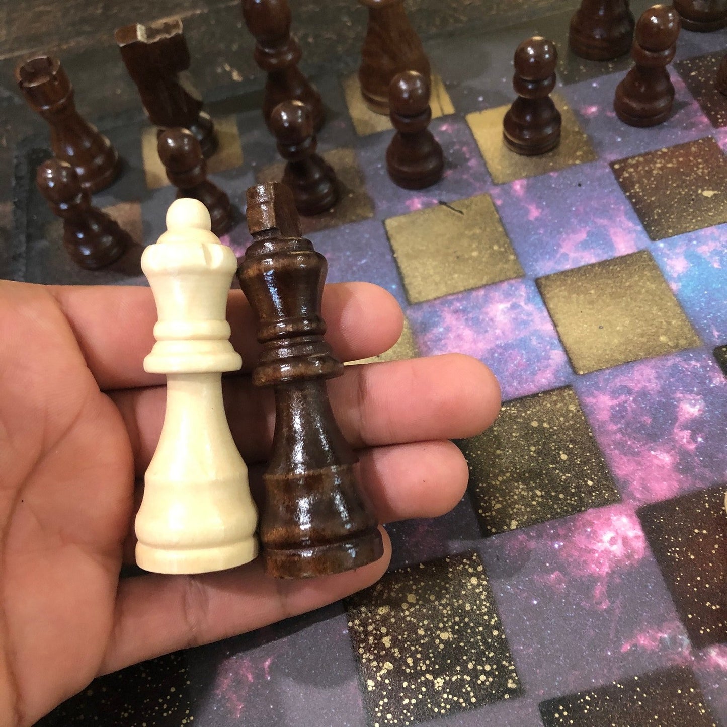 Introducing our exclusive Handcrafted Wooden Chess Set, meticulously designed with precision and care. Measuring 12 inches by 12 inches, this chess set features a beautifully painted particle board layered with a sheet of scrapbook paper board that doubles as a work of art. Each set is a unique, one-of-a-kind creation, crafted by hand to ensure that no two sets are alike. Elevate your gaming experience with this exceptional chess set that combines vibrant design with the touch of artisan craftsmanship. This chess board comes with chess pieces and is handcrafted as a one of one