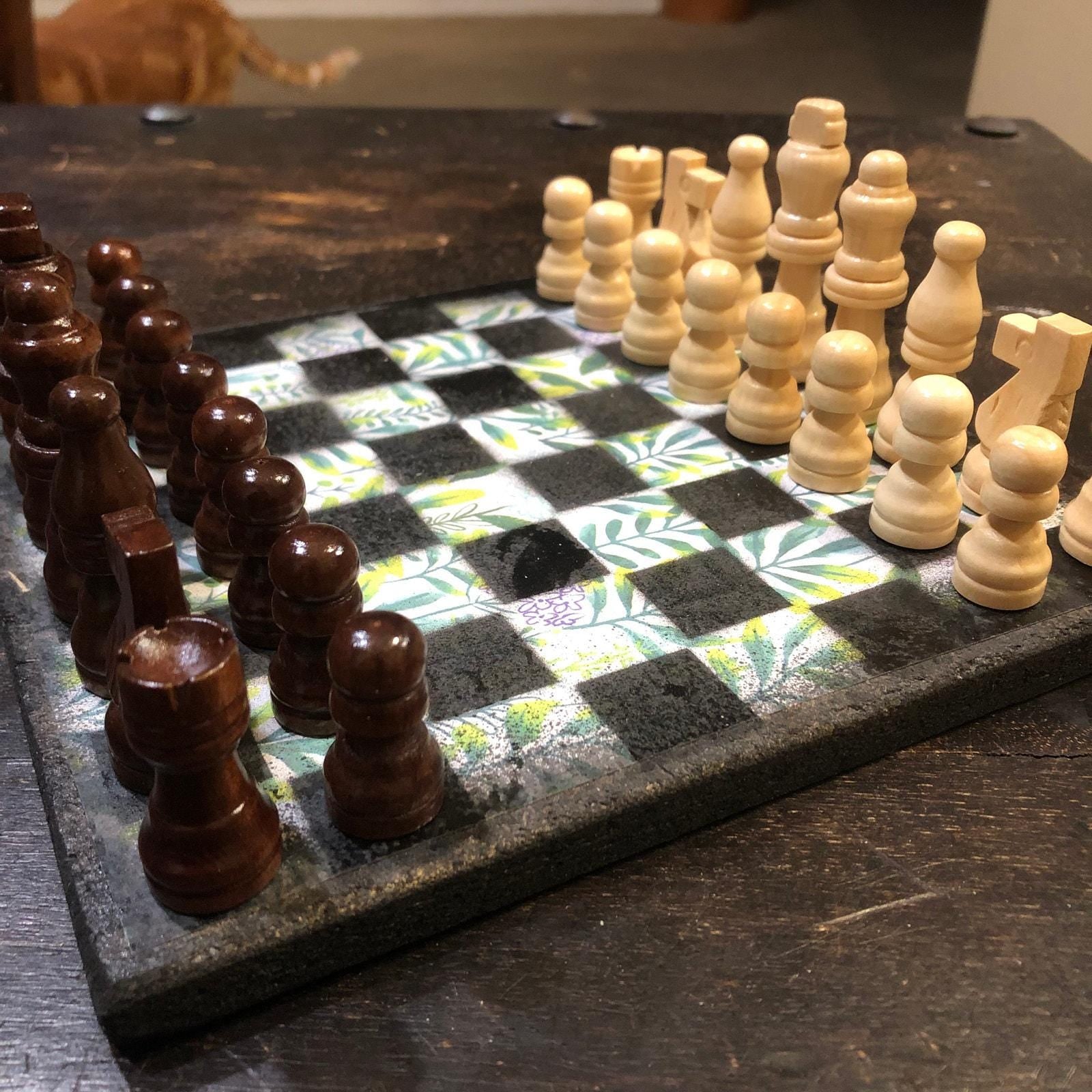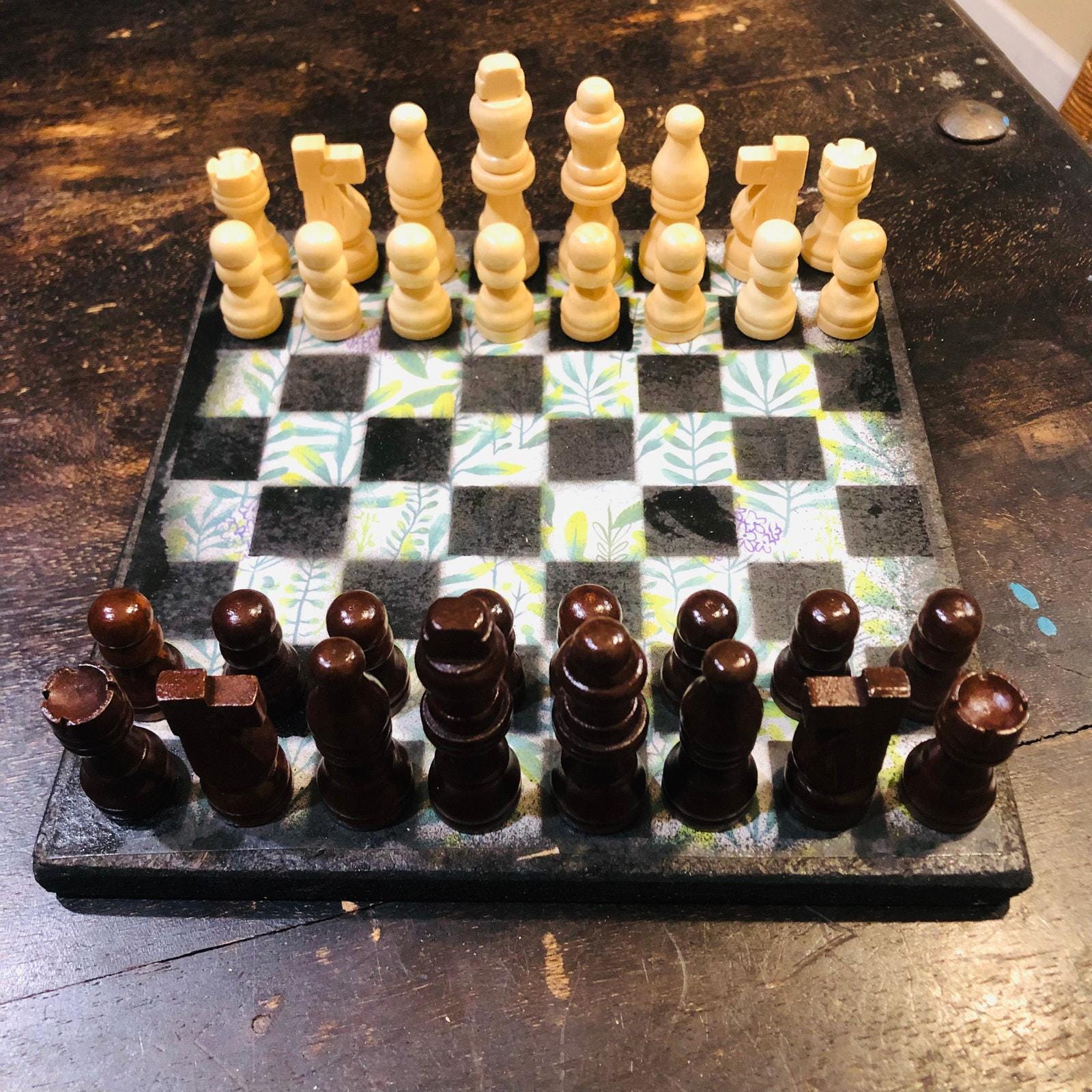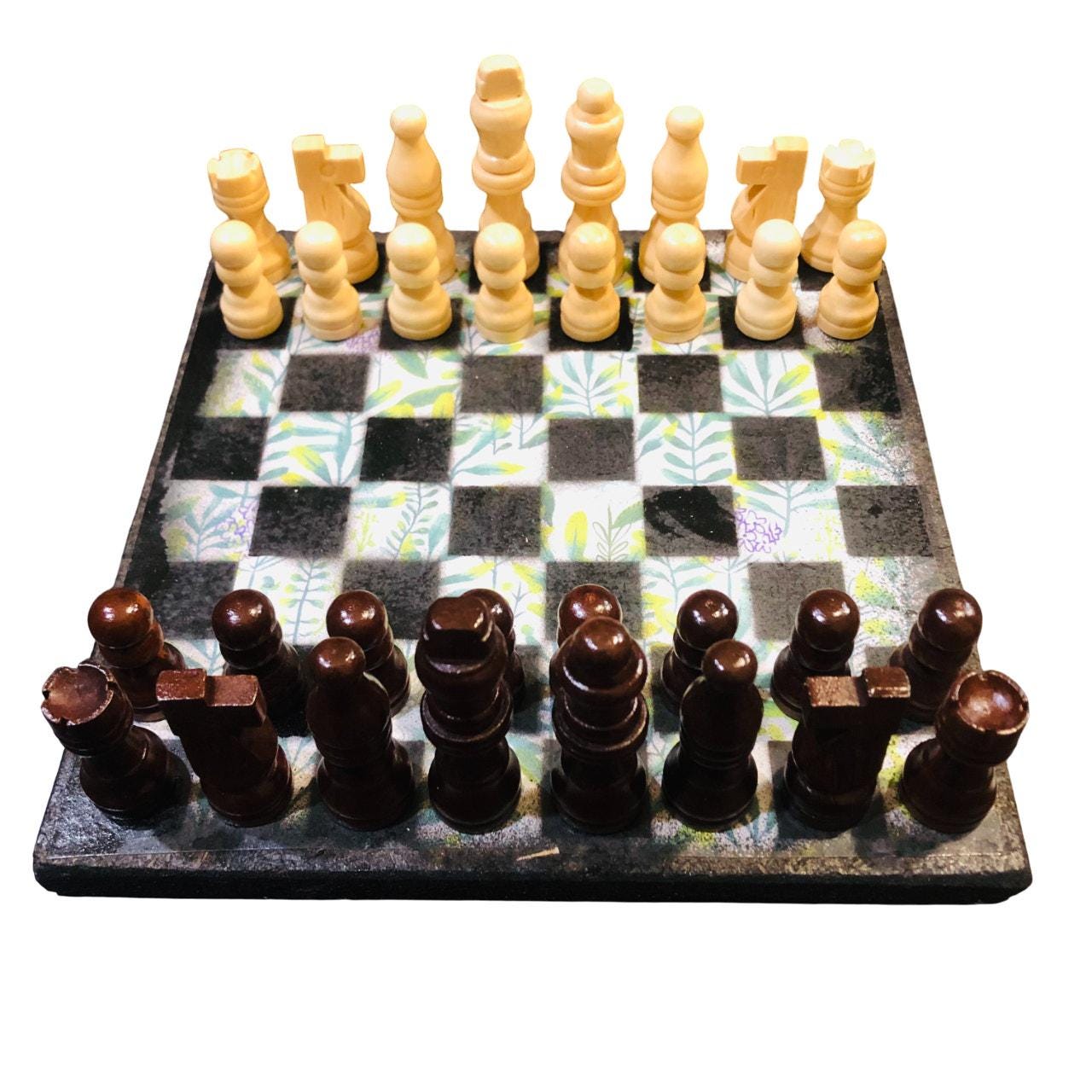 Introducing our exclusive Handcrafted Wooden Chess Set, meticulously designed with precision and care. Measuring 8 inches by 8 inches, this chess set features a beautifully painted particle board layered with a sheet of scrapbook paper board that doubles as a work of art. Each set is a unique, one-of-a-kind creation, crafted by hand to ensure that no two sets are alike. Elevate your gaming experience with this exceptional chess set that combines vibrant design with the touch of artisan craftsmanship. This chess board comes with chess pieces and is handcrafted as a one of one