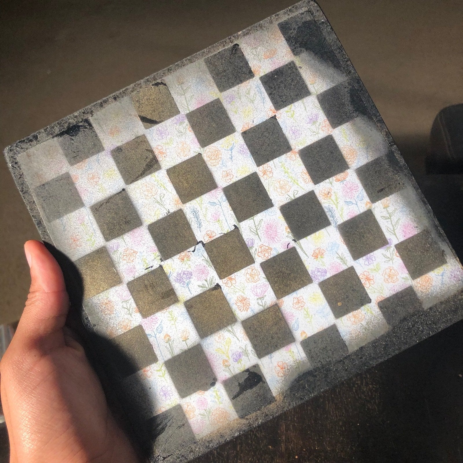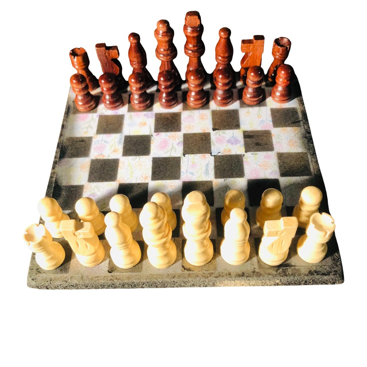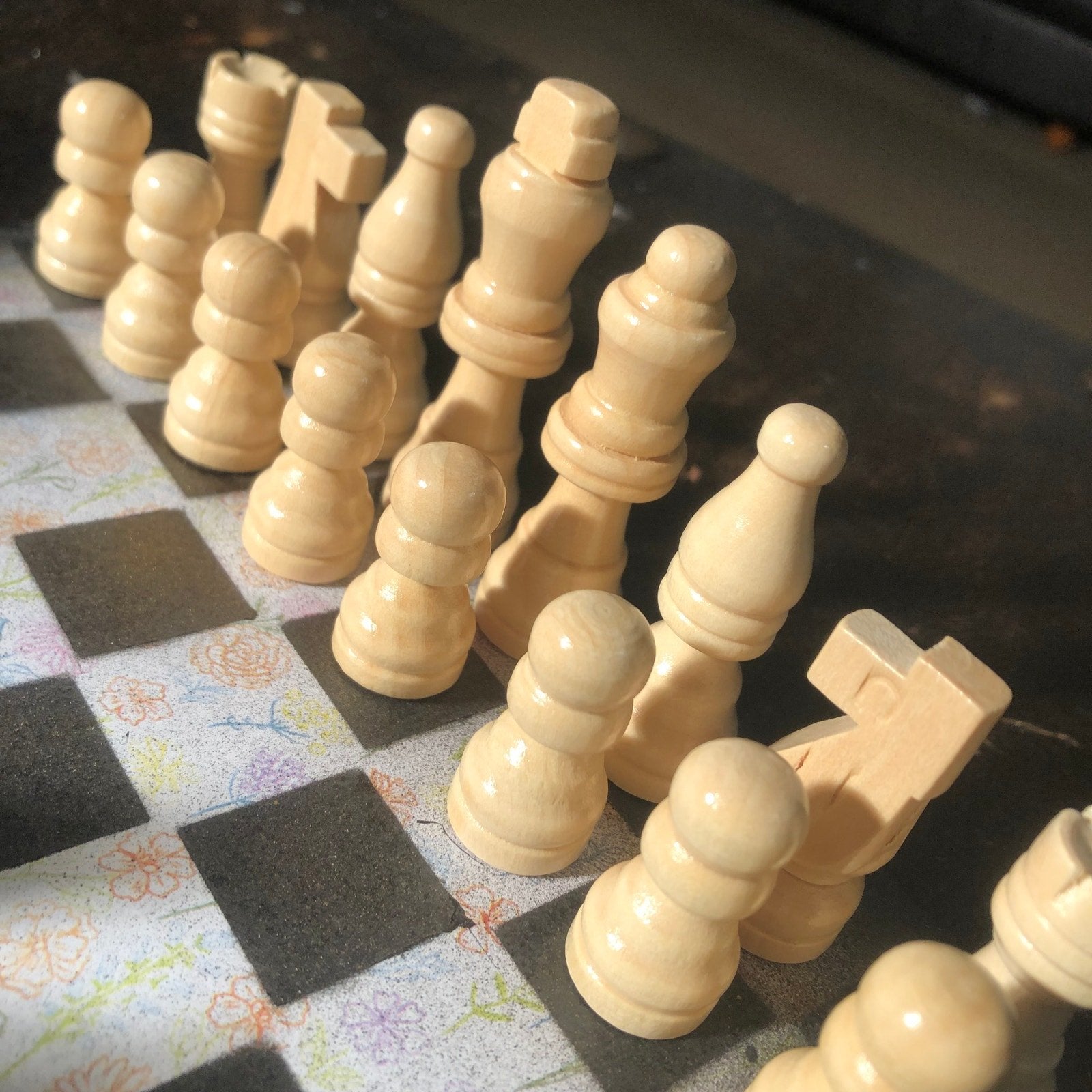 Introducing our exclusive Handcrafted Wooden Chess Set, meticulously designed with precision and care. Measuring 8 inches by 8 inches, this chess set features a beautifully painted particle board layered with a sheet of scrapbook paper board that doubles as a work of art. Each set is a unique, one-of-a-kind creation, crafted by hand to ensure that no two sets are alike. Elevate your gaming experience with this exceptional chess set that combines vibrant design with the touch of artisan craftsmanship. This chess board comes with chess pieces and is handcrafted as a one of one