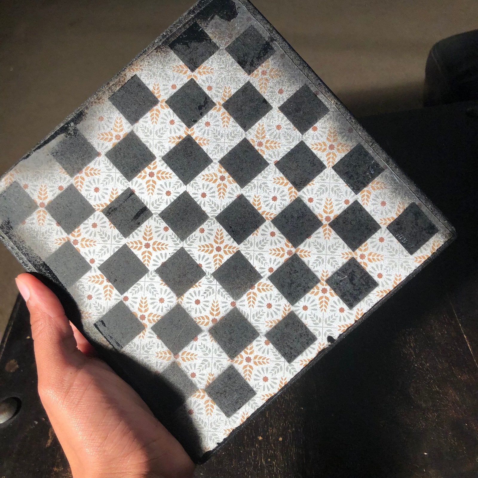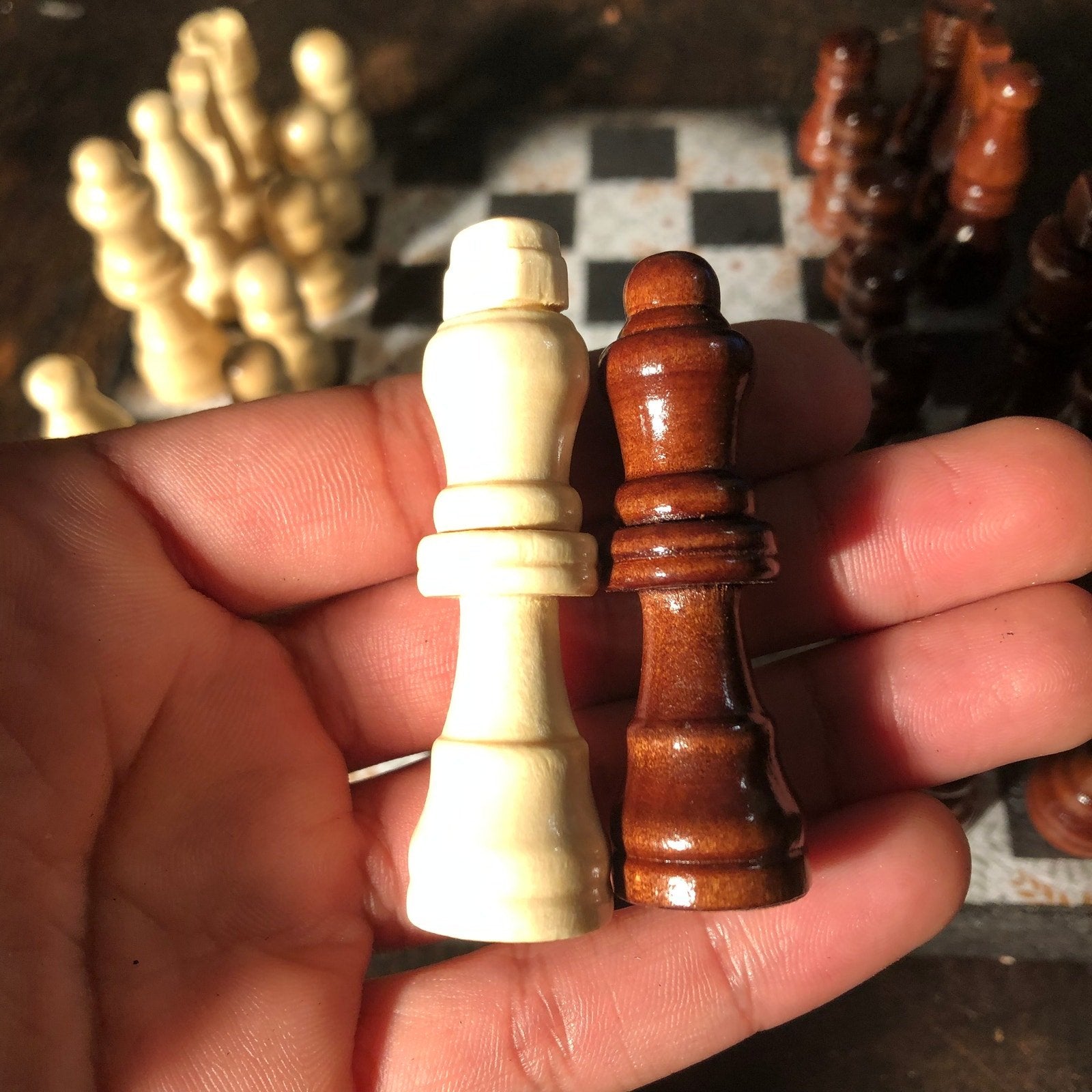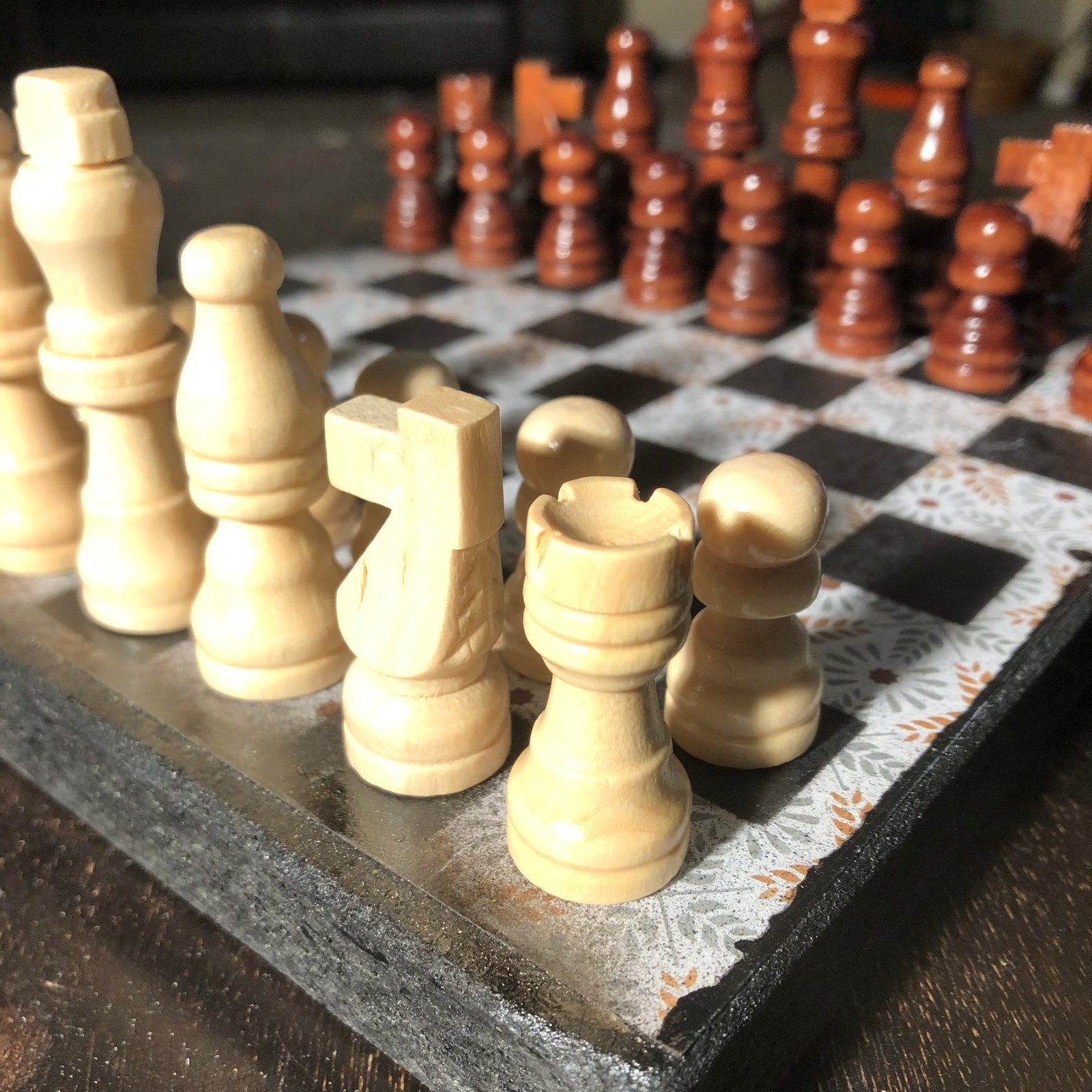 Introducing our exclusive Handcrafted Wooden Chess Set, meticulously designed with precision and care. Measuring 8 inches by 8 inches, this chess set features a beautifully painted particle board layered with a sheet of scrapbook paper board that doubles as a work of art. Each set is a unique, one-of-a-kind creation, crafted by hand to ensure that no two sets are alike. Elevate your gaming experience with this exceptional chess set that combines vibrant design with the touch of artisan craftsmanship. This chess board comes with chess pieces and is handcrafted as a one of one