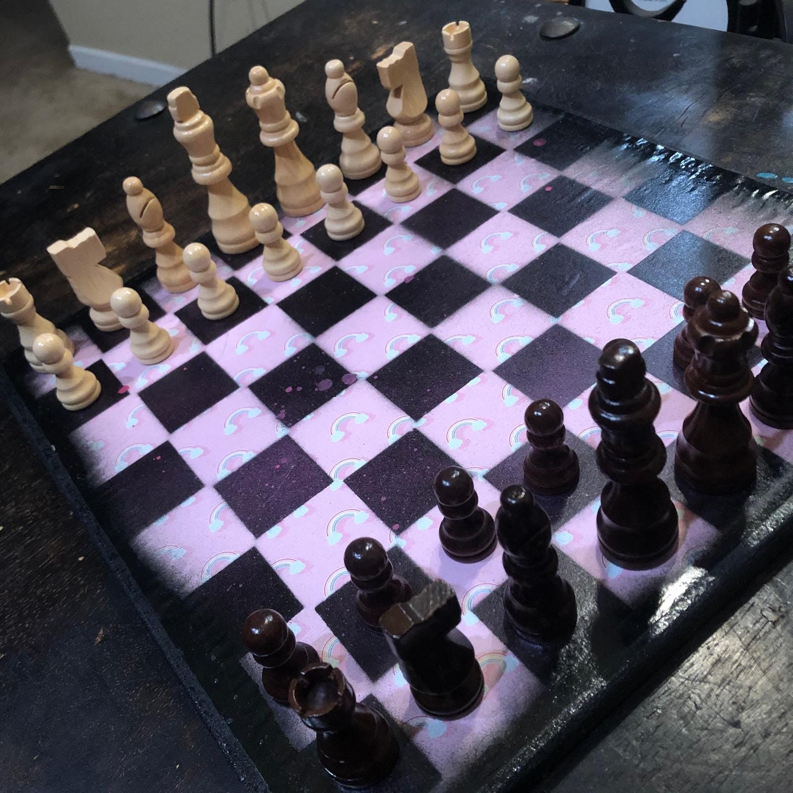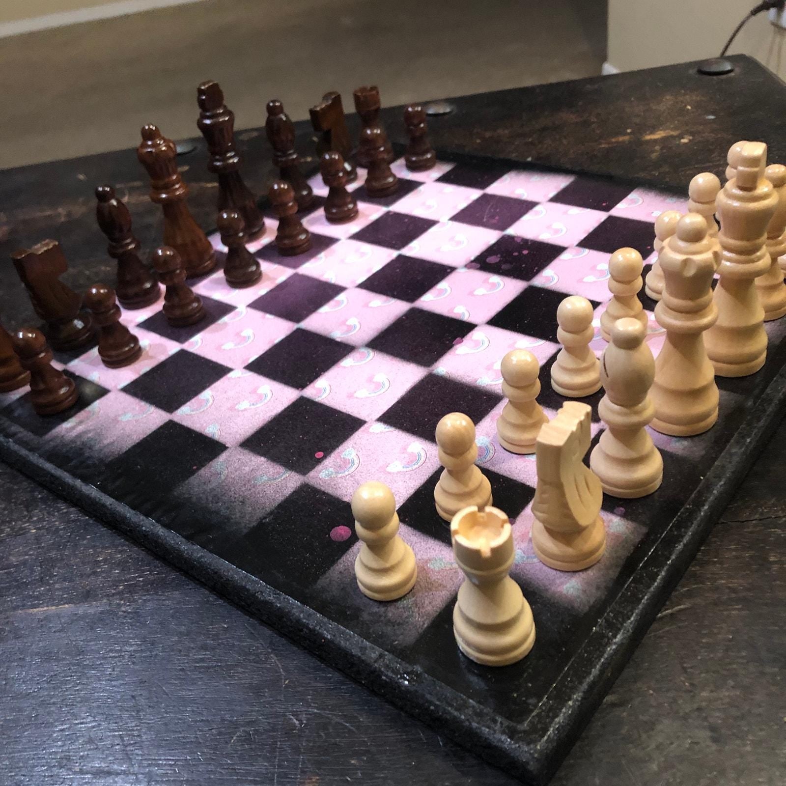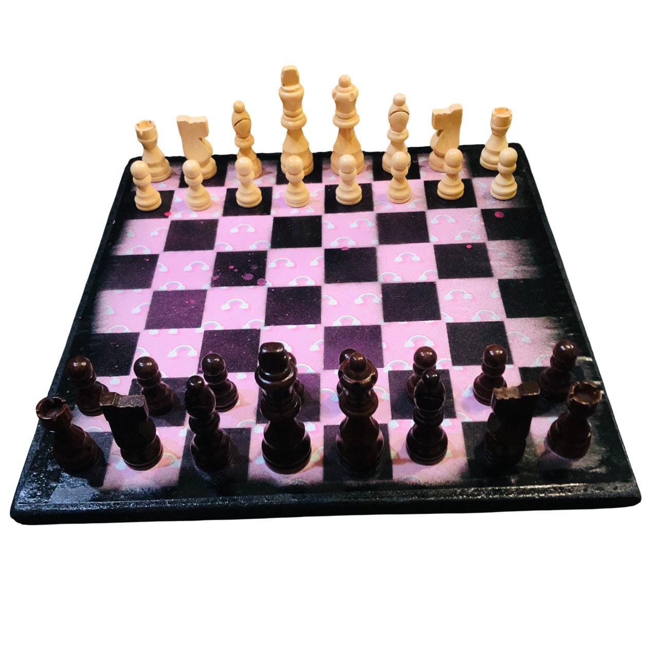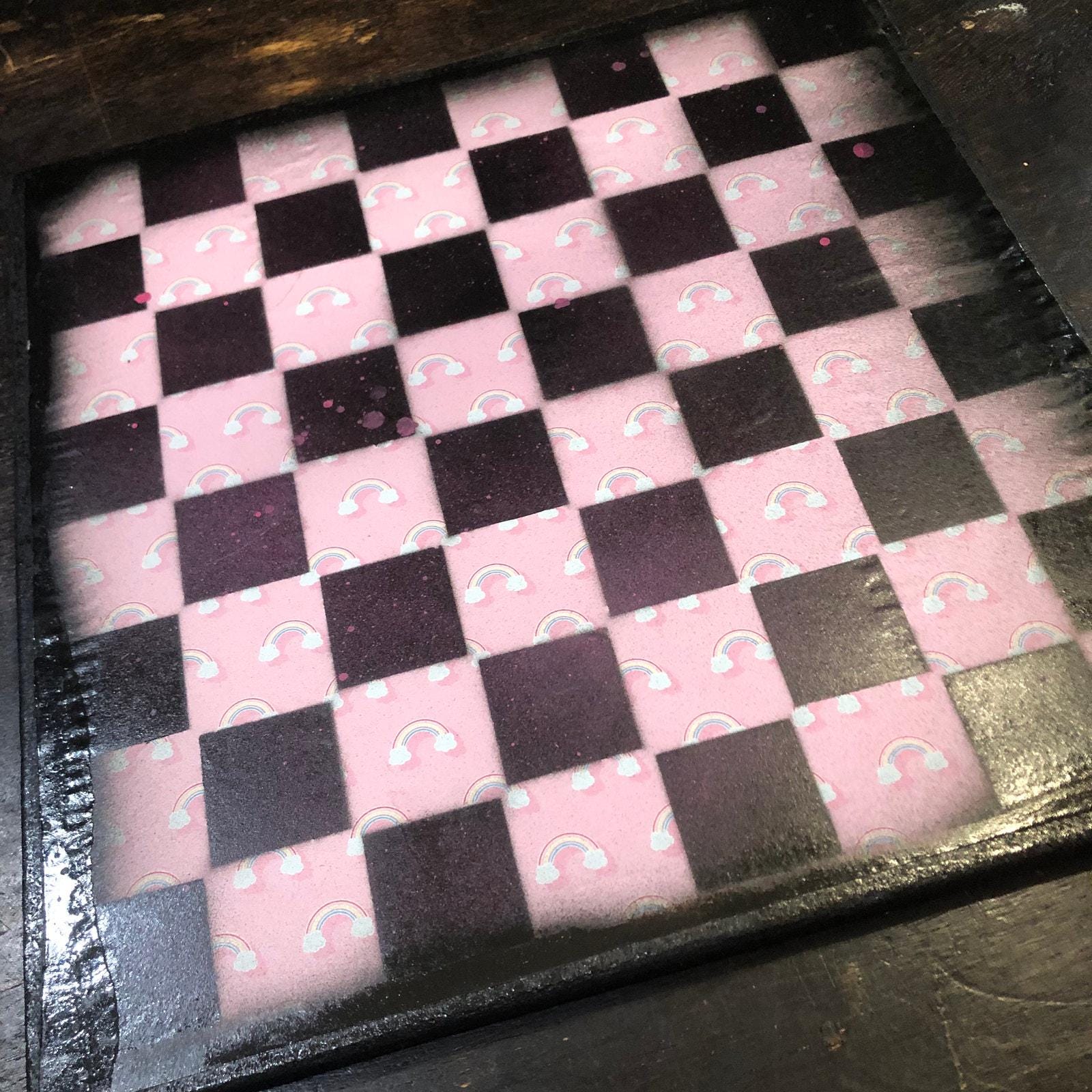 Introducing our exclusive Handcrafted Wooden Chess Set, meticulously designed with precision and care. Measuring 12 inches by 12 inches, this chess set features a beautifully painted particle board layered with a sheet of scrapbook paper board that doubles as a work of art. Each set is a unique, one-of-a-kind creation, crafted by hand to ensure that no two sets are alike. Elevate your gaming experience with this exceptional chess set that combines vibrant design with the touch of artisan craftsmanship. This chess board comes with chess pieces and is handcrafted as a one of one