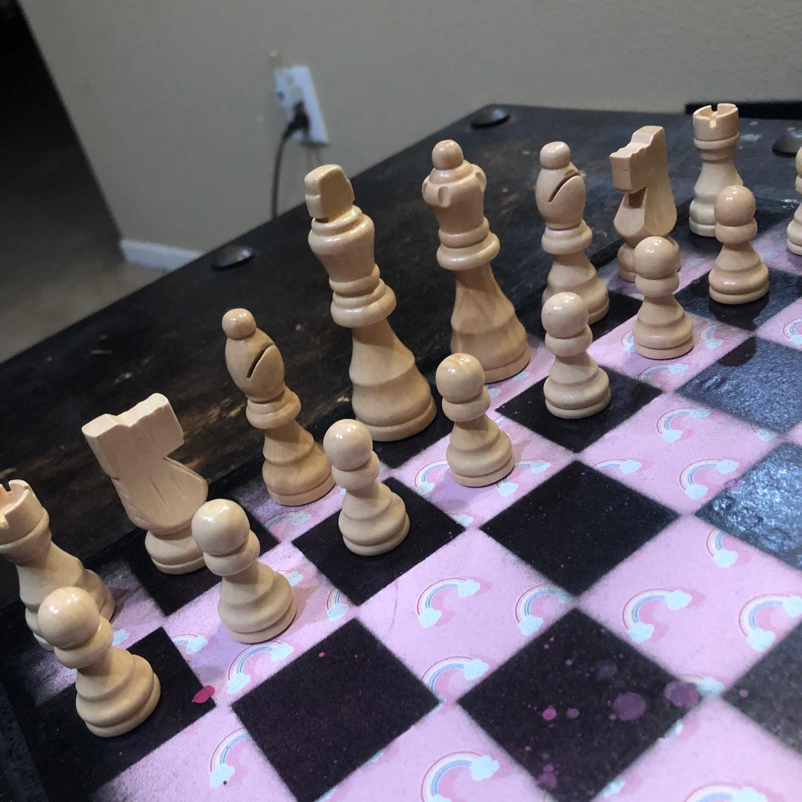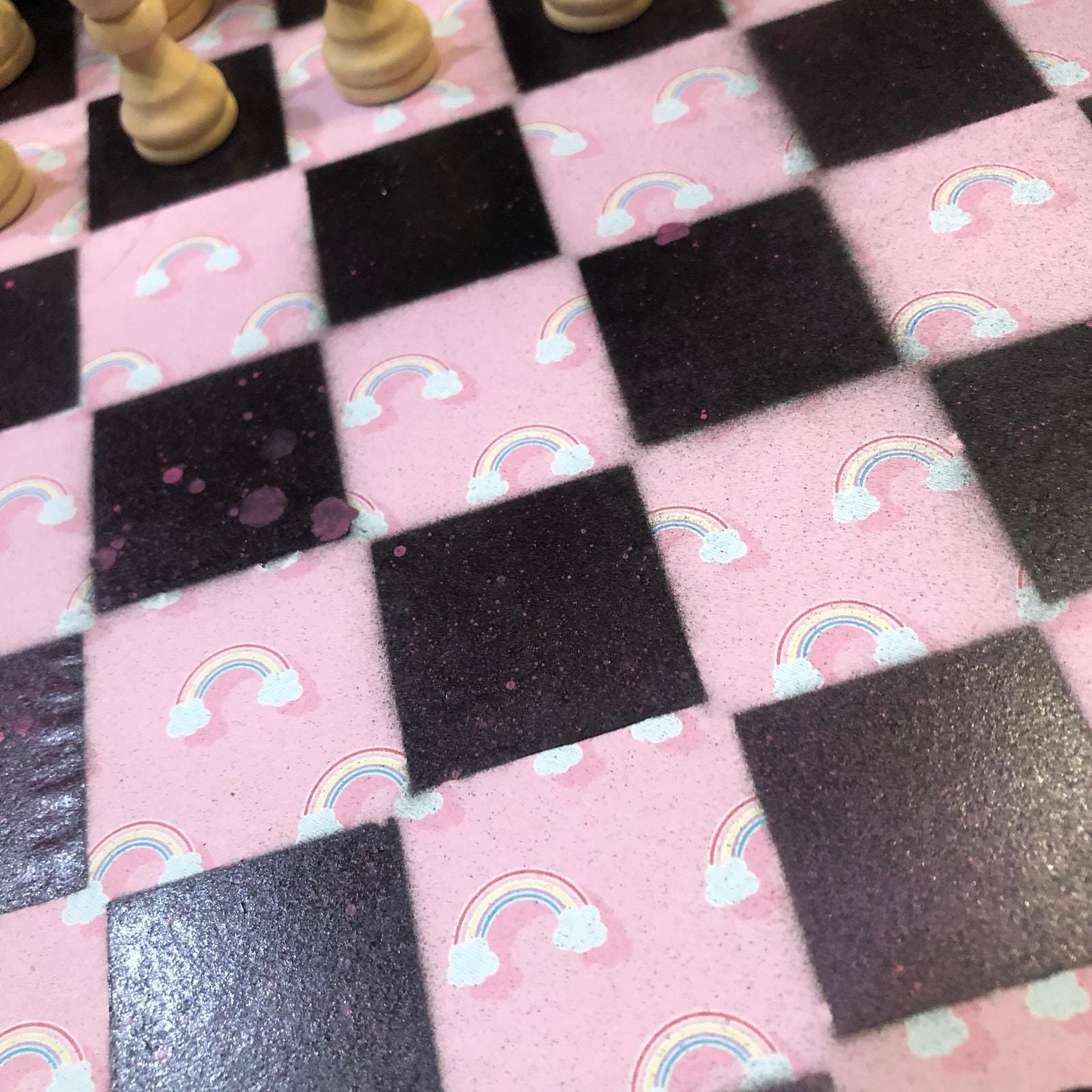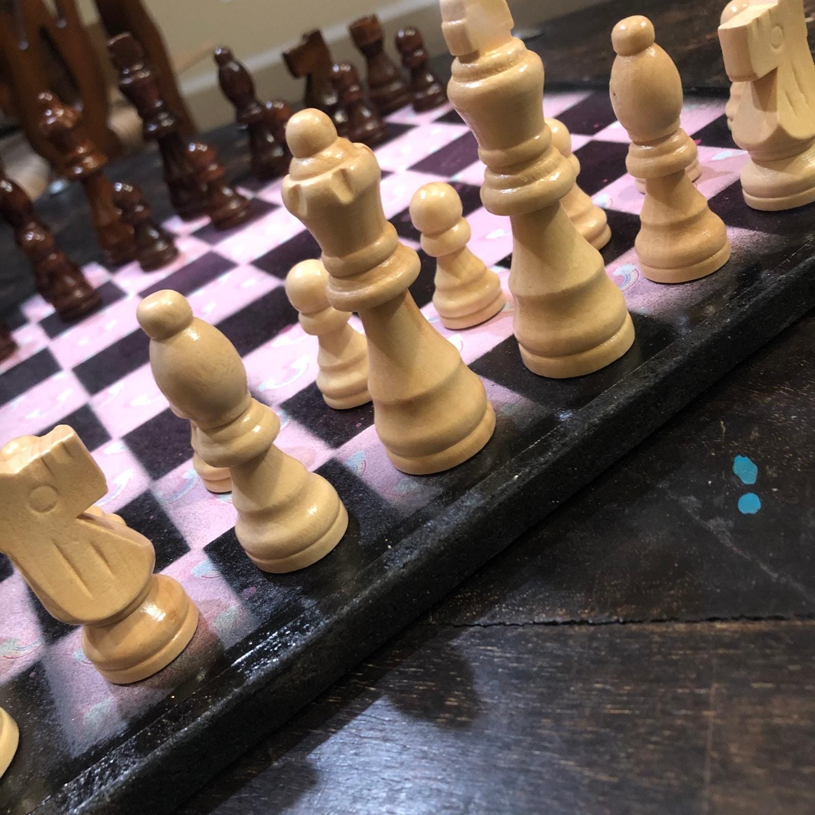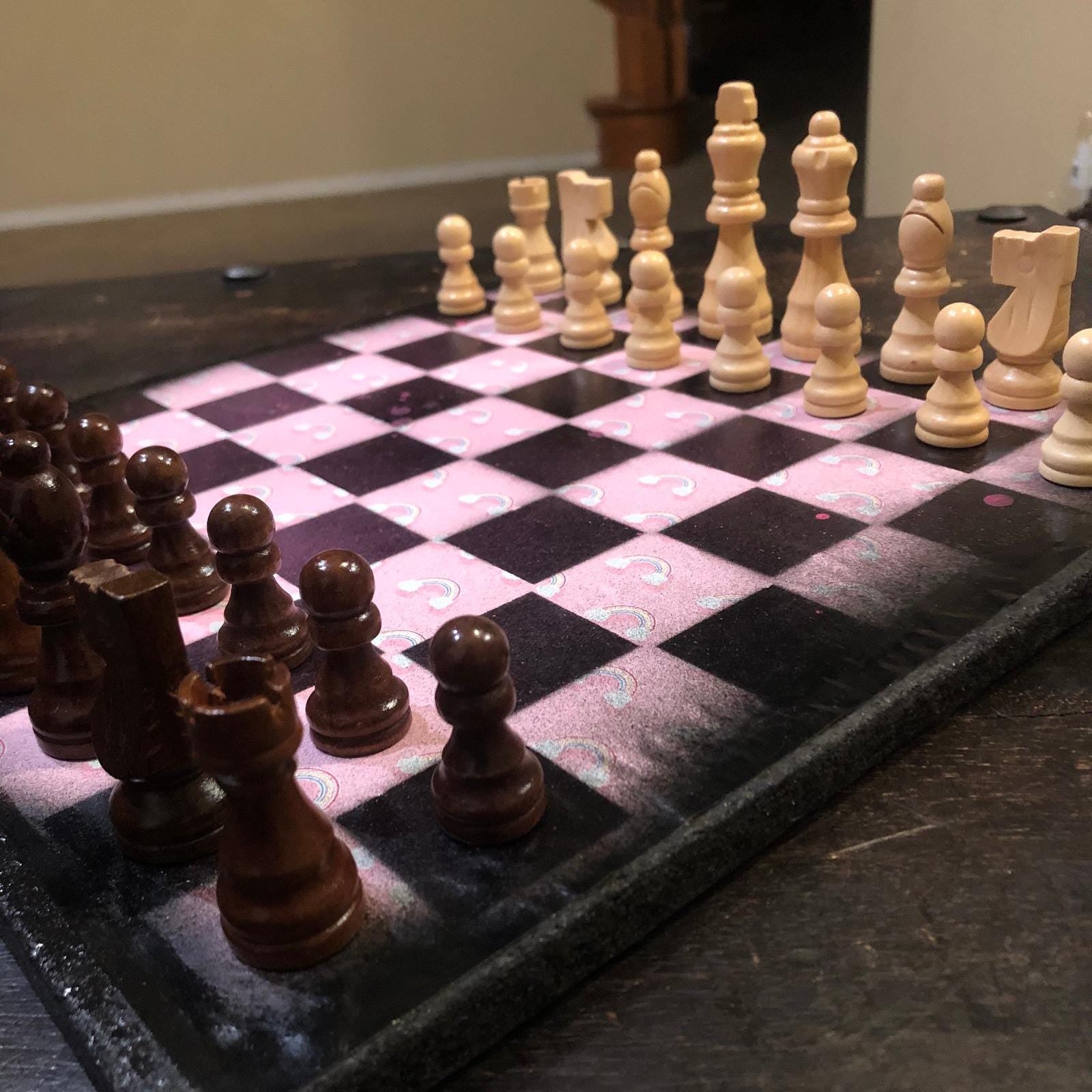 Introducing our exclusive Handcrafted Wooden Chess Set, meticulously designed with precision and care. Measuring 12 inches by 12 inches, this chess set features a beautifully painted particle board layered with a sheet of scrapbook paper board that doubles as a work of art. Each set is a unique, one-of-a-kind creation, crafted by hand to ensure that no two sets are alike. Elevate your gaming experience with this exceptional chess set that combines vibrant design with the touch of artisan craftsmanship. This chess board comes with chess pieces and is handcrafted as a one of one
