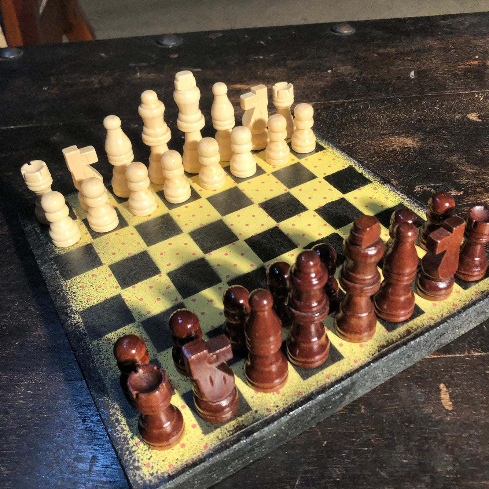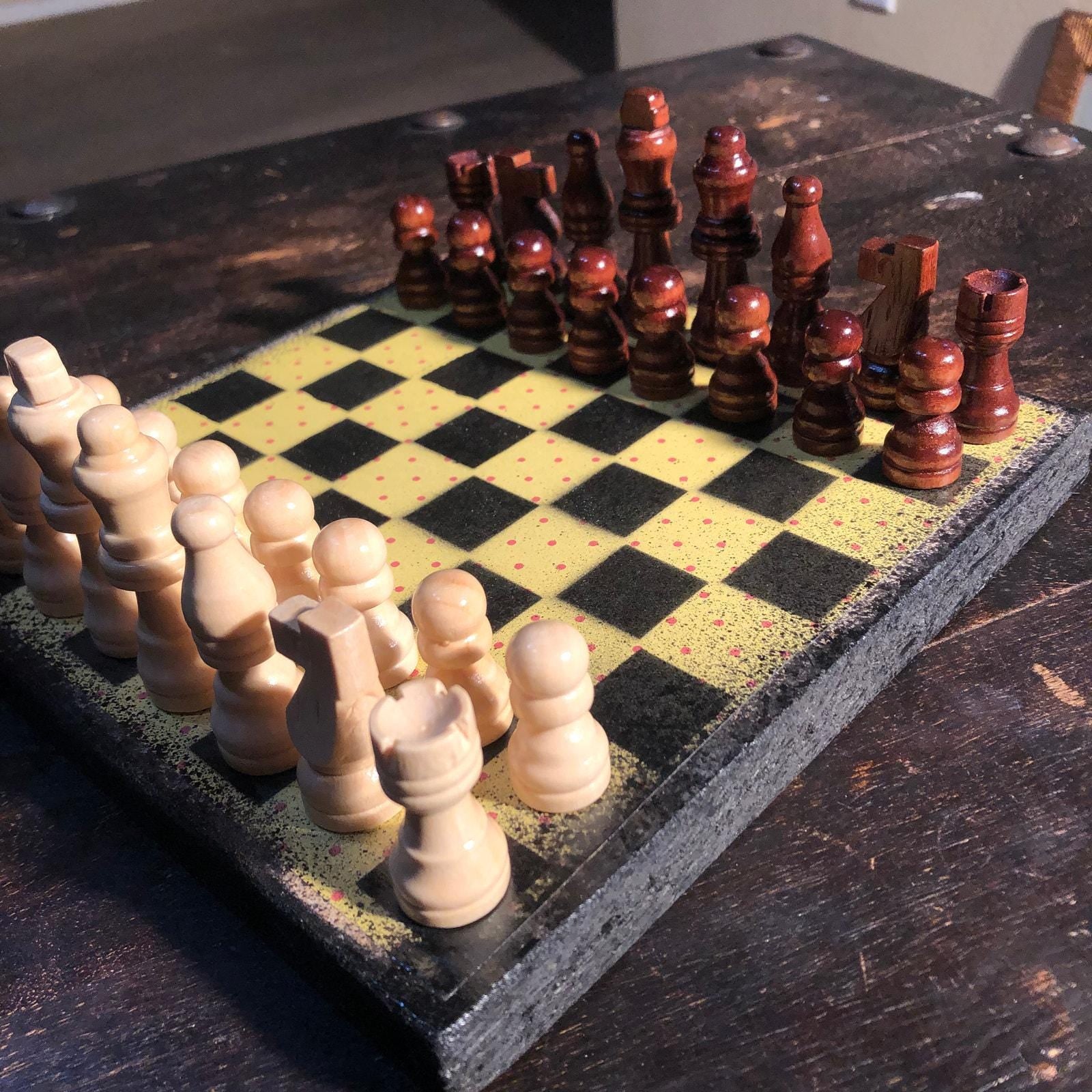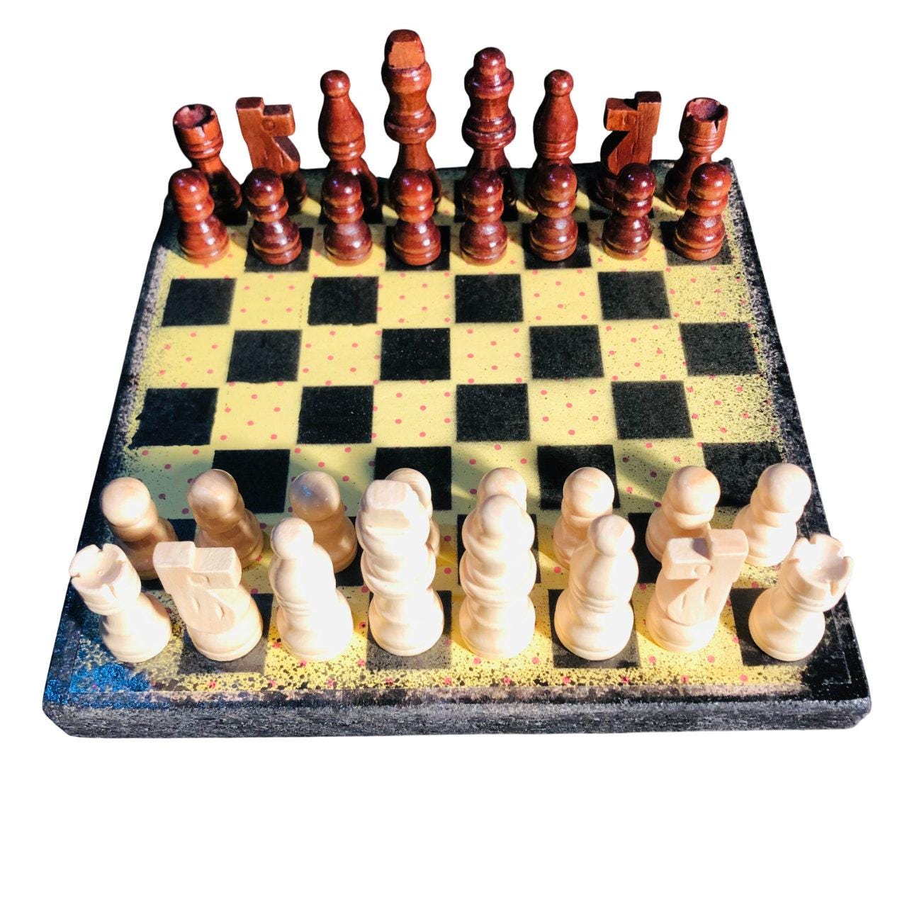 Introducing our exclusive Handcrafted Wooden Chess Set, meticulously designed with precision and care. Measuring 8 inches by 8 inches, this chess set features a beautifully painted particle board layered with a sheet of scrapbook paper board that doubles as a work of art. Each set is a unique, one-of-a-kind creation, crafted by hand to ensure that no two sets are alike. Elevate your gaming experience with this exceptional chess set that combines vibrant design with the touch of artisan craftsmanship. This chess board comes with chess pieces and is handcrafted as a one of one