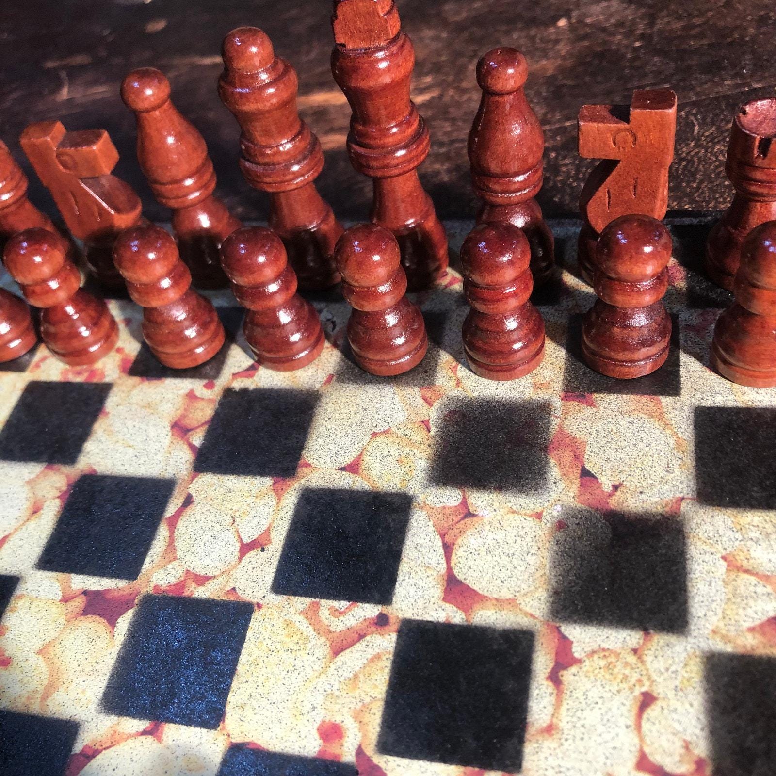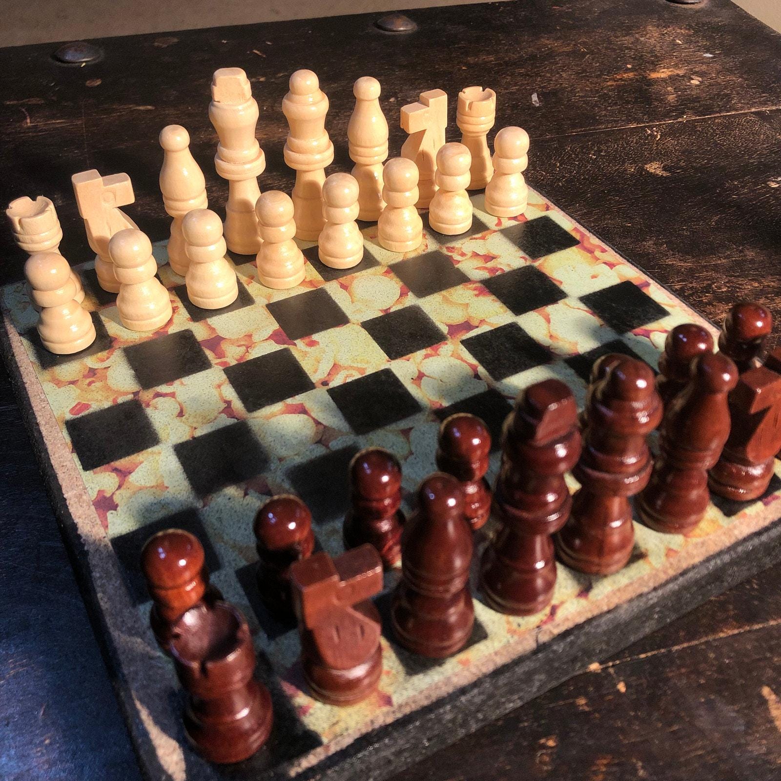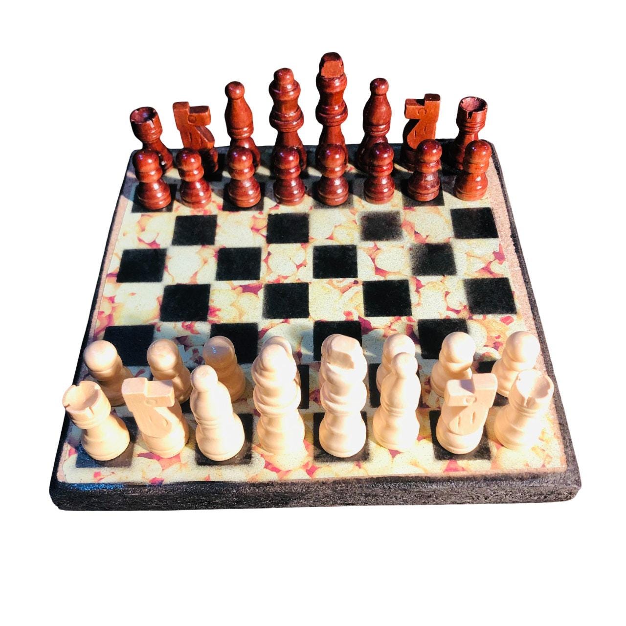 Introducing our exclusive Handcrafted Wooden Chess Set, meticulously designed with precision and care. Measuring 8 inches by 8 inches, this chess set features a beautifully painted particle board layered with a sheet of scrapbook paper board that doubles as a work of art. Each set is a unique, one-of-a-kind creation, crafted by hand to ensure that no two sets are alike. Elevate your gaming experience with this exceptional chess set that combines vibrant design with the touch of artisan craftsmanship. This chess board comes with chess pieces and is handcrafted as a one of one