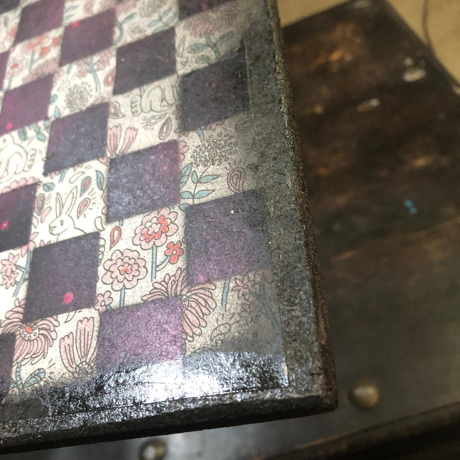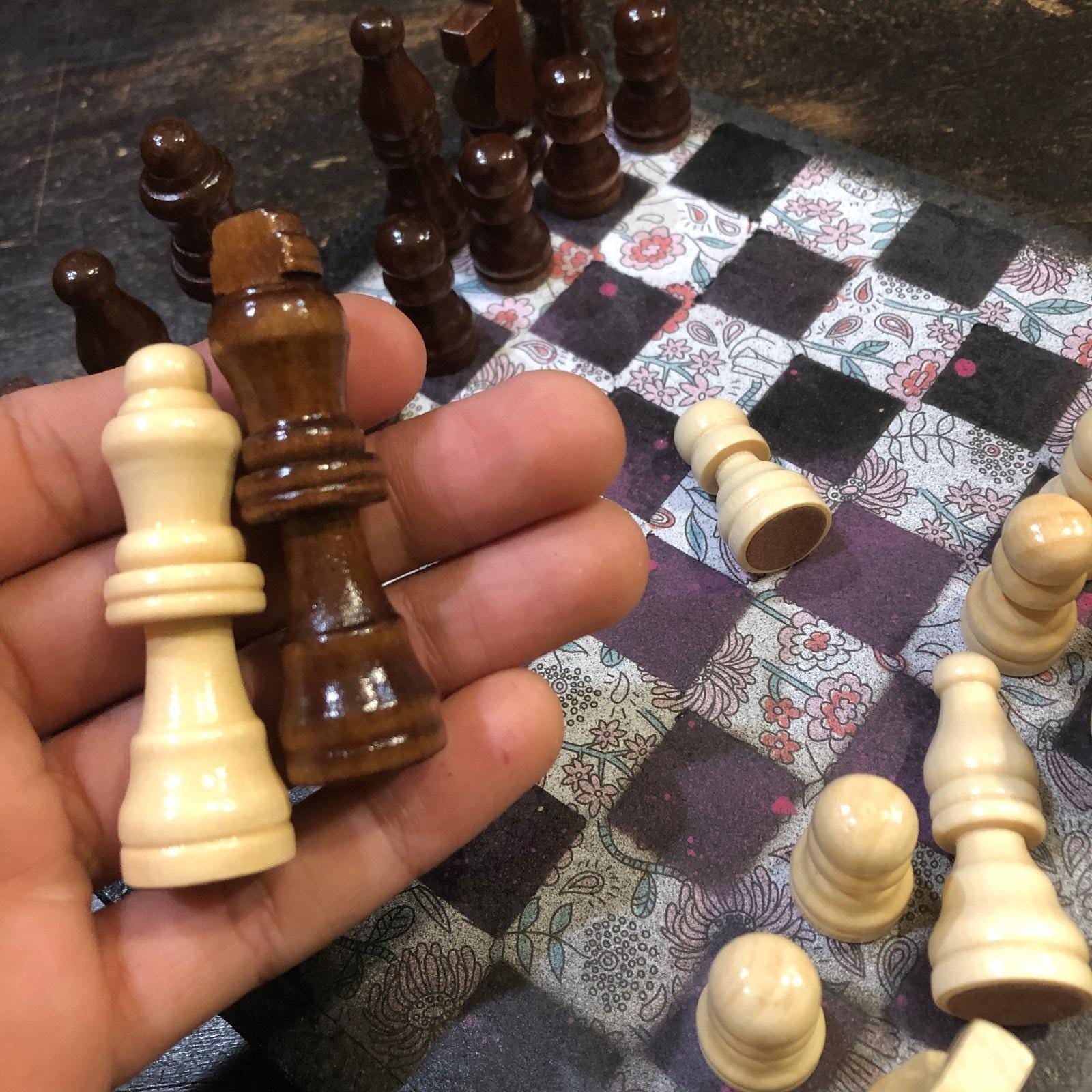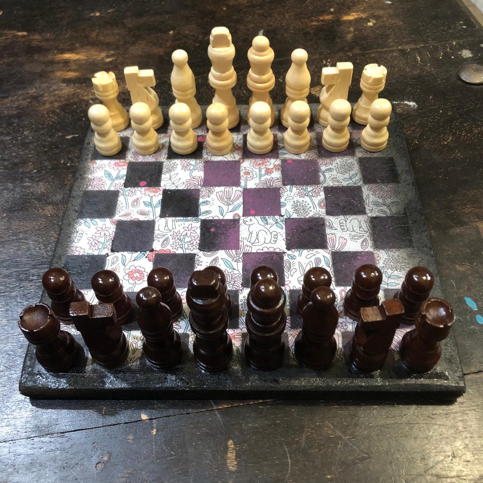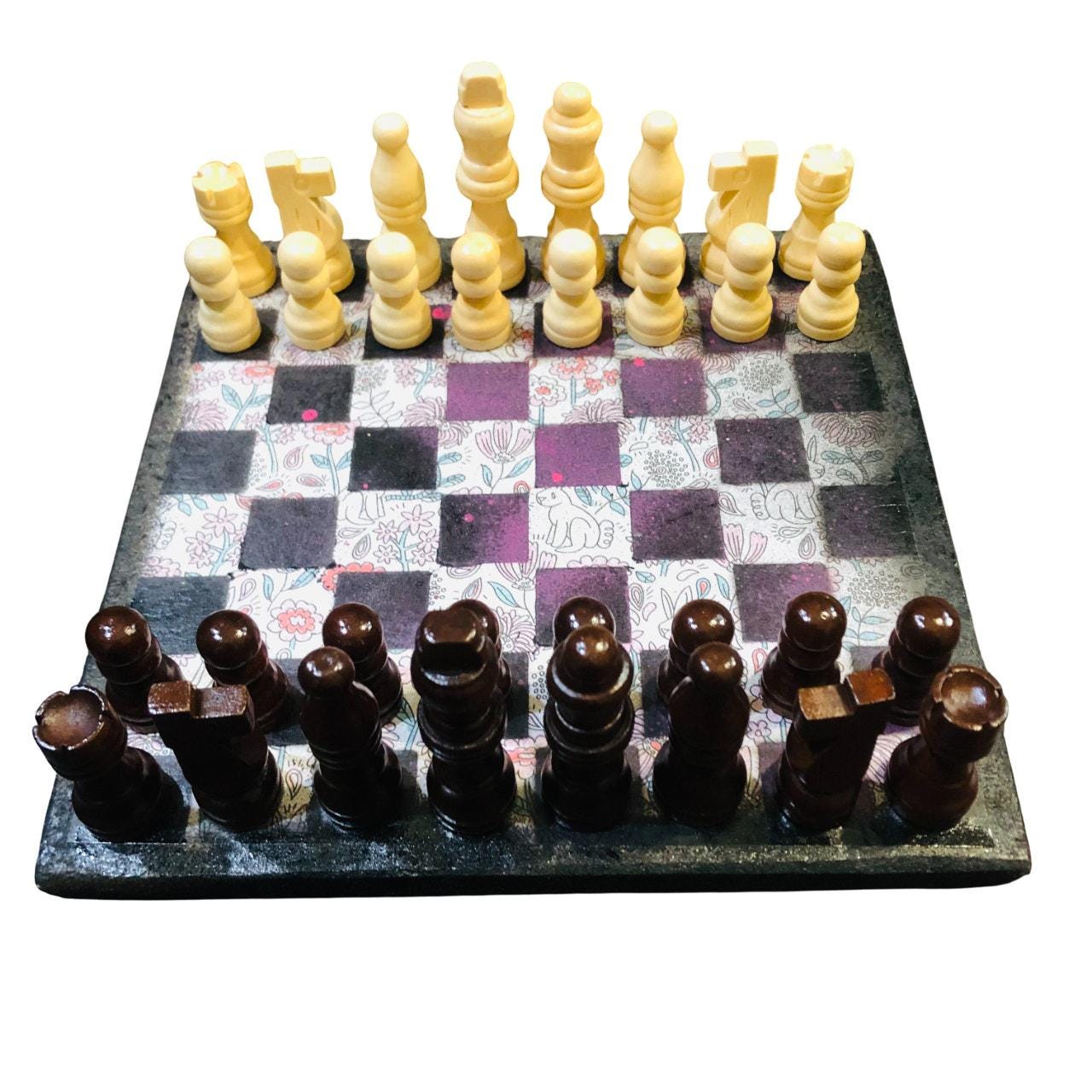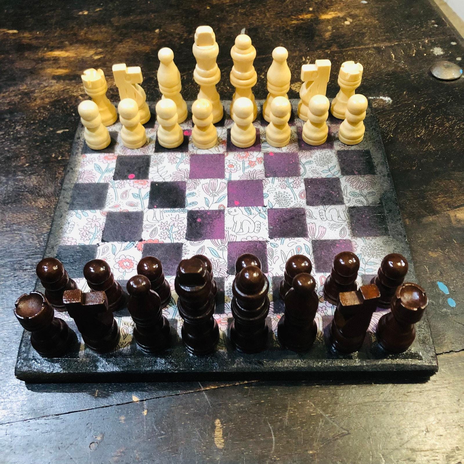 Introducing our exclusive Handcrafted Wooden Chess Set, meticulously designed with precision and care. Measuring 8 inches by 8 inches, this chess set features a beautifully painted particle board layered with a sheet of scrapbook paper board that doubles as a work of art. Each set is a unique, one-of-a-kind creation, crafted by hand to ensure that no two sets are alike. Elevate your gaming experience with this exceptional chess set that combines vibrant design with the touch of artisan craftsmanship. This chess board comes with chess pieces and is handcrafted as a one of one