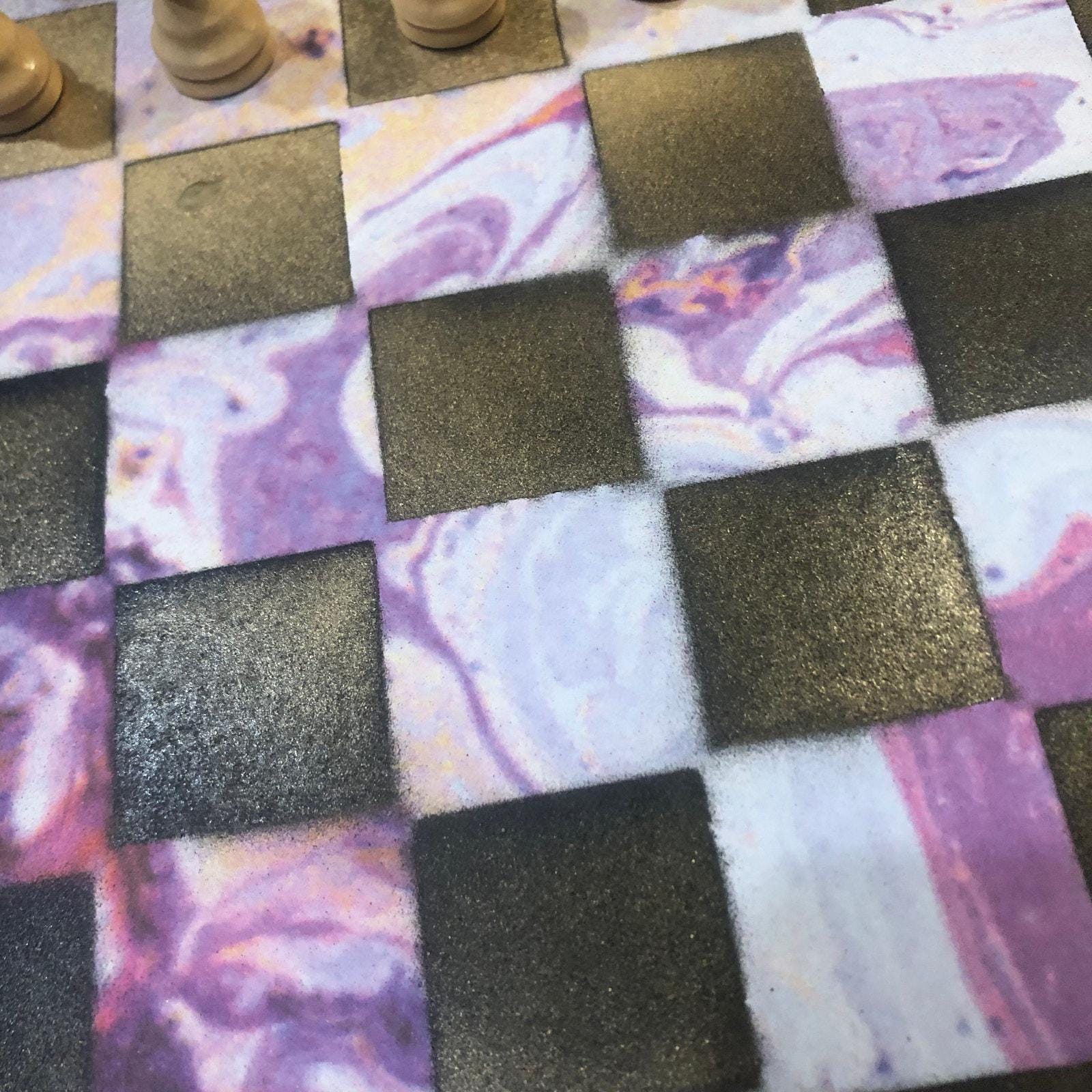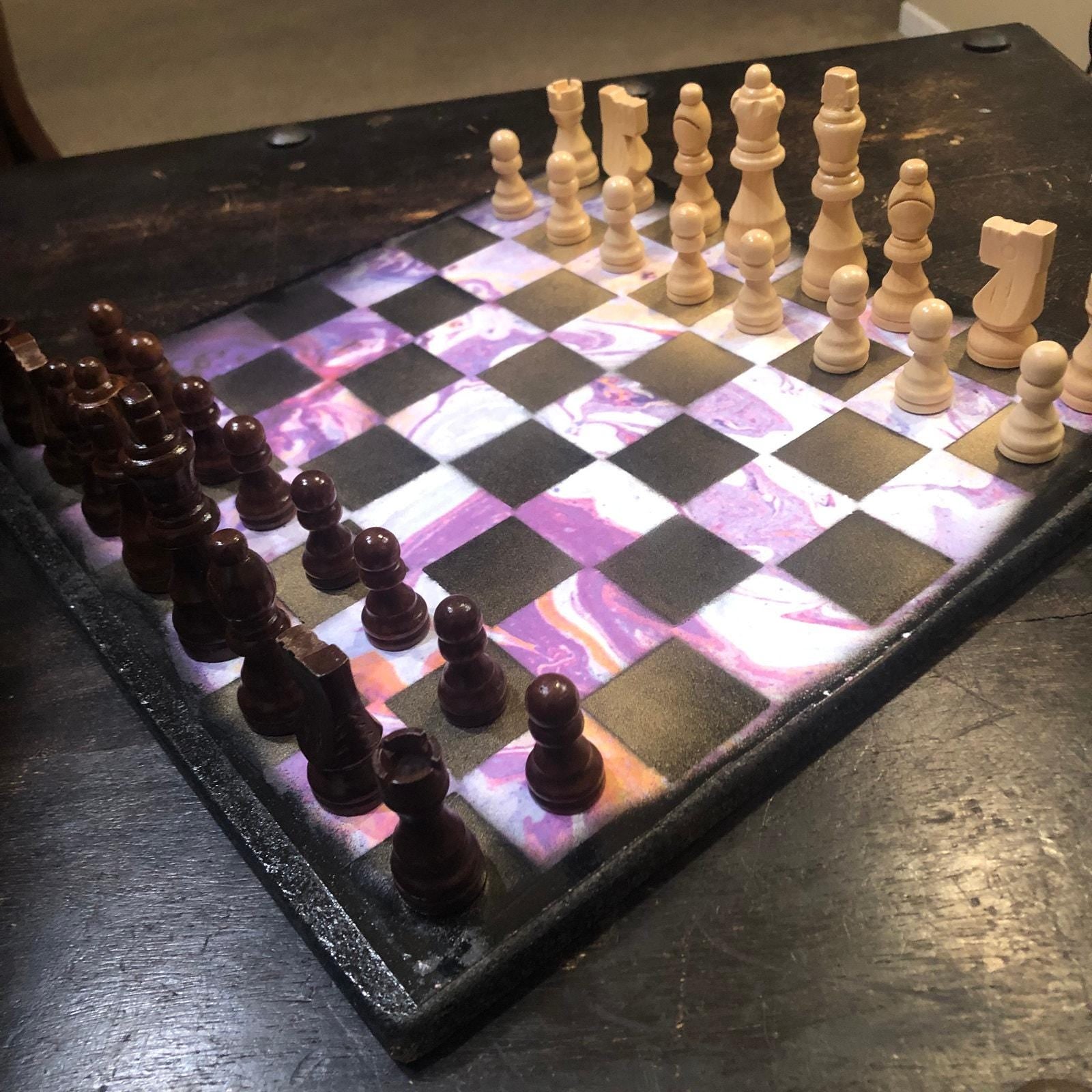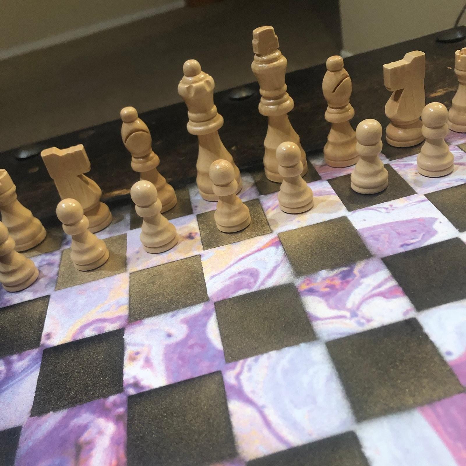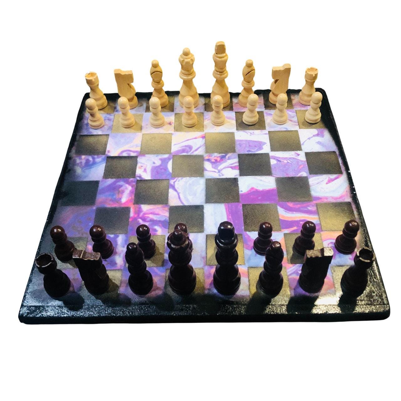 Introducing our exclusive Handcrafted Wooden Chess Set, meticulously designed with precision and care. Measuring 12 inches by 12 inches, this chess set features a beautifully painted particle board layered with a sheet of scrapbook paper board that doubles as a work of art. Each set is a unique, one-of-a-kind creation, crafted by hand to ensure that no two sets are alike. Elevate your gaming experience with this exceptional chess set that combines vibrant design with the touch of artisan craftsmanship. This chess board comes with chess pieces and is handcrafted as a one of one