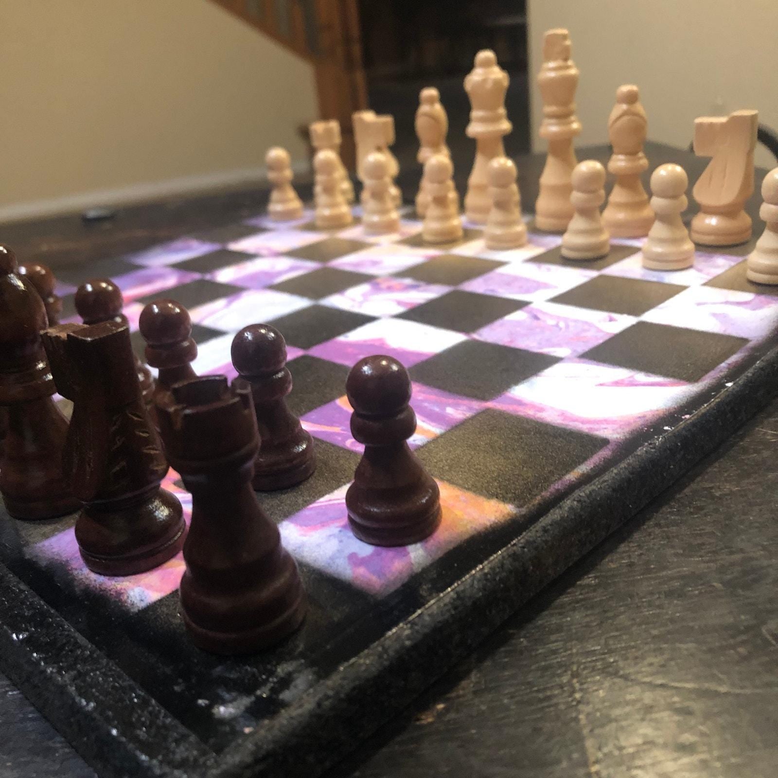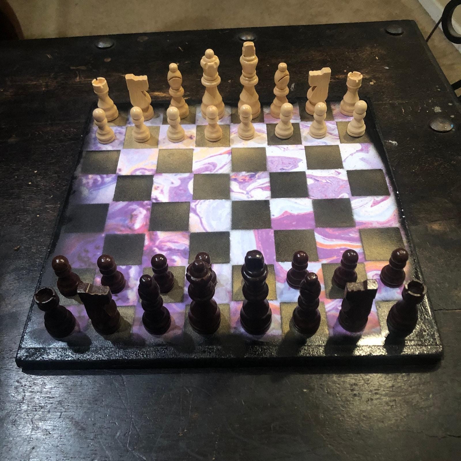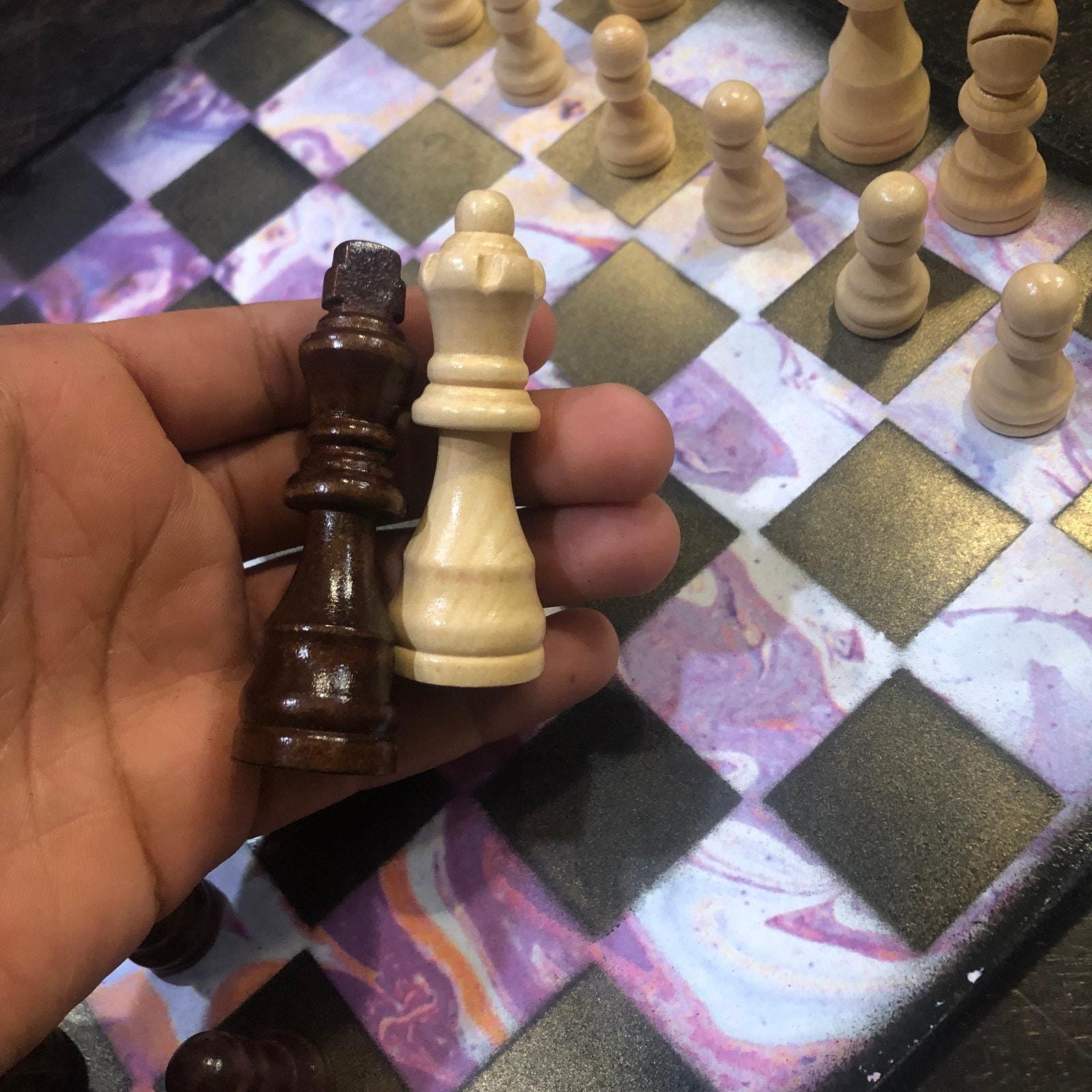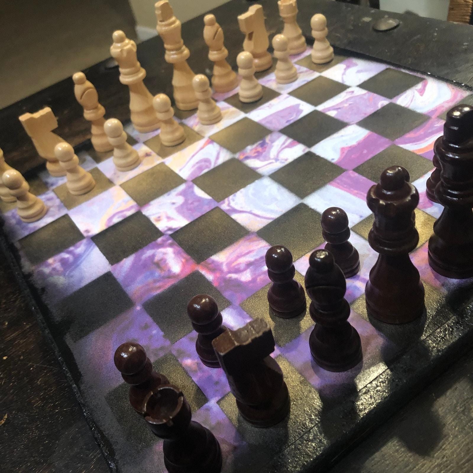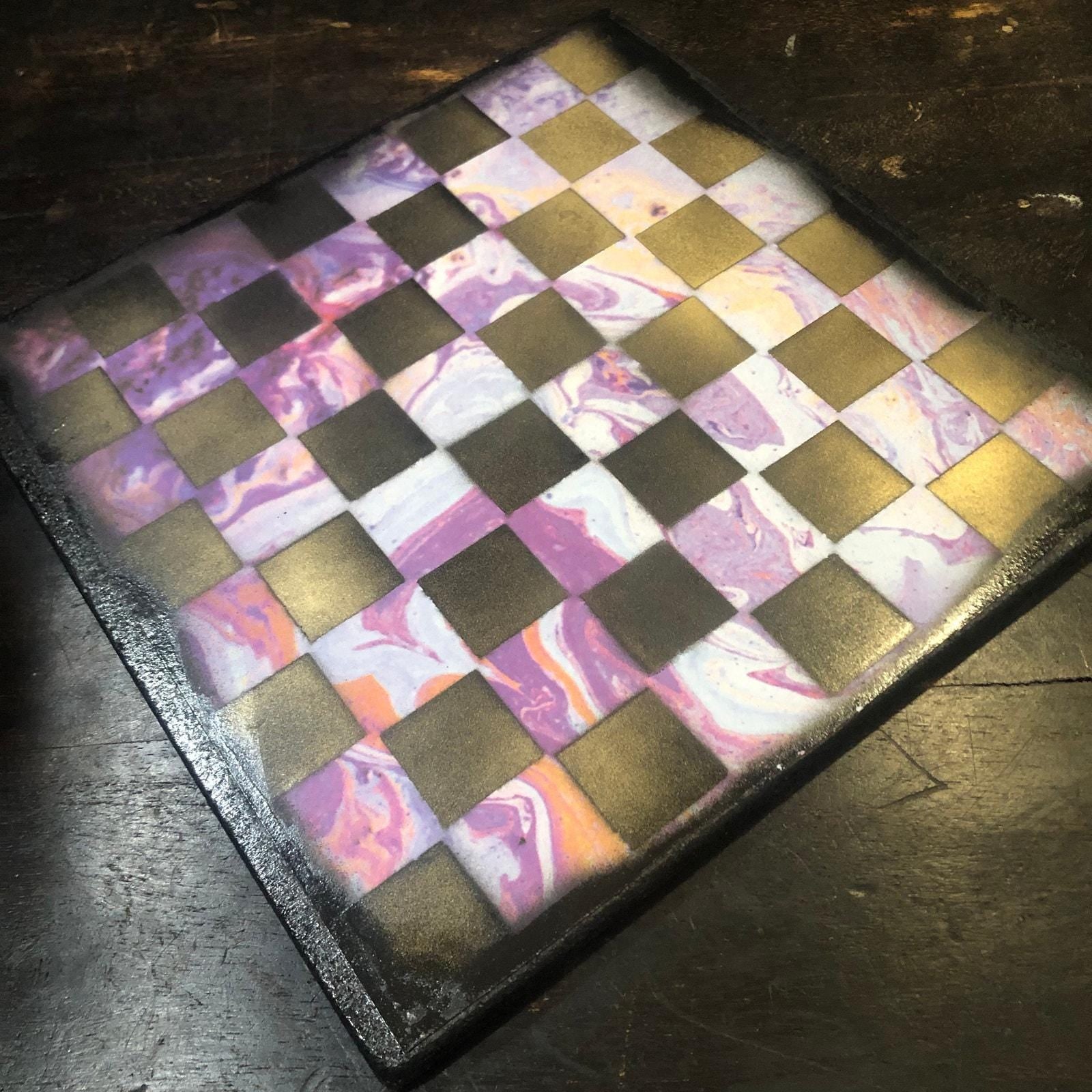 Introducing our exclusive Handcrafted Wooden Chess Set, meticulously designed with precision and care. Measuring 12 inches by 12 inches, this chess set features a beautifully painted particle board layered with a sheet of scrapbook paper board that doubles as a work of art. Each set is a unique, one-of-a-kind creation, crafted by hand to ensure that no two sets are alike. Elevate your gaming experience with this exceptional chess set that combines vibrant design with the touch of artisan craftsmanship. This chess board comes with chess pieces and is handcrafted as a one of one