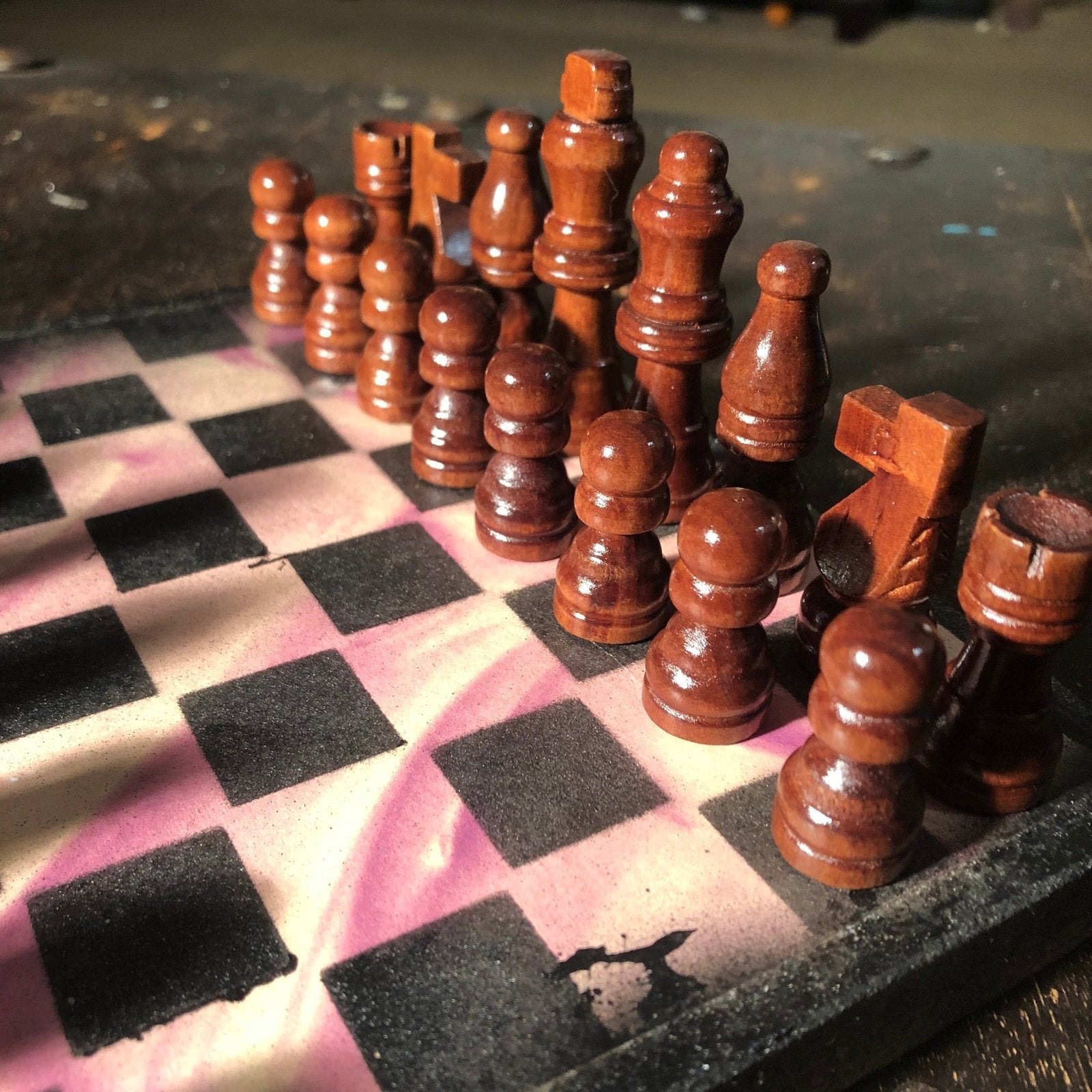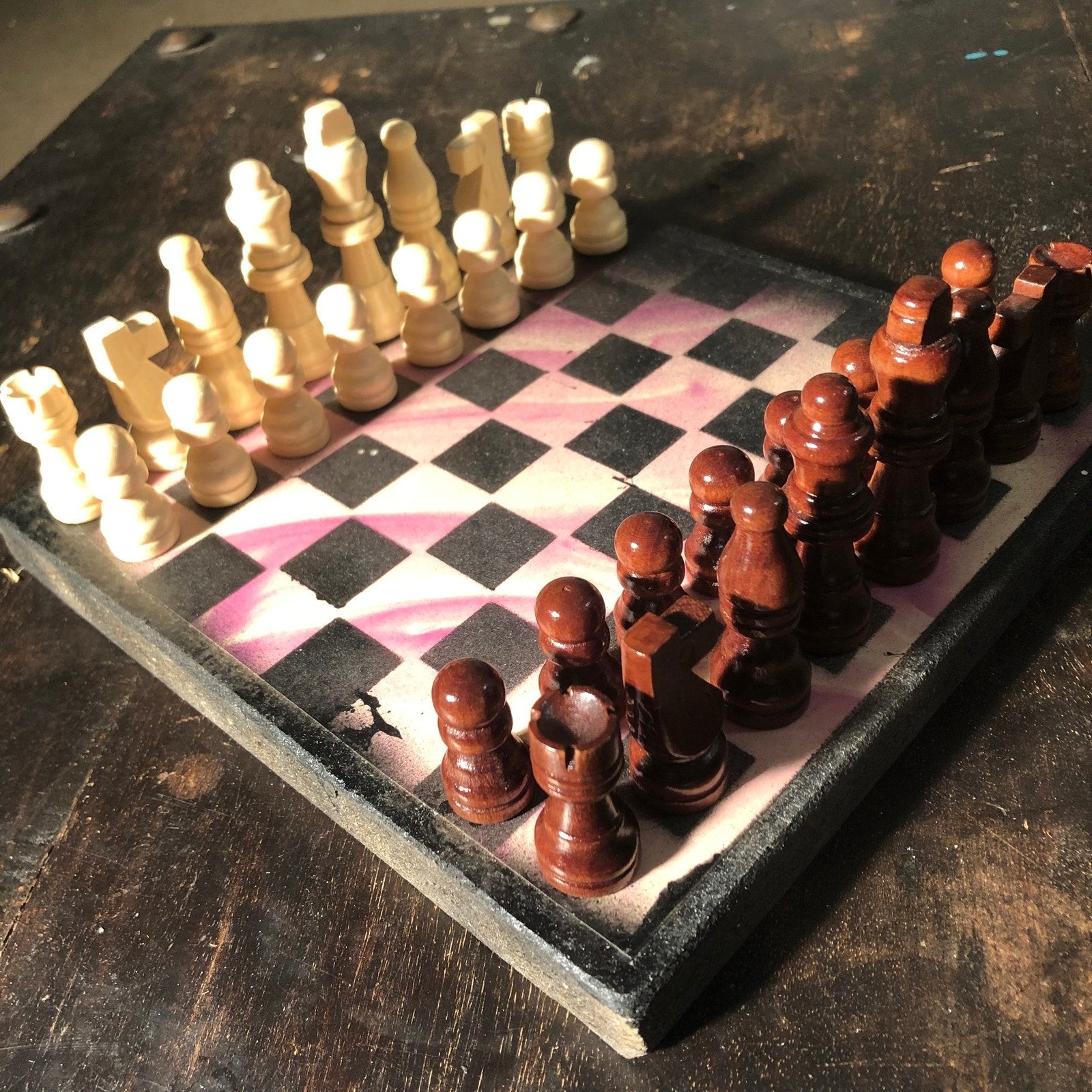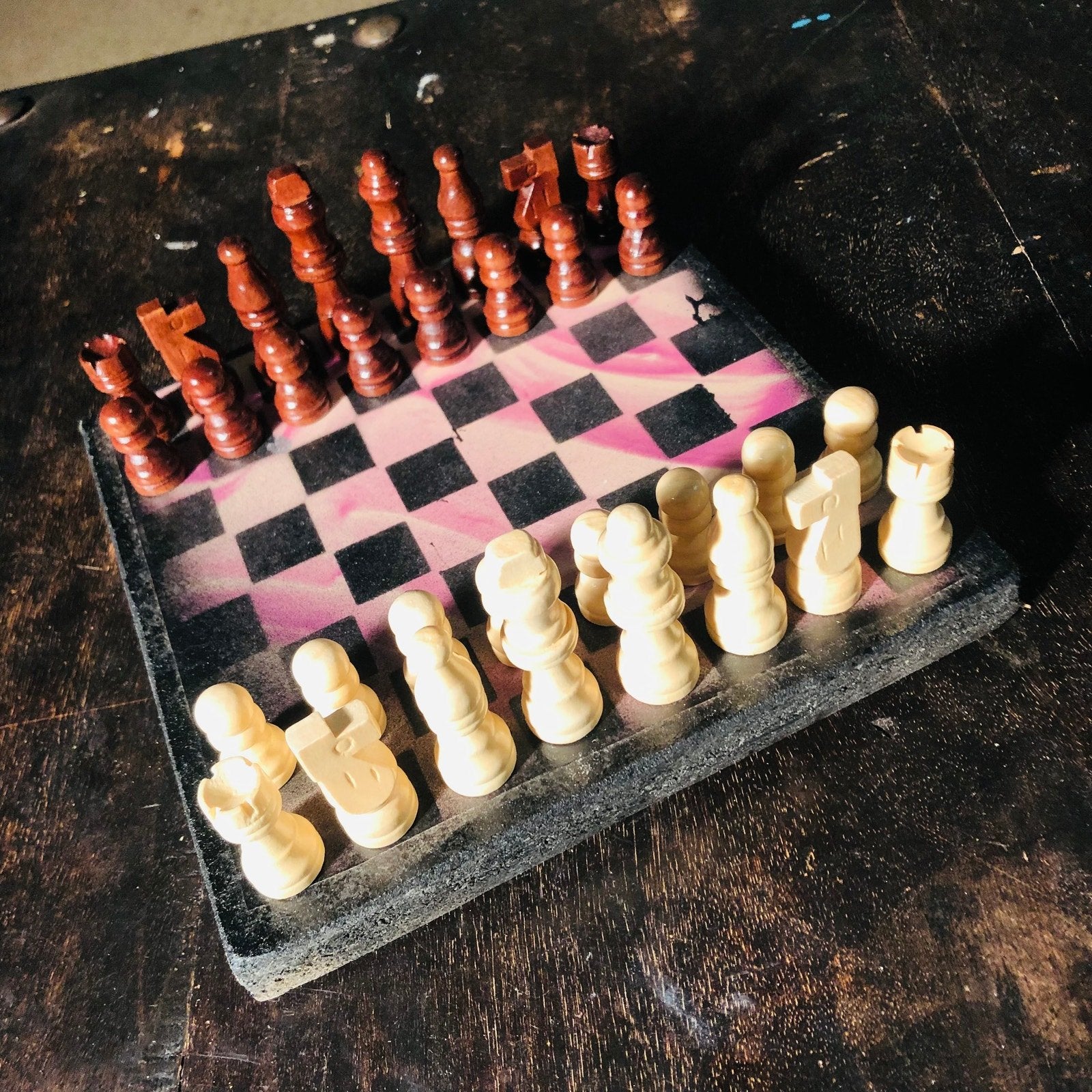 Introducing our exclusive Handcrafted Wooden Chess Set, meticulously designed with precision and care. Measuring 8 inches by 8 inches, this chess set features a beautifully painted particle board layered with a sheet of scrapbook paper board that doubles as a work of art. Each set is a unique, one-of-a-kind creation, crafted by hand to ensure that no two sets are alike. Elevate your gaming experience with this exceptional chess set that combines vibrant design with the touch of artisan craftsmanship. This chess board comes with chess pieces and is handcrafted as a one of one