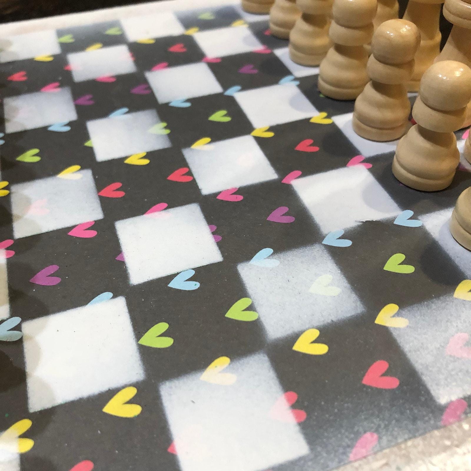 Introducing our exclusive Handcrafted Wooden Chess Set, meticulously designed with precision and care. Measuring 8 inches by 8 inches, this chess set features a beautifully painted particle board layered with a sheet of scrapbook paper board that doubles as a work of art. Each set is a unique, one-of-a-kind creation, crafted by hand to ensure that no two sets are alike. Elevate your gaming experience with this exceptional chess set that combines vibrant design with the touch of artisan craftsmanship. This chess board comes with chess pieces and is handcrafted as a one of one