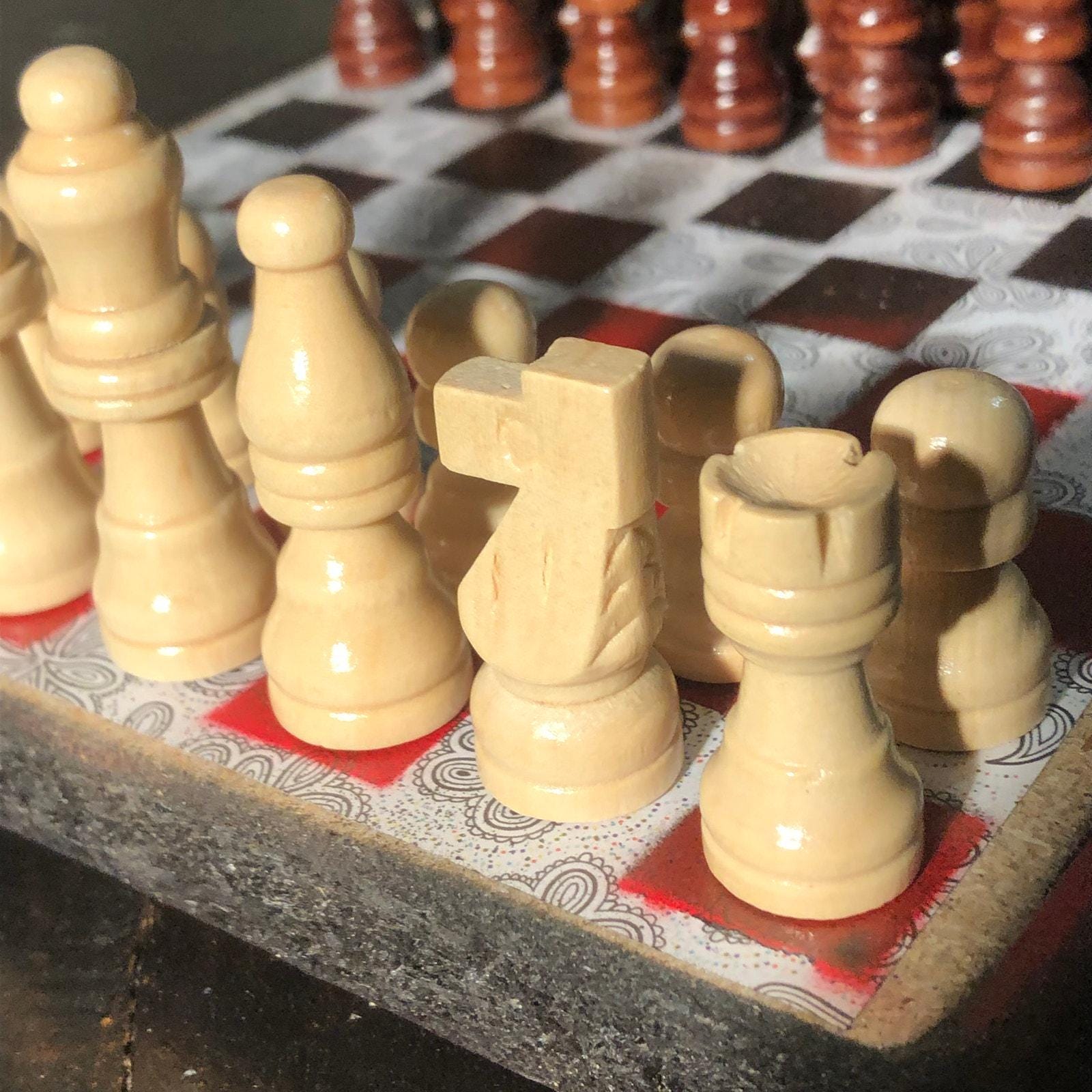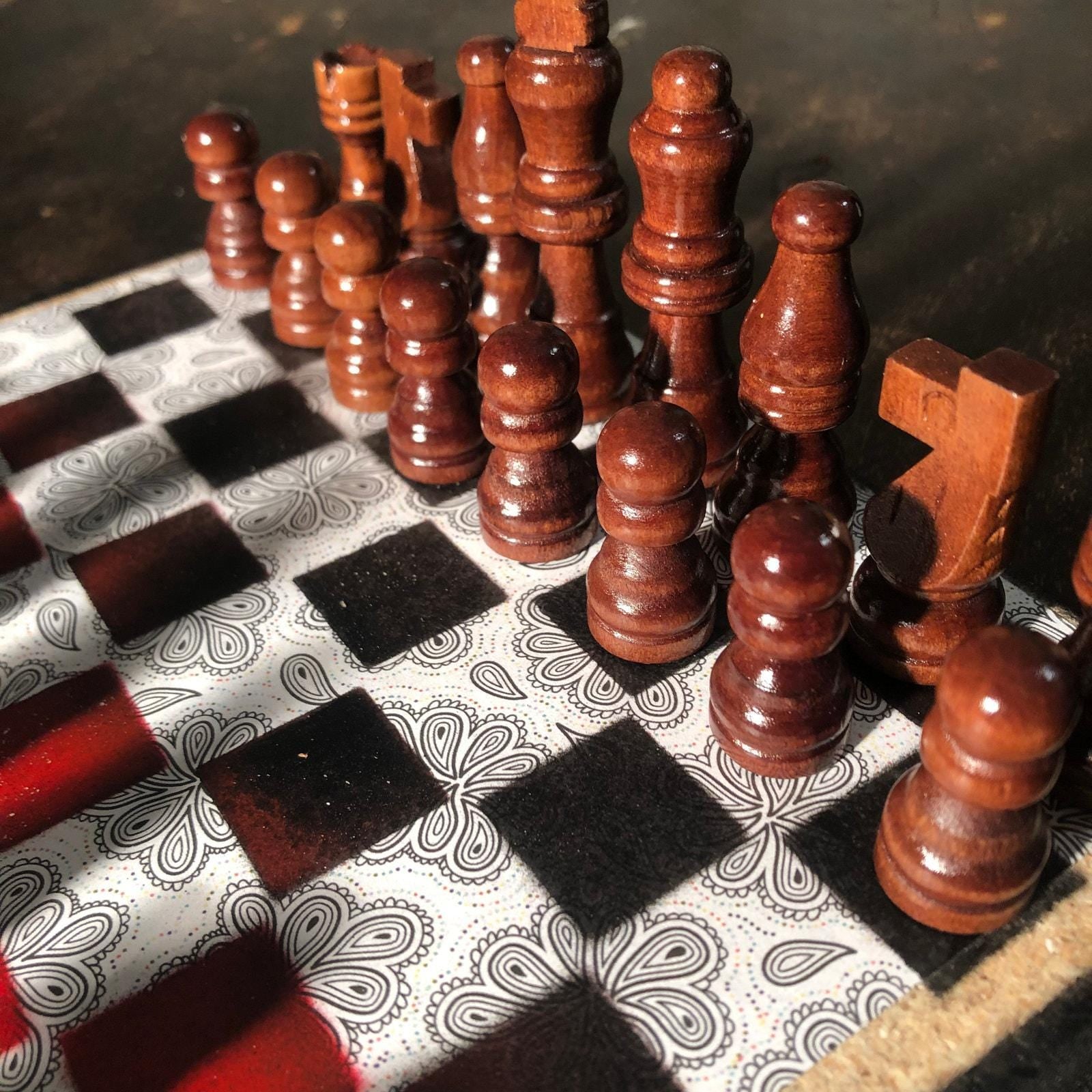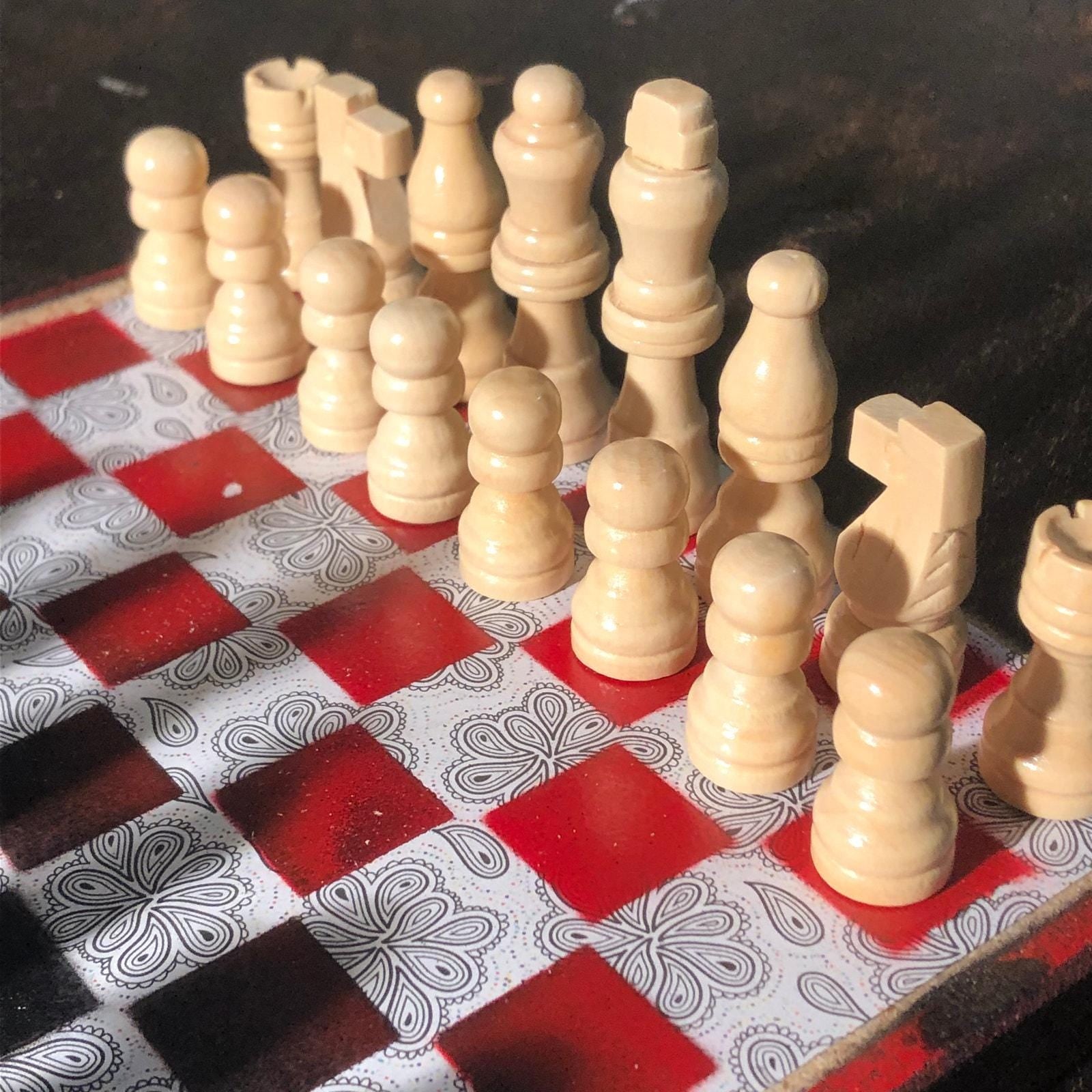 Introducing our exclusive Handcrafted Wooden Chess Set, meticulously designed with precision and care. Measuring 8 inches by 8 inches, this chess set features a beautifully painted particle board layered with a sheet of scrapbook paper board that doubles as a work of art. Each set is a unique, one-of-a-kind creation, crafted by hand to ensure that no two sets are alike. Elevate your gaming experience with this exceptional chess set that combines vibrant design with the touch of artisan craftsmanship. This chess board comes with chess pieces and is handcrafted as a one of one