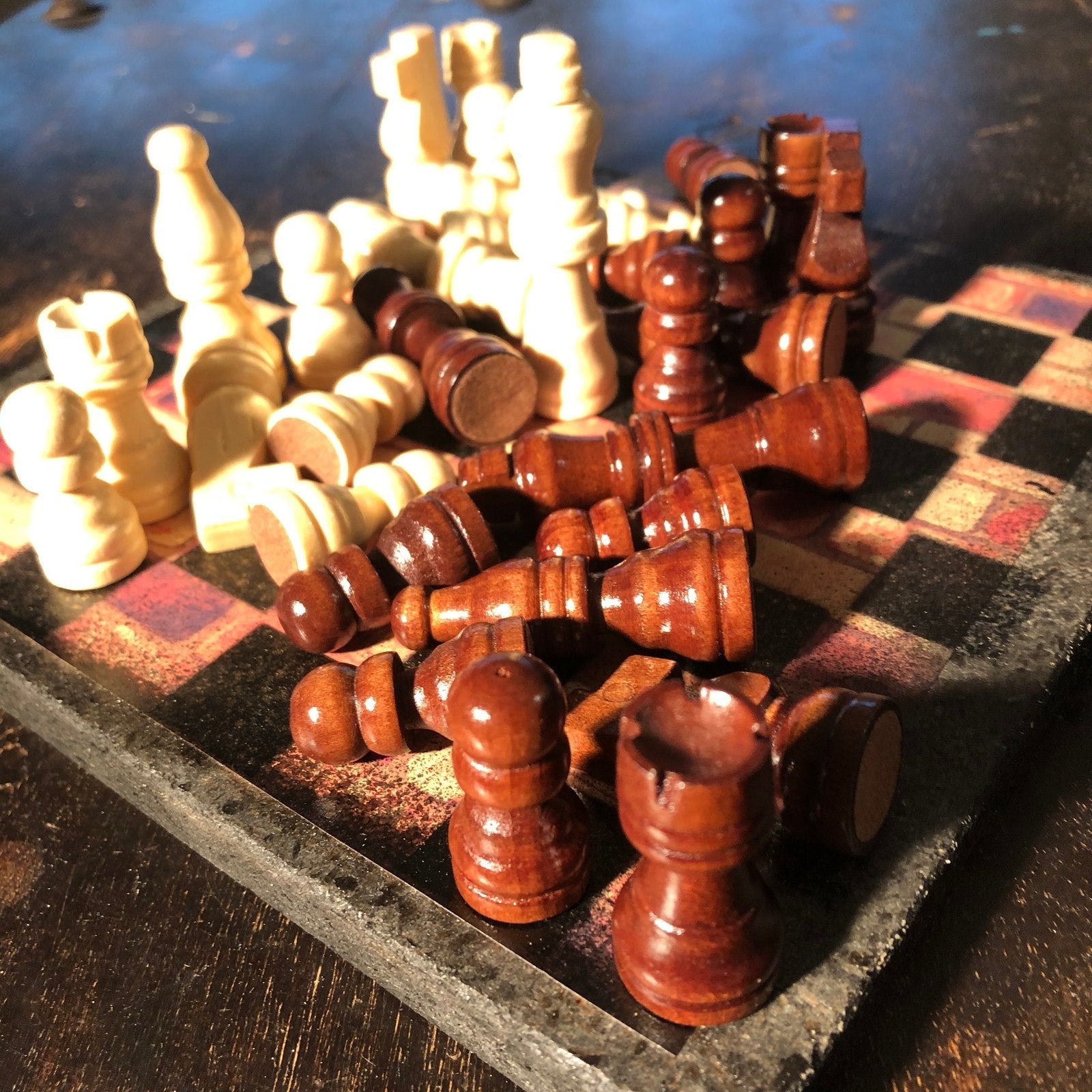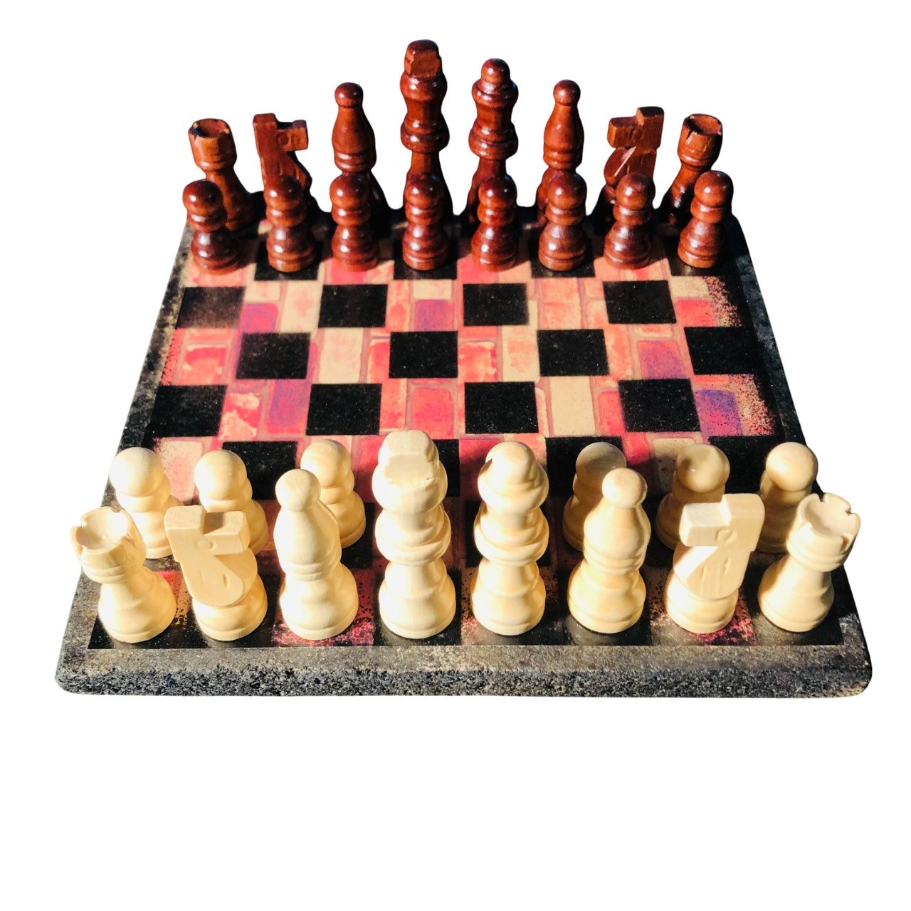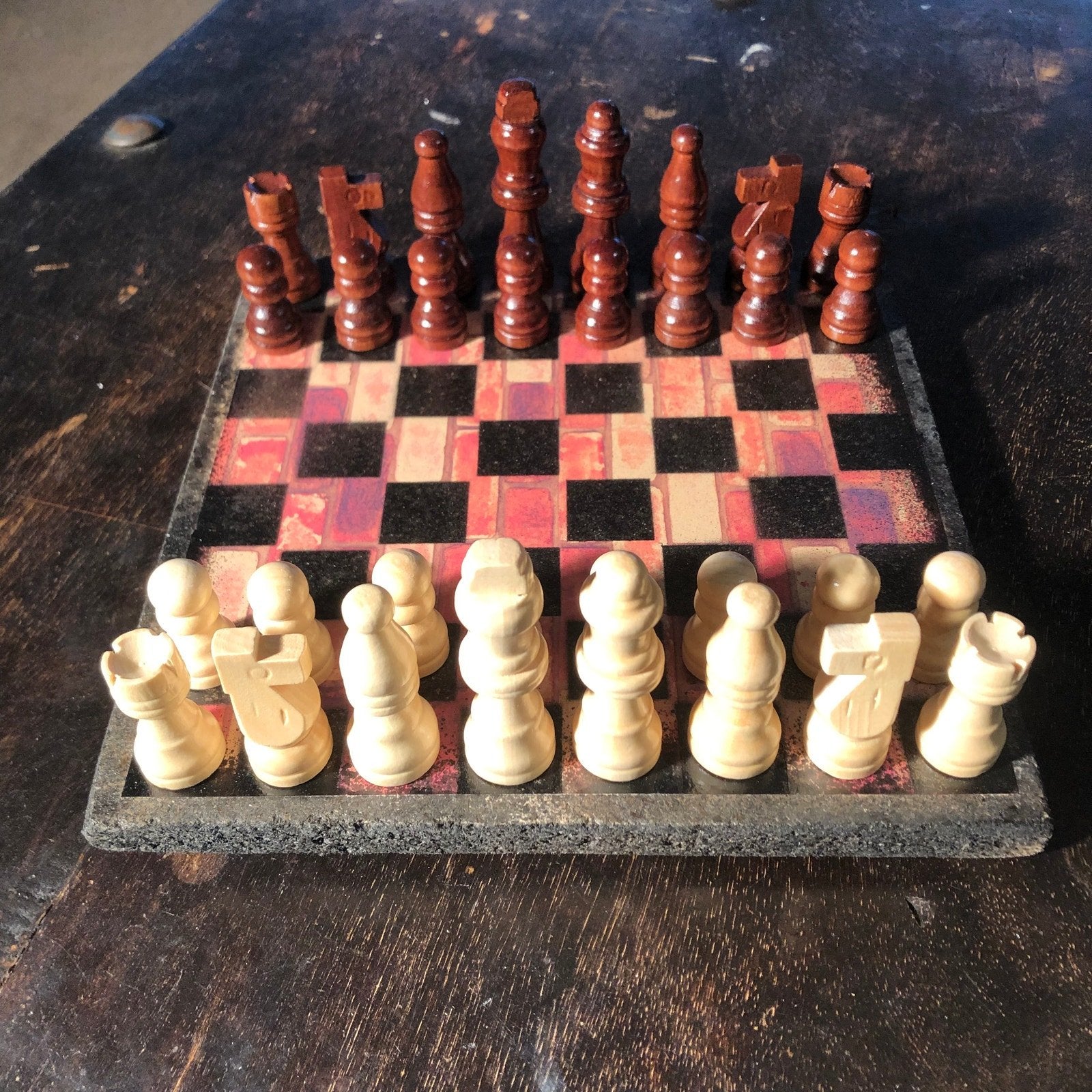 Introducing our exclusive Handcrafted Wooden Chess Set, meticulously designed with precision and care. Measuring 8 inches by 8 inches, this chess set features a beautifully painted particle board layered with a sheet of scrapbook paper board that doubles as a work of art. Each set is a unique, one-of-a-kind creation, crafted by hand to ensure that no two sets are alike. Elevate your gaming experience with this exceptional chess set that combines vibrant design with the touch of artisan craftsmanship. This chess board comes with chess pieces and is handcrafted as a one of one