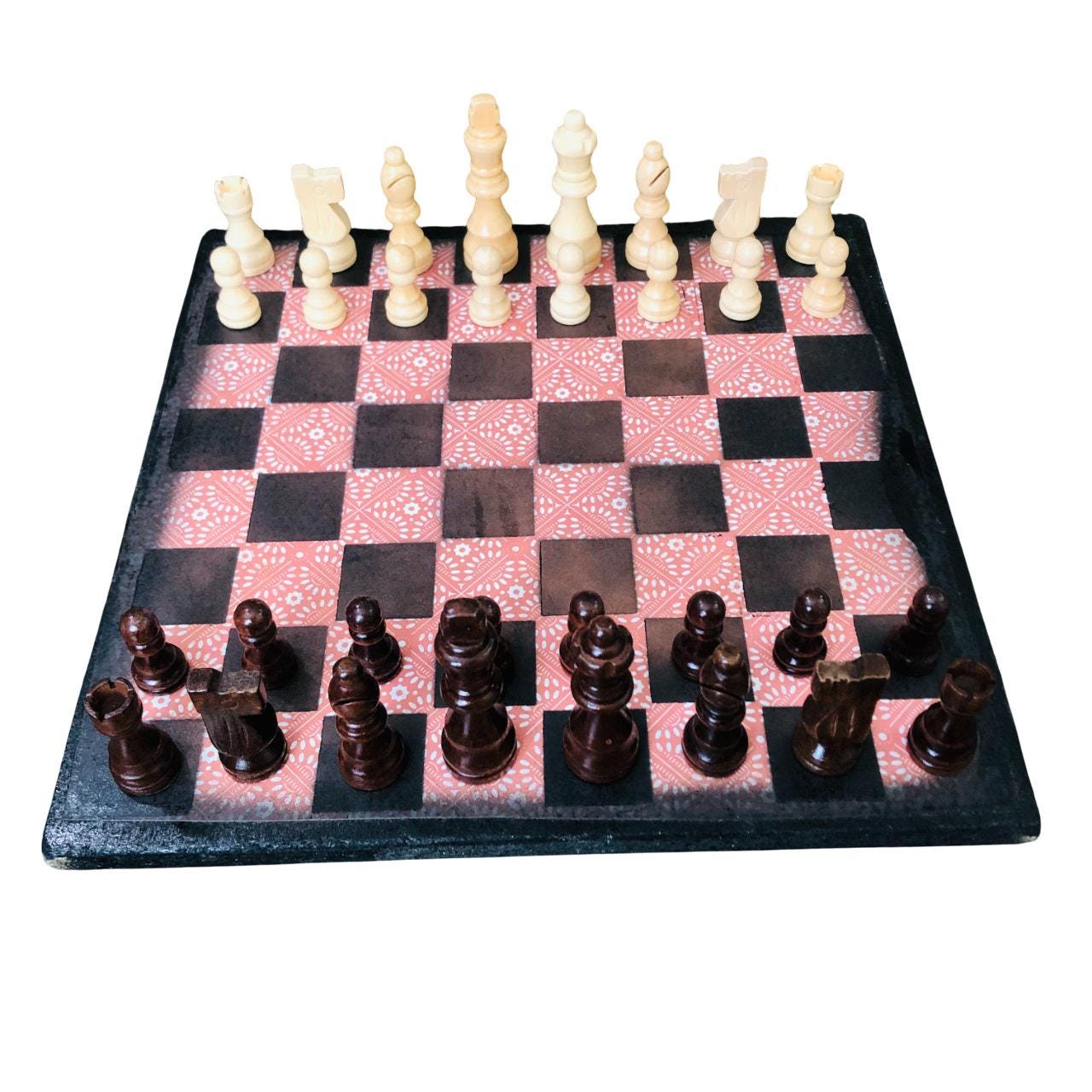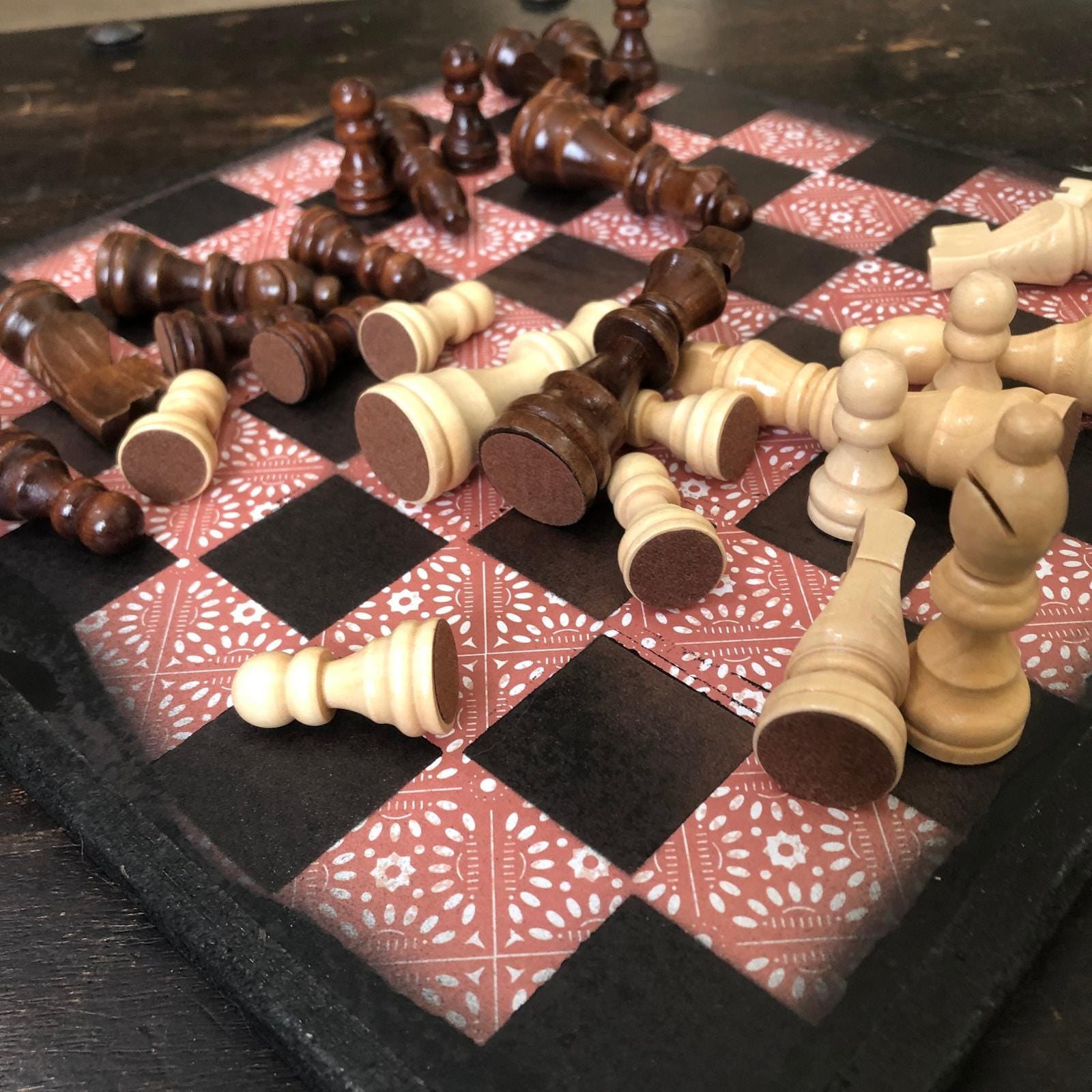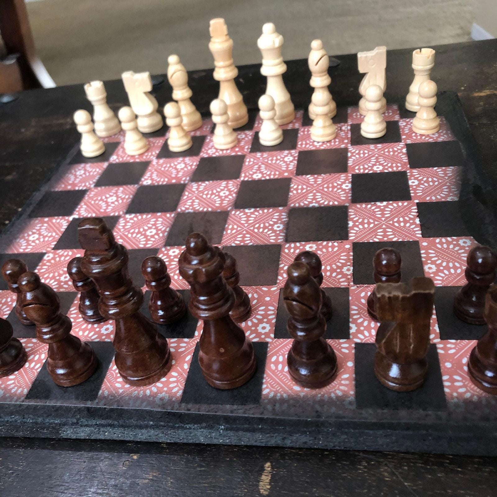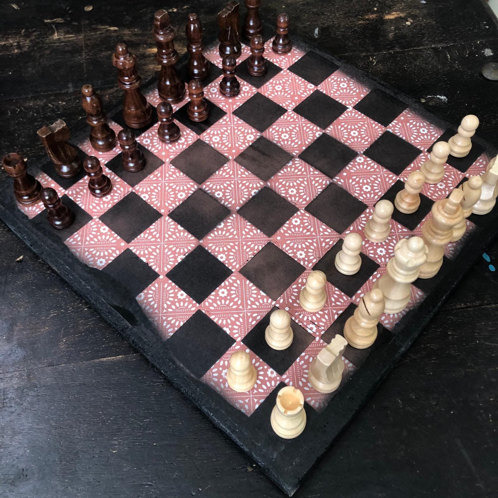 Introducing our exclusive Handcrafted Wooden Chess Set, meticulously designed with precision and care. Measuring 12 inches by 12 inches, this chess set features a beautifully painted particle board layered with a sheet of scrapbook paper board that doubles as a work of art. Each set is a unique, one-of-a-kind creation, crafted by hand to ensure that no two sets are alike. Elevate your gaming experience with this exceptional chess set that combines vibrant design with the touch of artisan craftsmanship. This chess board comes with chess pieces and is handcrafted as a one of one