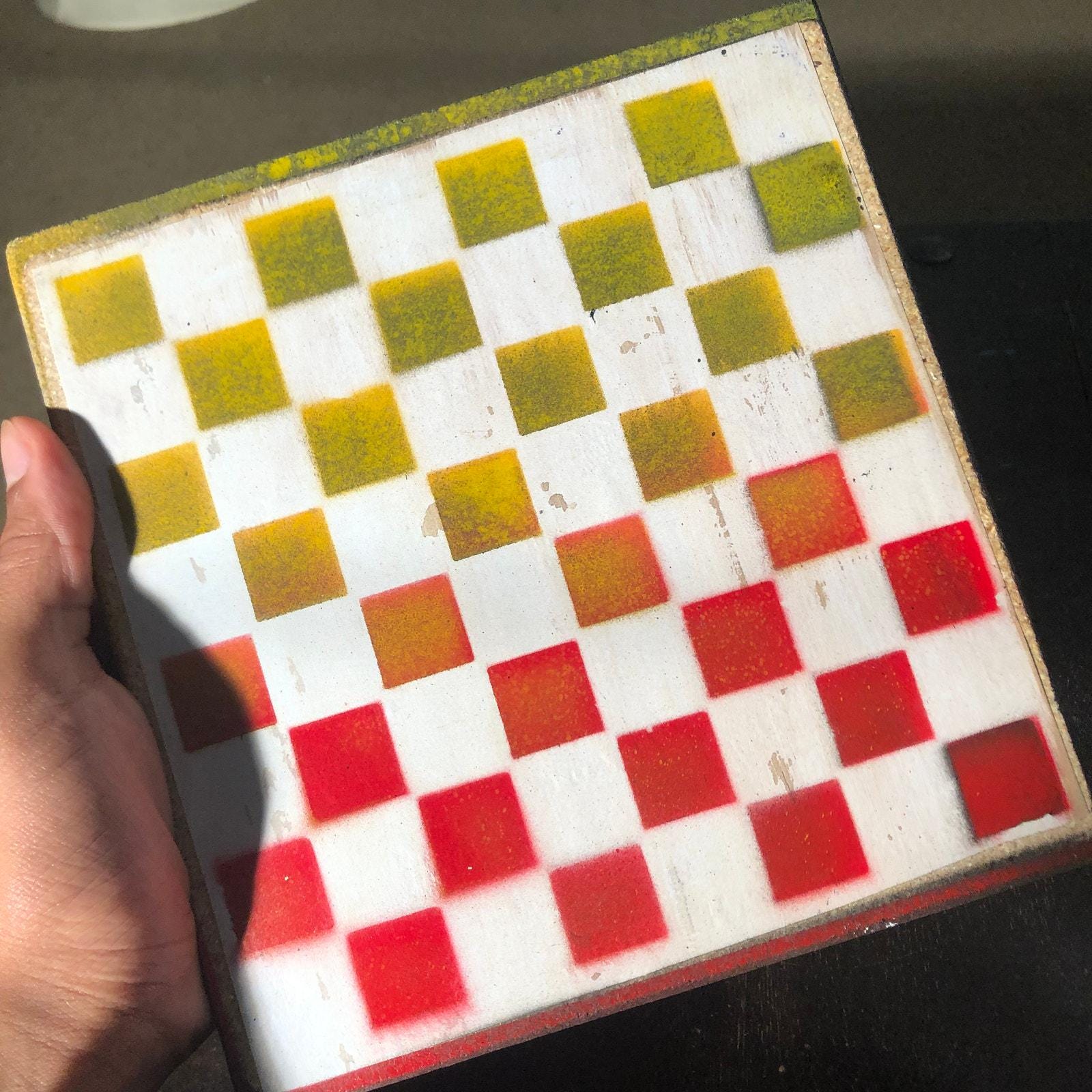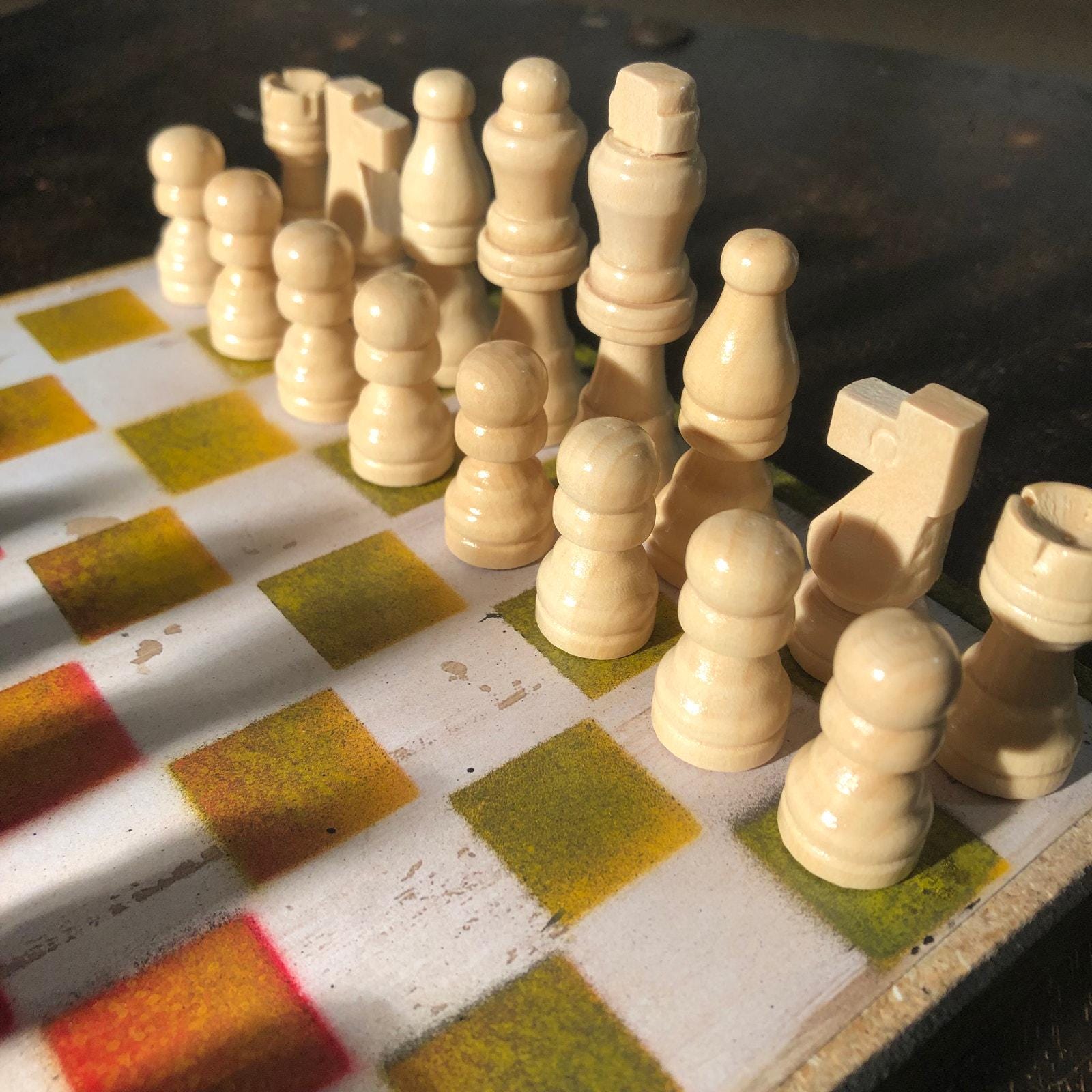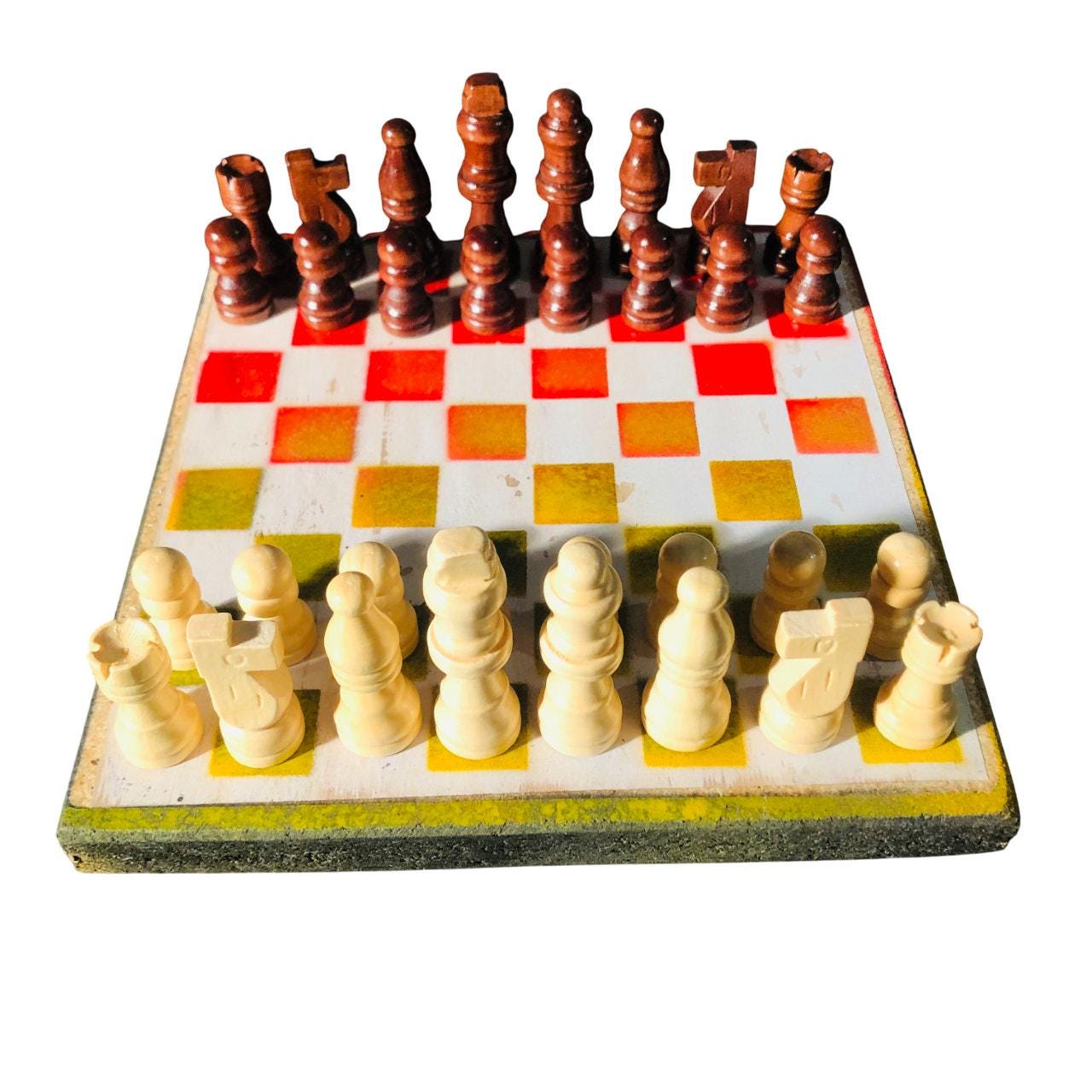 Introducing our exclusive Handcrafted Wooden Chess Set, meticulously designed with precision and care. Measuring 8 inches by 8 inches, this chess set features a beautifully painted particle board layered with a sheet of scrapbook paper board that doubles as a work of art. Each set is a unique, one-of-a-kind creation, crafted by hand to ensure that no two sets are alike. Elevate your gaming experience with this exceptional chess set that combines vibrant design with the touch of artisan craftsmanship. This chess board comes with chess pieces and is handcrafted as a one of one