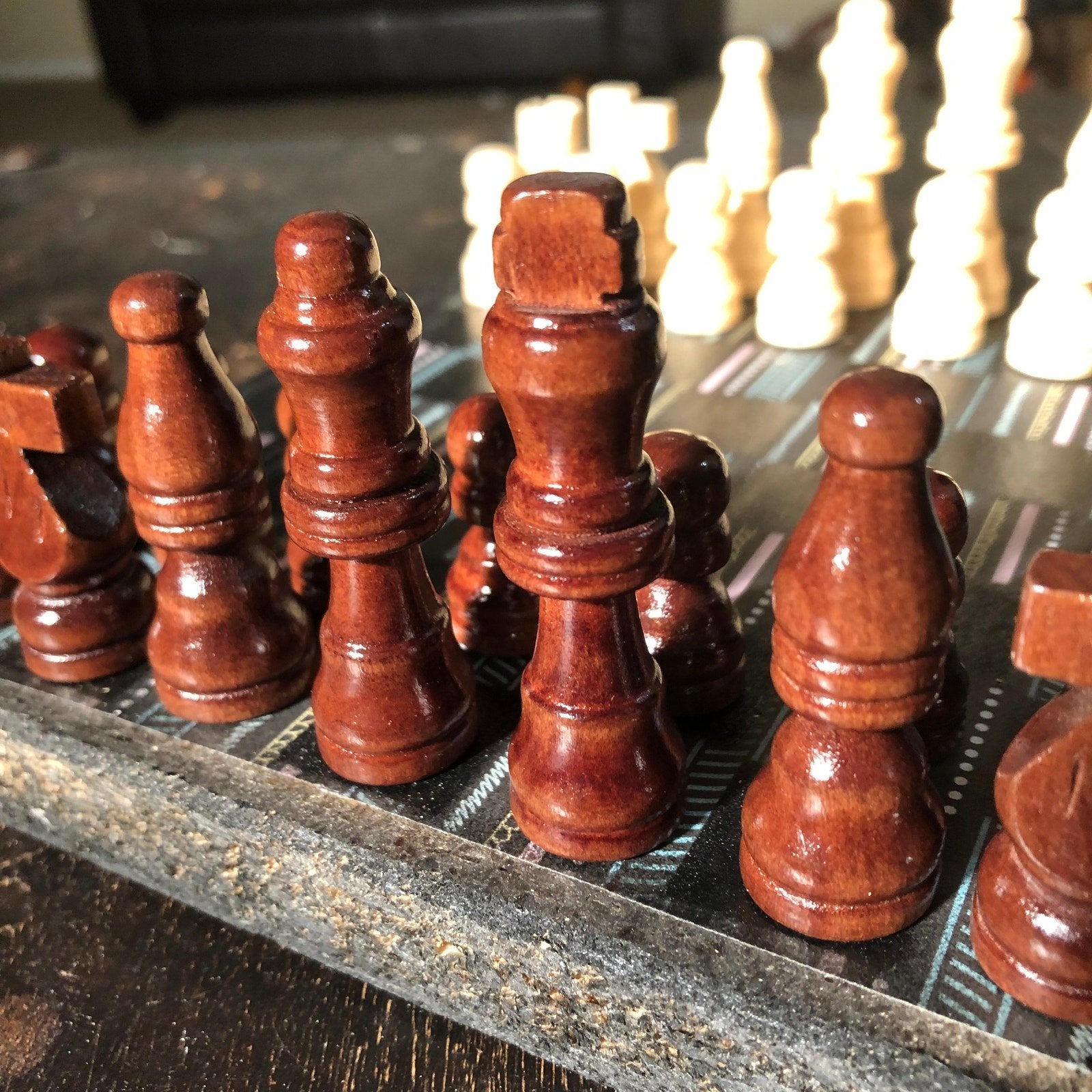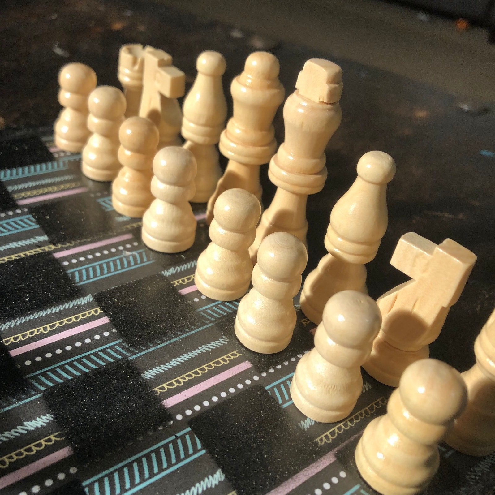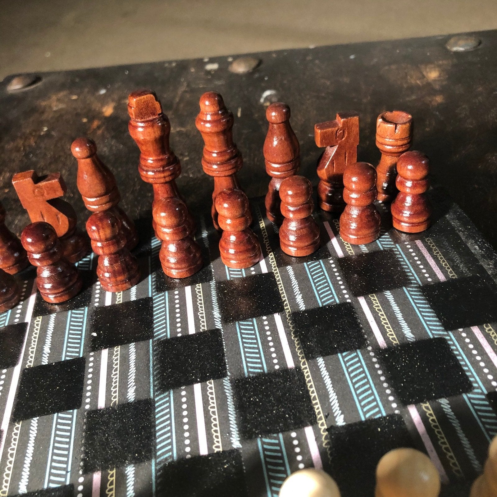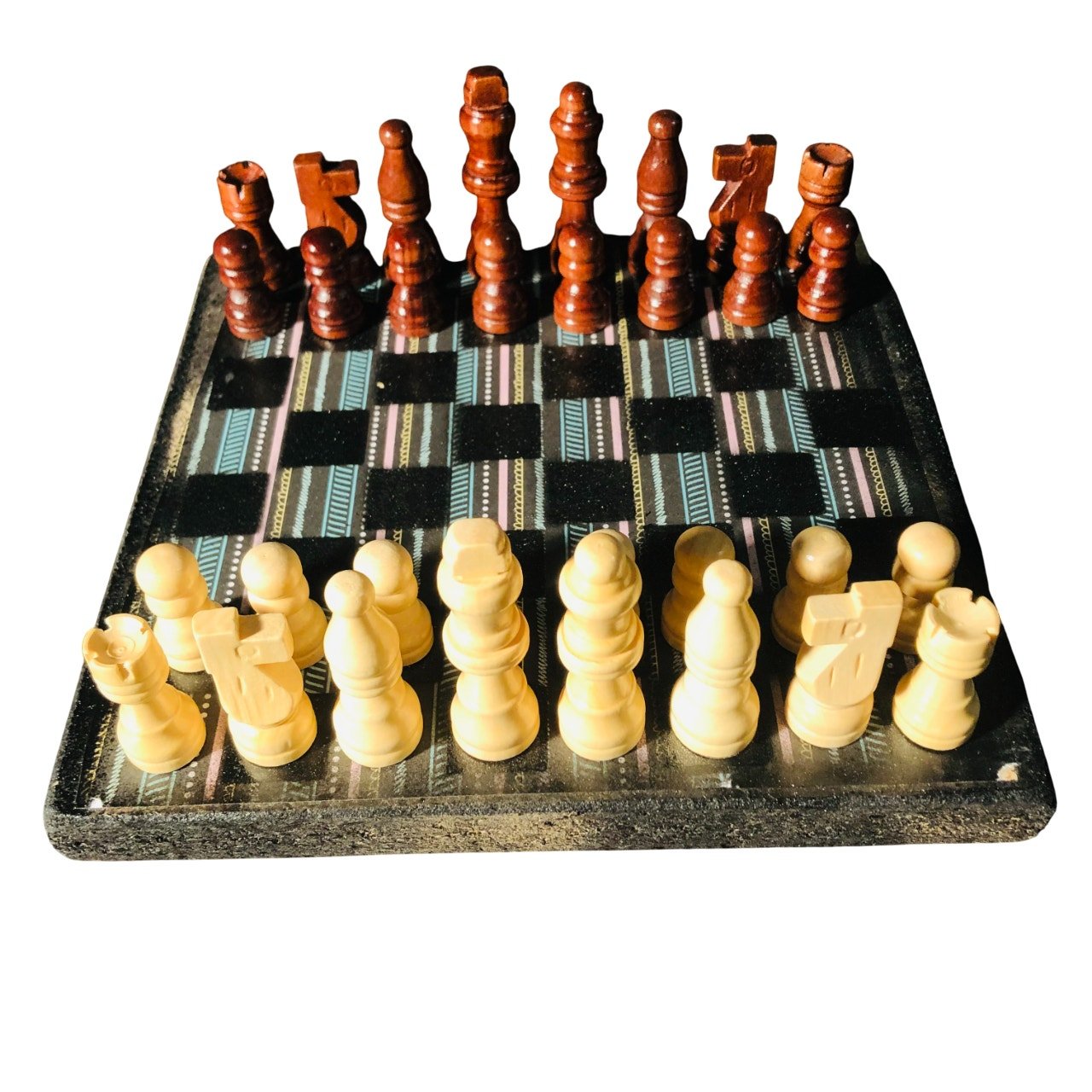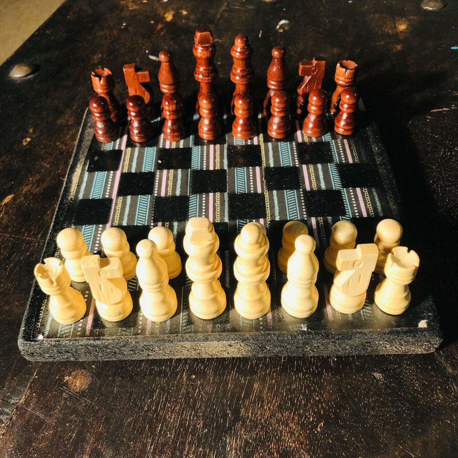 Introducing our exclusive Handcrafted Wooden Chess Set, meticulously designed with precision and care. Measuring 8 inches by 8 inches, this chess set features a beautifully painted particle board layered with a sheet of scrapbook paper board that doubles as a work of art. Each set is a unique, one-of-a-kind creation, crafted by hand to ensure that no two sets are alike. Elevate your gaming experience with this exceptional chess set that combines vibrant design with the touch of artisan craftsmanship. This chess board comes with chess pieces and is handcrafted as a one of one