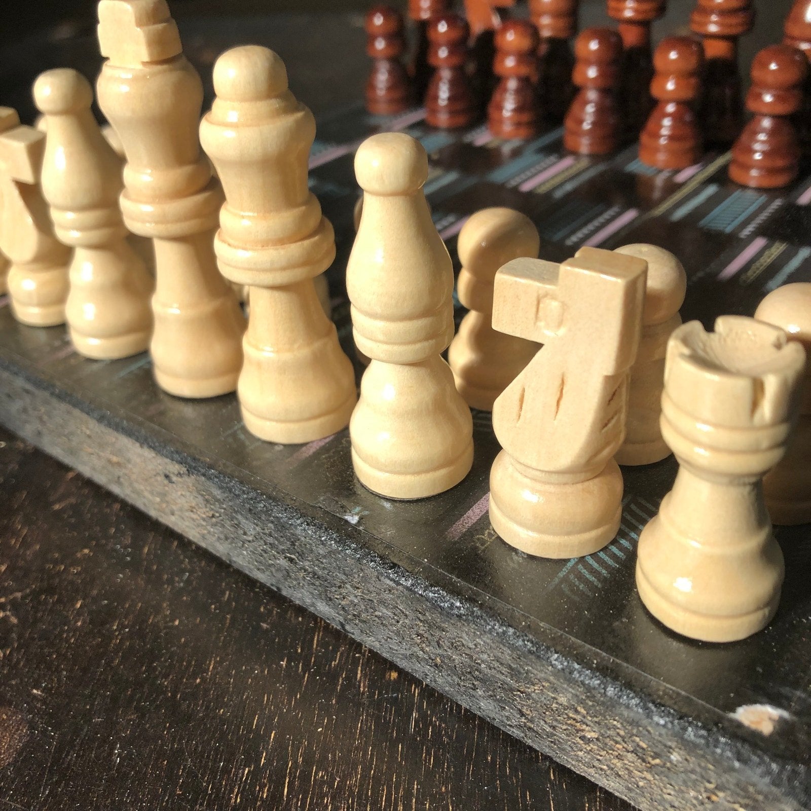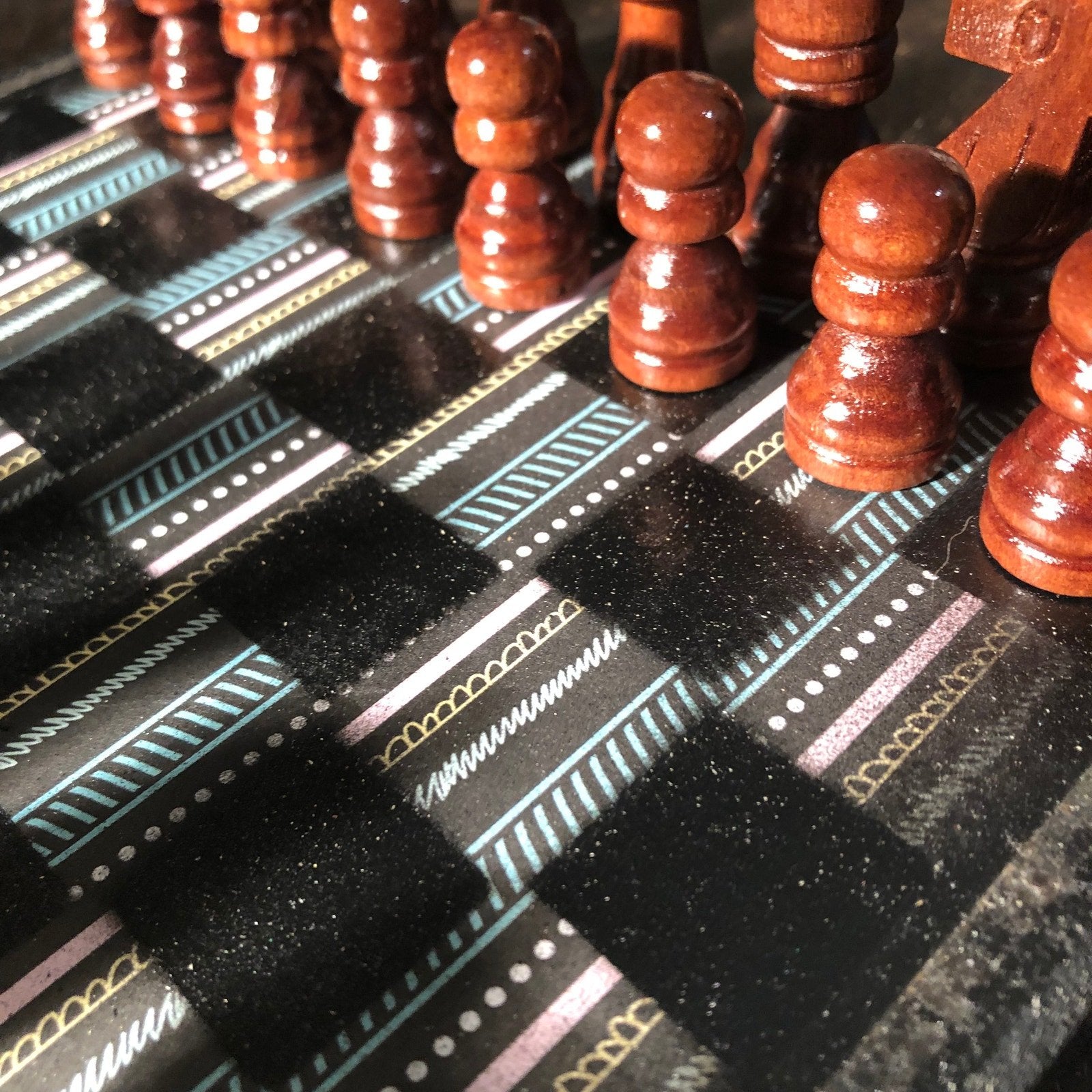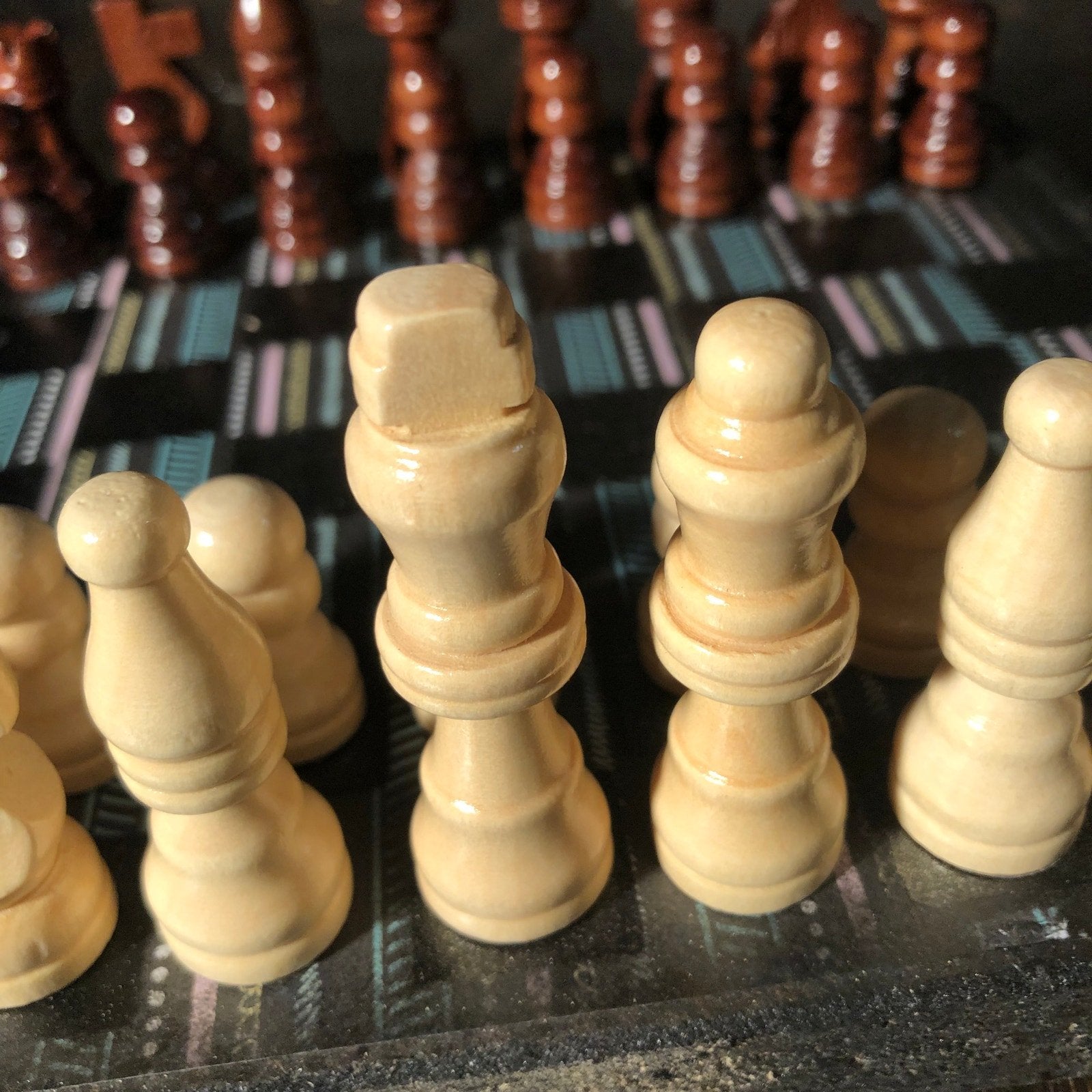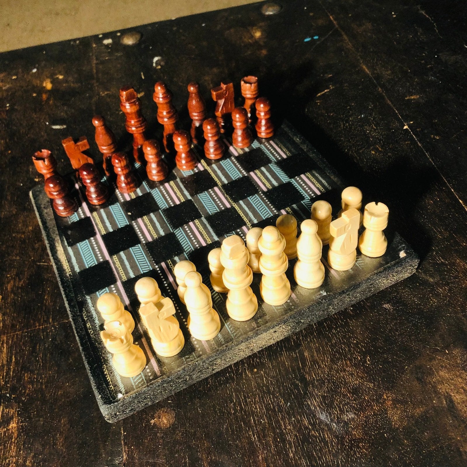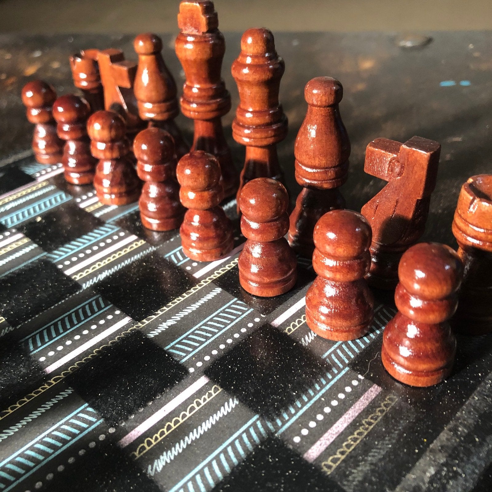 Introducing our exclusive Handcrafted Wooden Chess Set, meticulously designed with precision and care. Measuring 8 inches by 8 inches, this chess set features a beautifully painted particle board layered with a sheet of scrapbook paper board that doubles as a work of art. Each set is a unique, one-of-a-kind creation, crafted by hand to ensure that no two sets are alike. Elevate your gaming experience with this exceptional chess set that combines vibrant design with the touch of artisan craftsmanship. This chess board comes with chess pieces and is handcrafted as a one of one