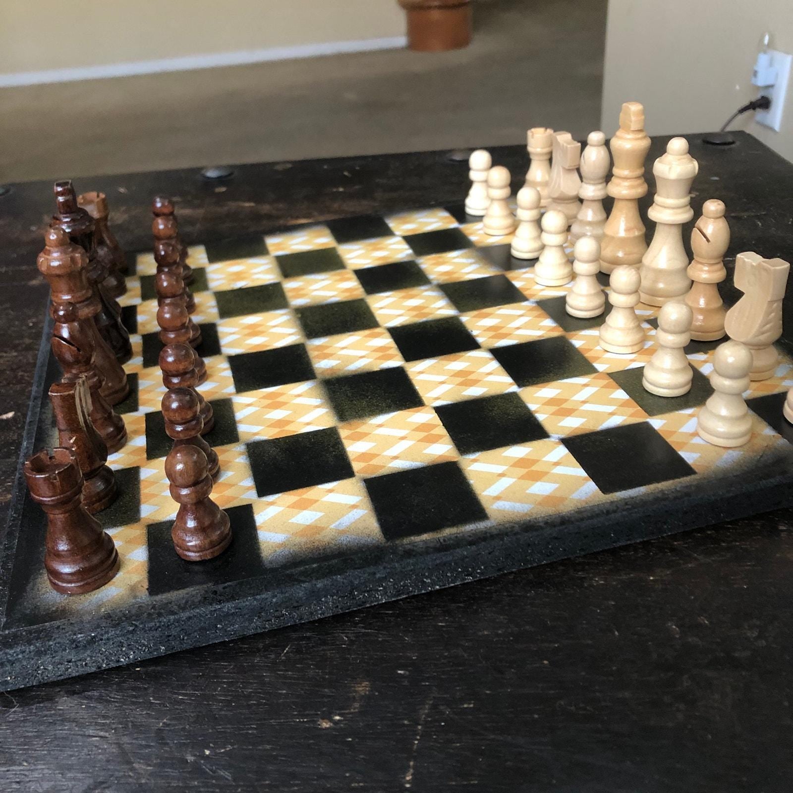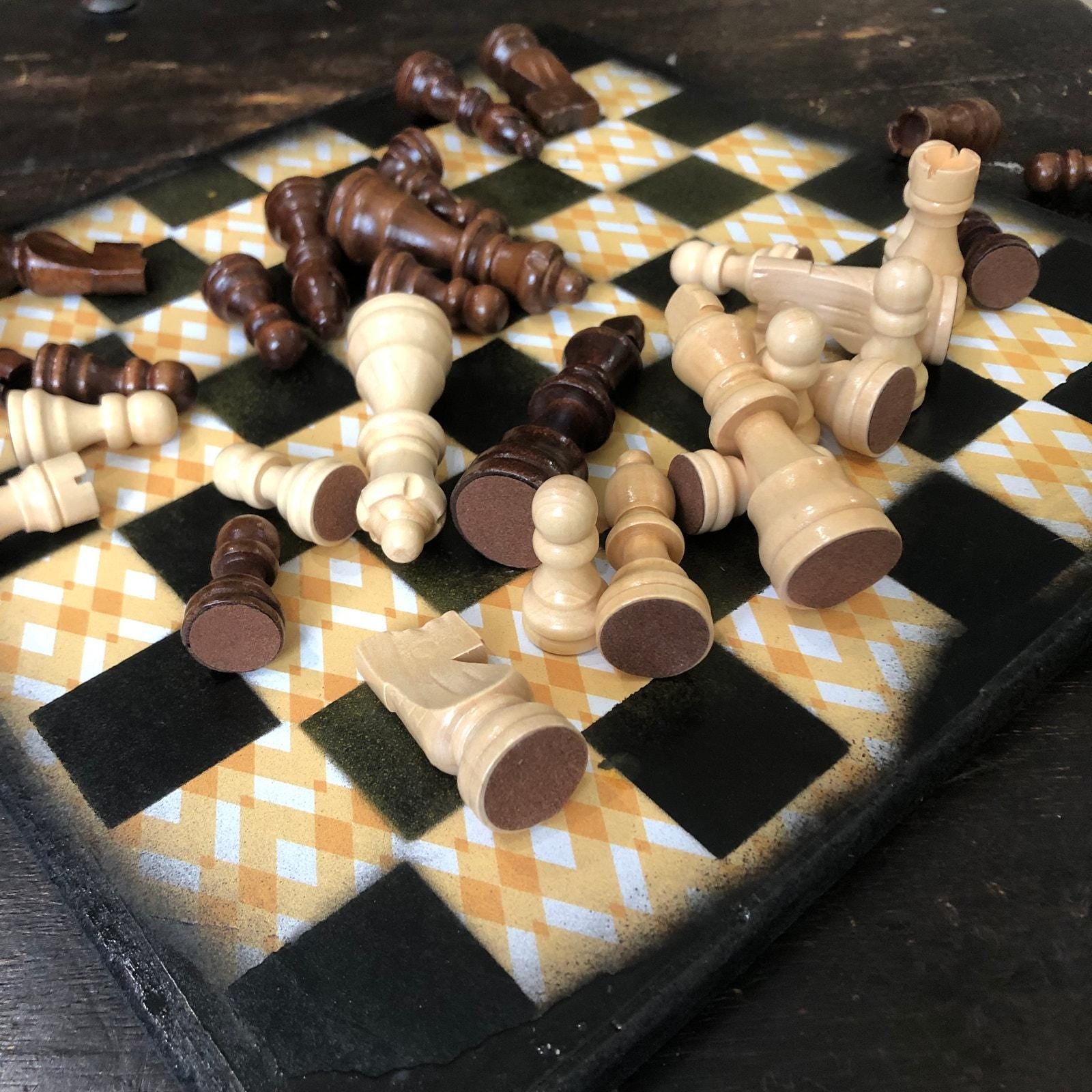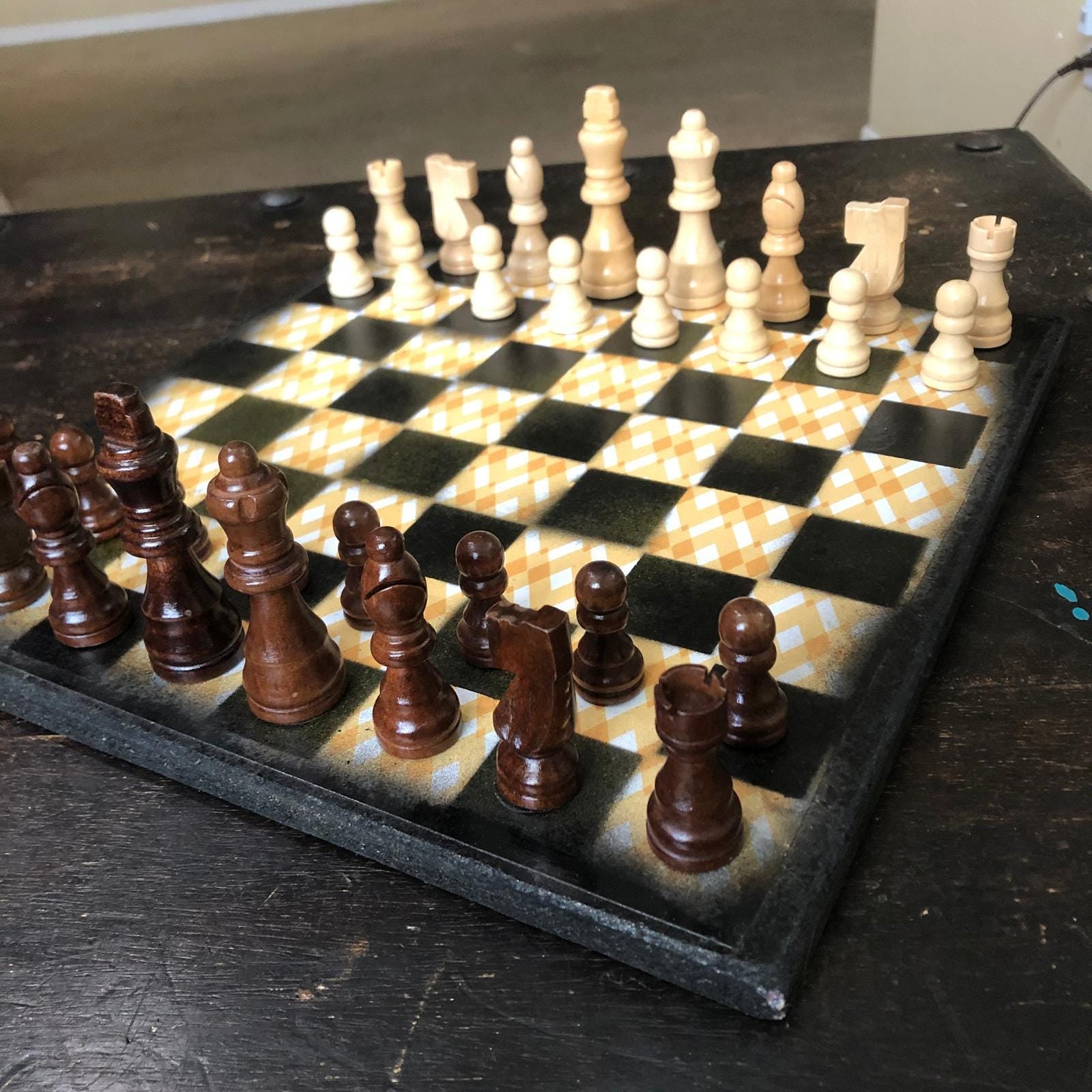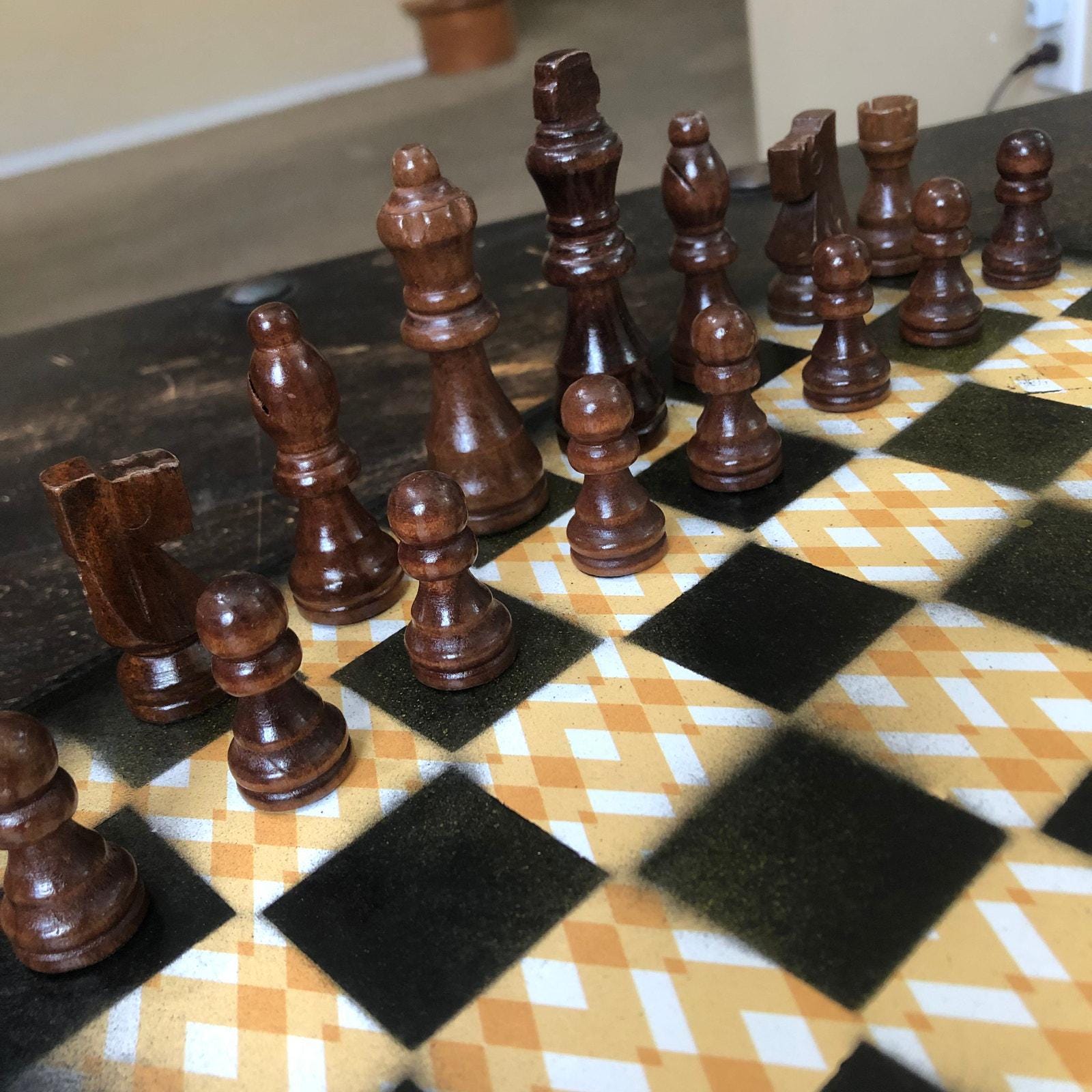 Introducing our exclusive Handcrafted Wooden Chess Set, meticulously designed with precision and care. Measuring 12 inches by 12 inches, this chess set features a beautifully painted particle board layered with a sheet of scrapbook paper board that doubles as a work of art. Each set is a unique, one-of-a-kind creation, crafted by hand to ensure that no two sets are alike. Elevate your gaming experience with this exceptional chess set that combines vibrant design with the touch of artisan craftsmanship. This chess board comes with chess pieces and is handcrafted as a one of one