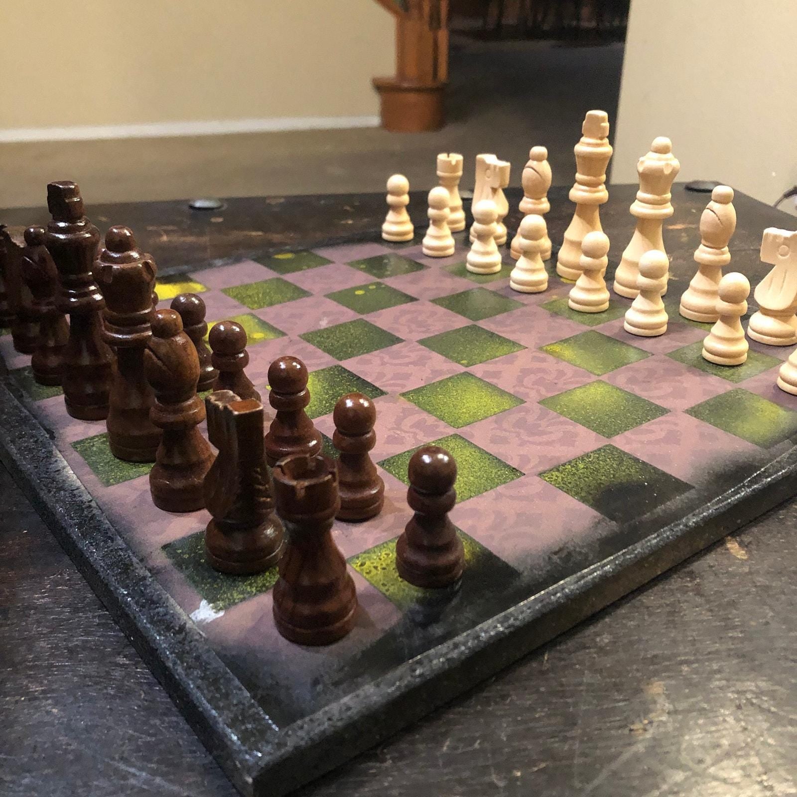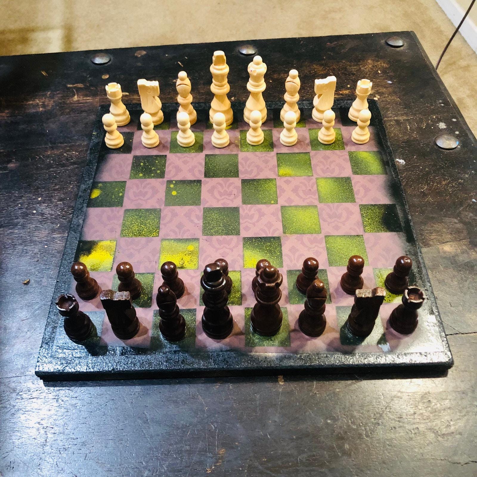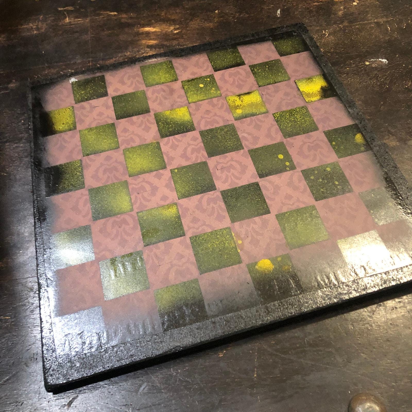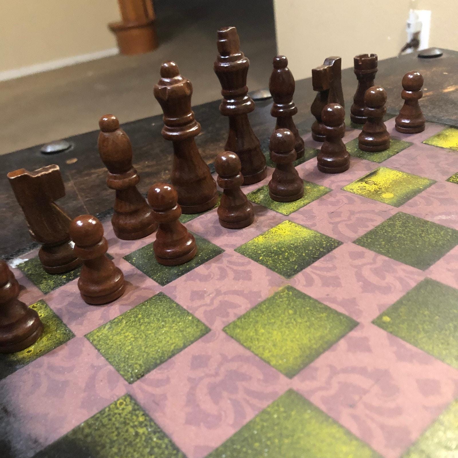 Introducing our exclusive Handcrafted Wooden Chess Set, meticulously designed with precision and care. Measuring 12 inches by 12 inches, this chess set features a beautifully painted particle board layered with a sheet of scrapbook paper board that doubles as a work of art. Each set is a unique, one-of-a-kind creation, crafted by hand to ensure that no two sets are alike. Elevate your gaming experience with this exceptional chess set that combines vibrant design with the touch of artisan craftsmanship. This chess board comes with chess pieces and is handcrafted as a one of one