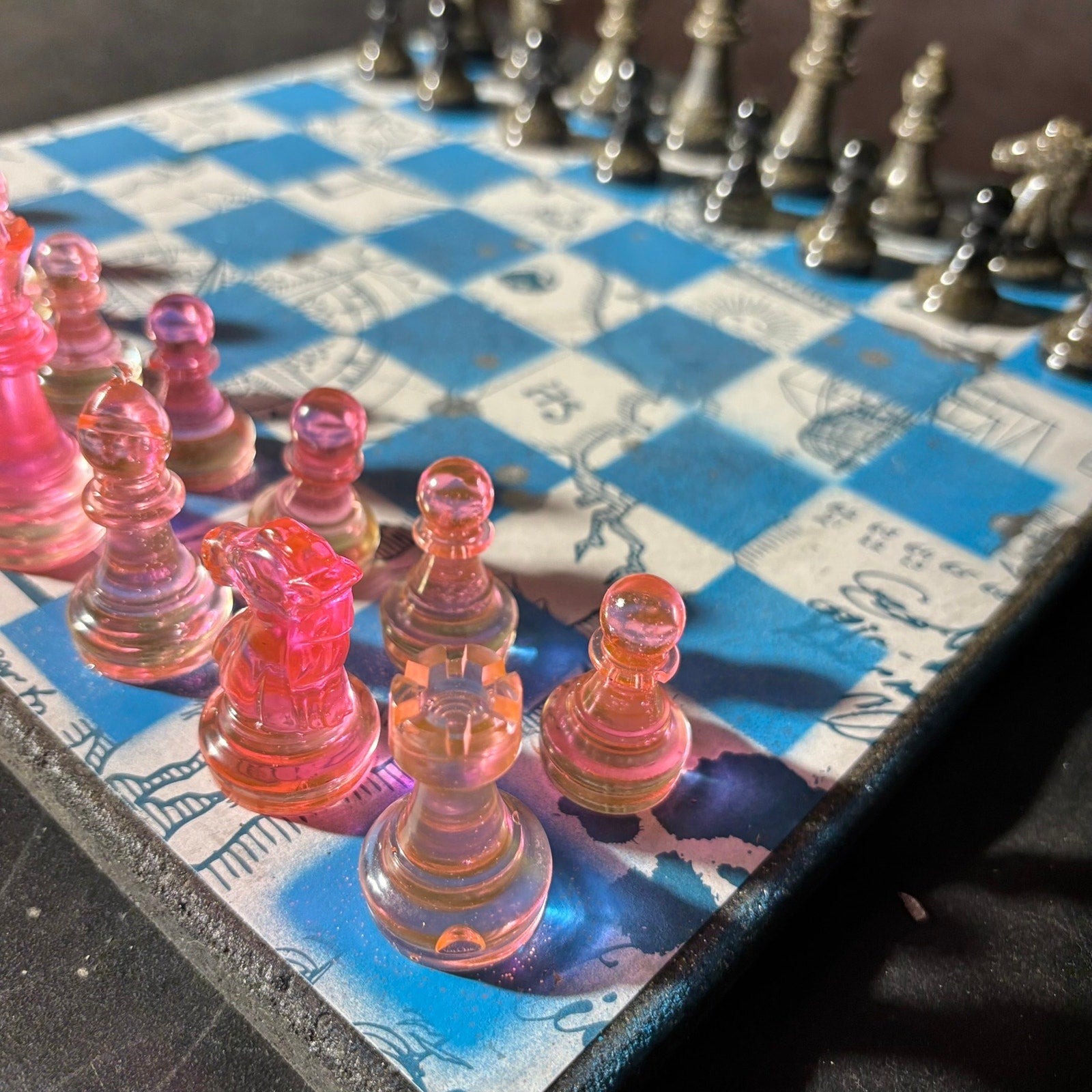 Introducing our exclusive Handcrafted Wooden Chess Set, meticulously designed with precision and care. Measuring 12 inches by 12 inches, this chess set features a beautifully painted particle board layered with a sheet of scrapbook paper board that doubles as a work of art. Each set is a unique, one-of-a-kind creation, crafted by hand to ensure that no two sets are alike. Elevate your gaming experience with this exceptional chess set that combines vibrant design with the touch of artisan craftsmanship. This chess board comes with chess pieces and is handcrafted as a one of one