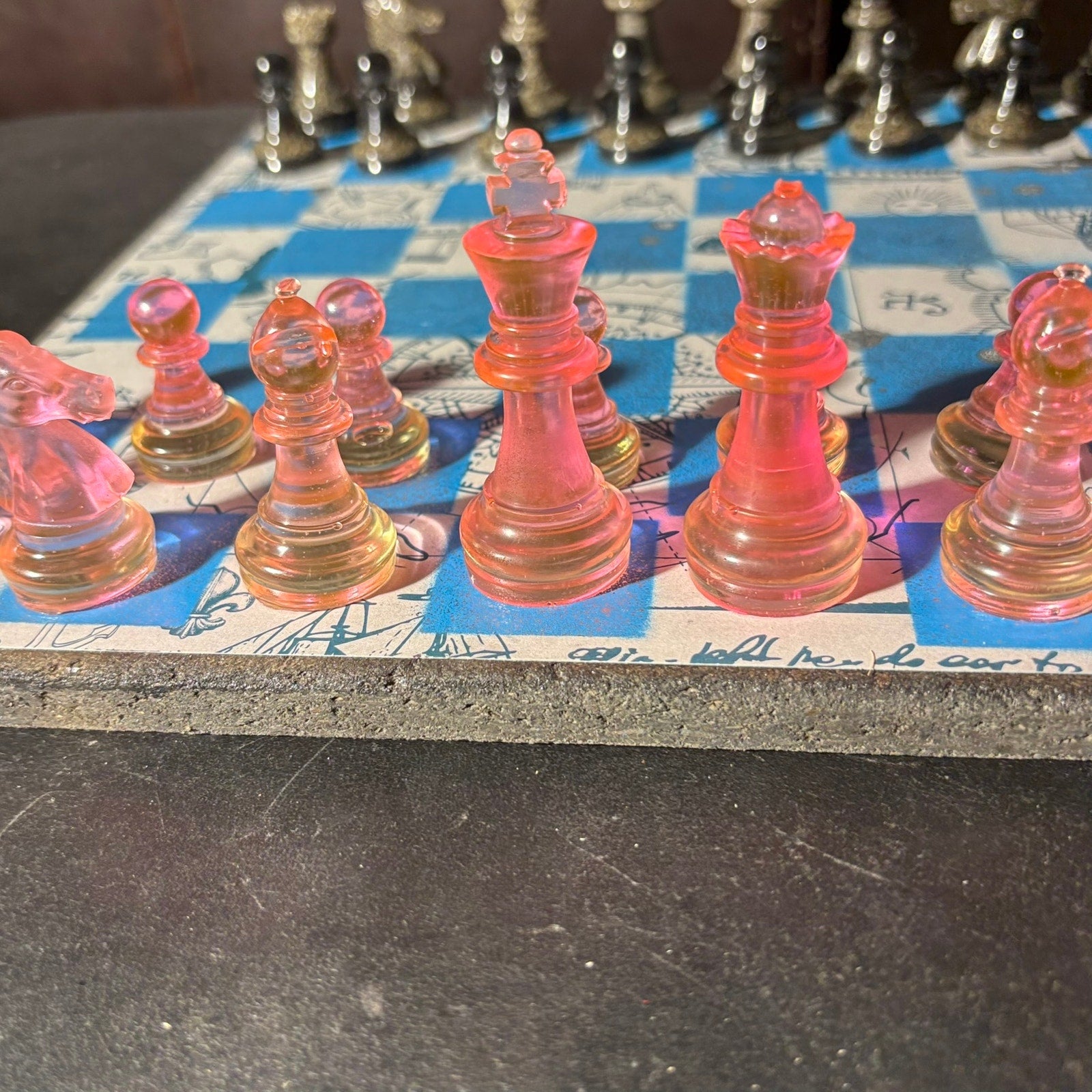 *** PLEASE READ: The resin pieces that have clear transparent parts will slowly turn royal amber as time goes on (Clear see through resin turn amber with time). Most of the sets are solid or colored so there is no need to expect a change at all, but some have clear transparent bottoms that will turn amber. I write this because some of our chess sets may not sell for a year or two and the photos are taken when the item is listed online. Meaning the photos will have slight difference. Rest assured, the amber is beautiful and vintage!