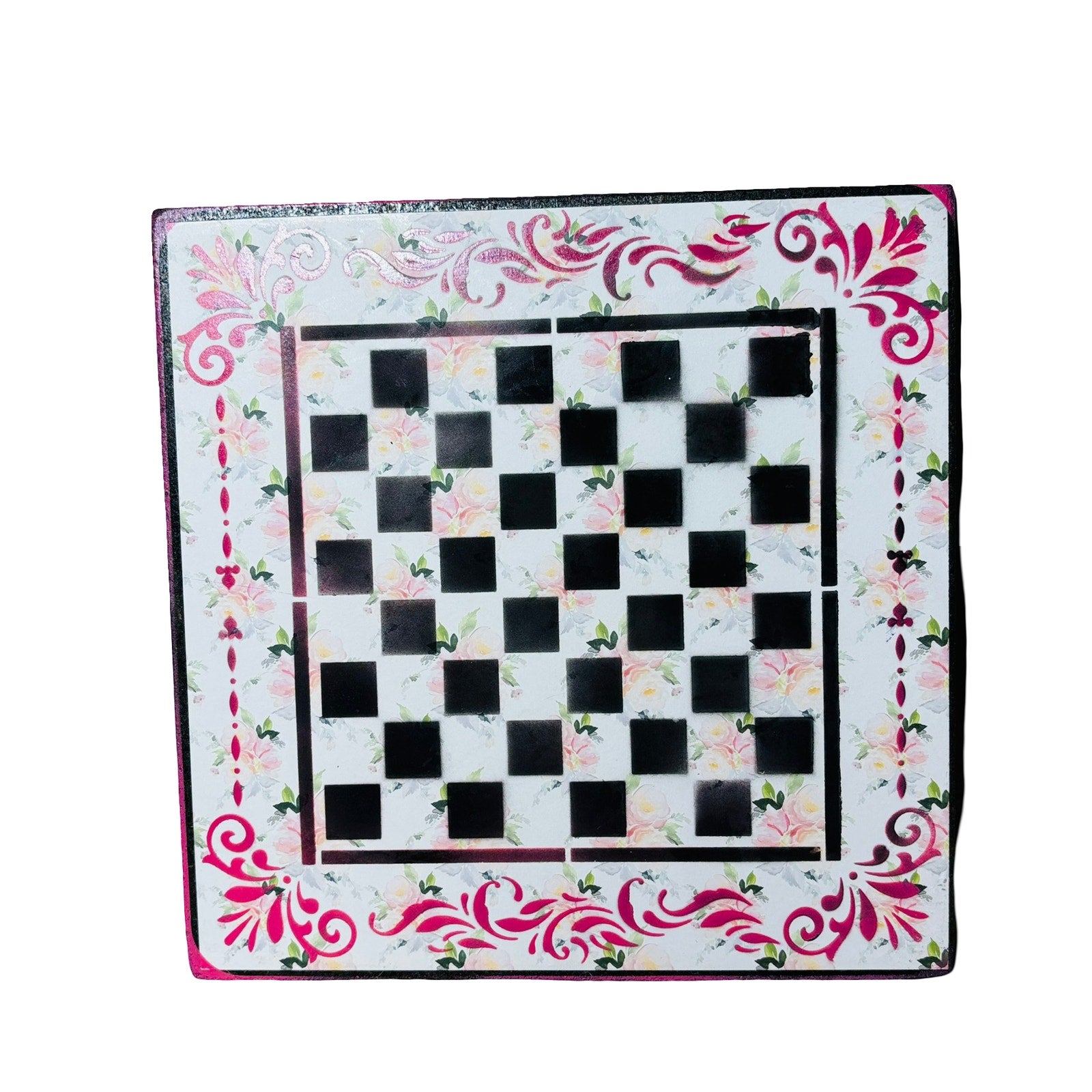 Each board features a layer of beautifully Scrapbook Paper Fused/Glued with particle board to give it a unique pretty pattern. We then paint squares onto the board to make them into fabulous chess boards. Made with a sturdy particle board base and smooth, beveled edges, this board is stunning.