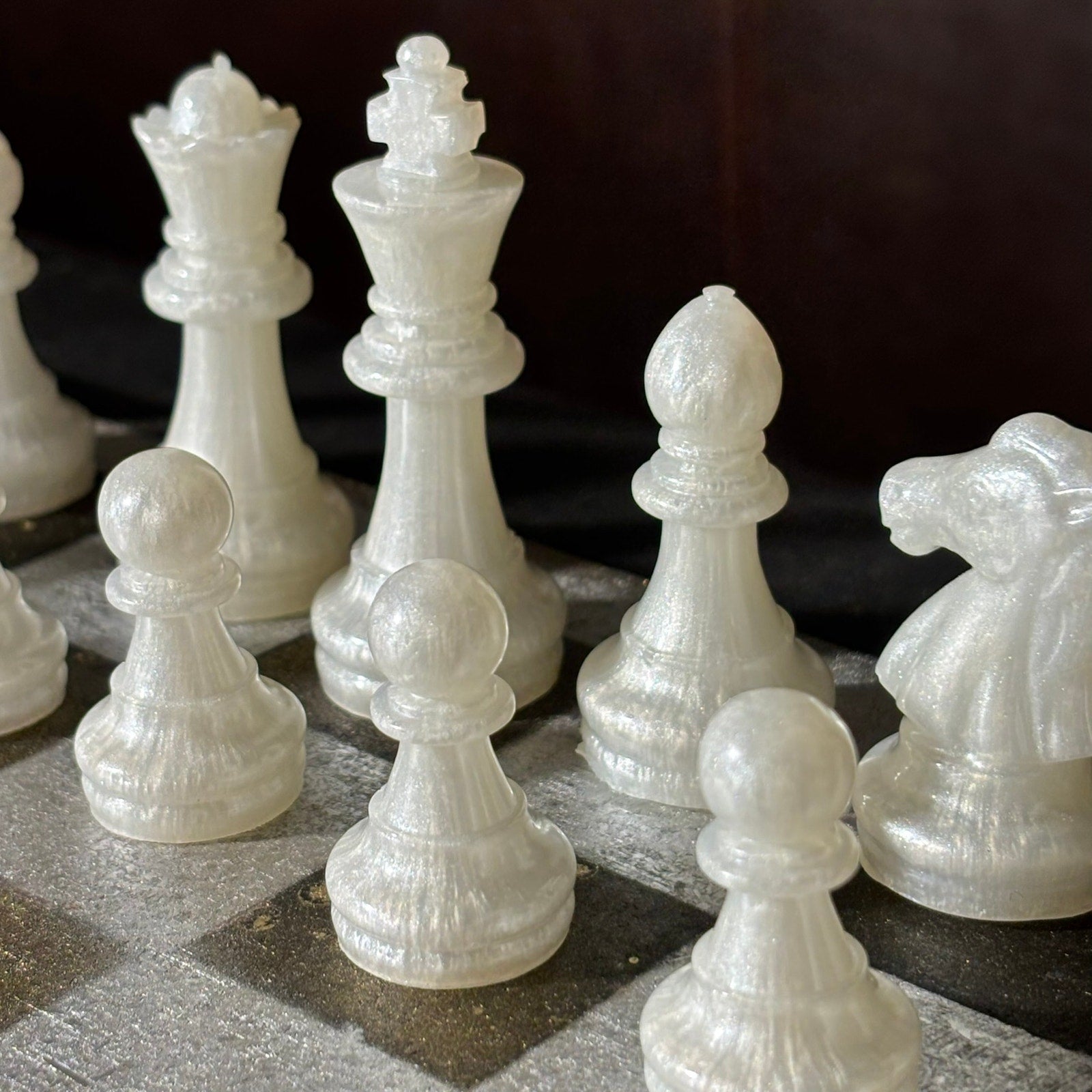 *** PLEASE READ: The resin pieces that have clear transparent parts will slowly turn royal amber as time goes on (Clear see through resin turn amber with time). Most of the sets are solid or colored so there is no need to expect a change at all, but some have clear transparent bottoms that will turn amber. I write this because some of our chess sets may not sell for a year or two and the photos are taken when the item is listed online. Meaning the photos will have slight difference. Rest assured, the amber is beautiful and vintage!
