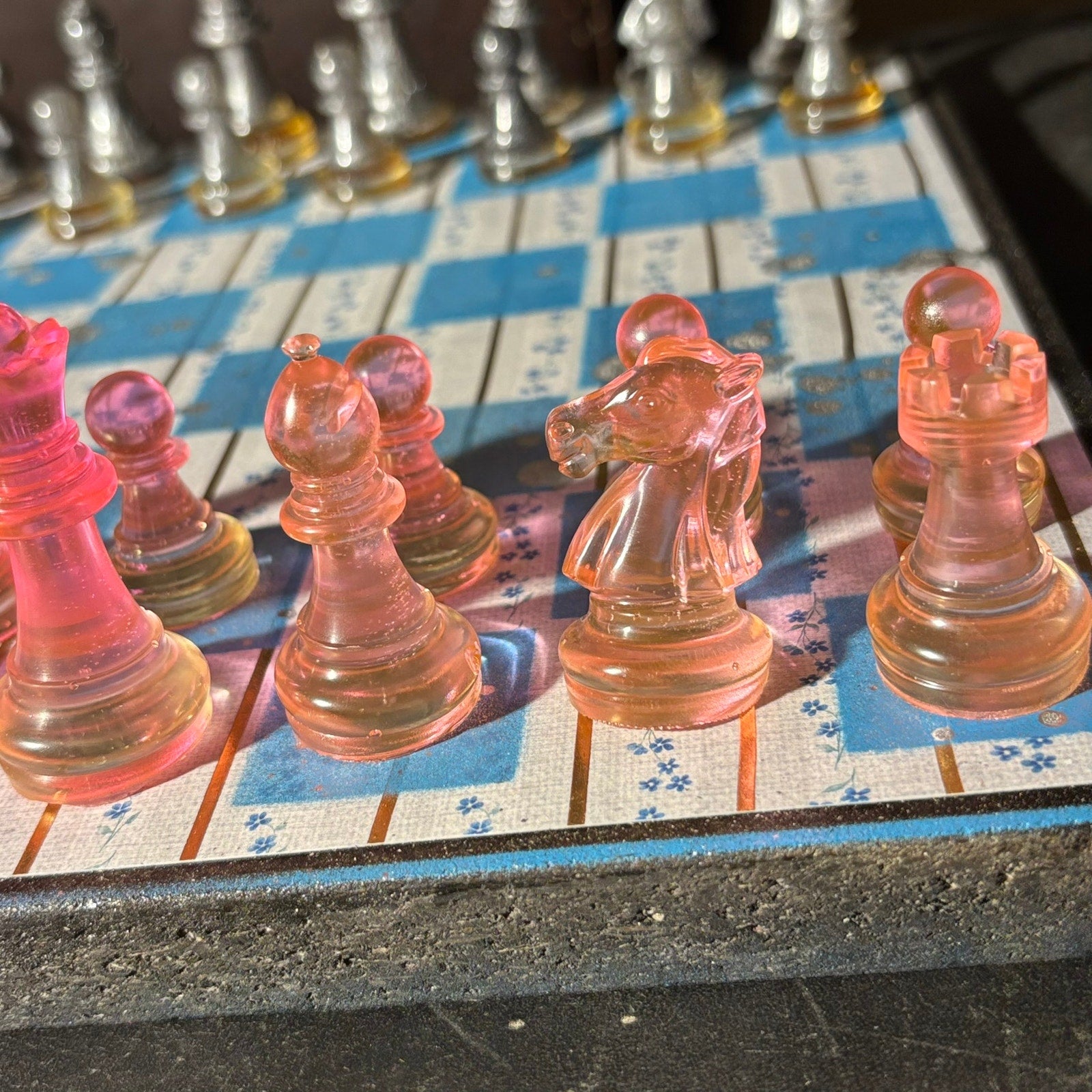 *** PLEASE READ: The resin pieces that have clear transparent parts will slowly turn royal amber as time goes on (Clear see through resin turn amber with time). Most of the sets are solid or colored so there is no need to expect a change at all, but some have clear transparent bottoms that will turn amber. I write this because some of our chess sets may not sell for a year or two and the photos are taken when the item is listed online. Meaning the photos will have slight difference. Rest assured, the amber is beautiful and vintage!
