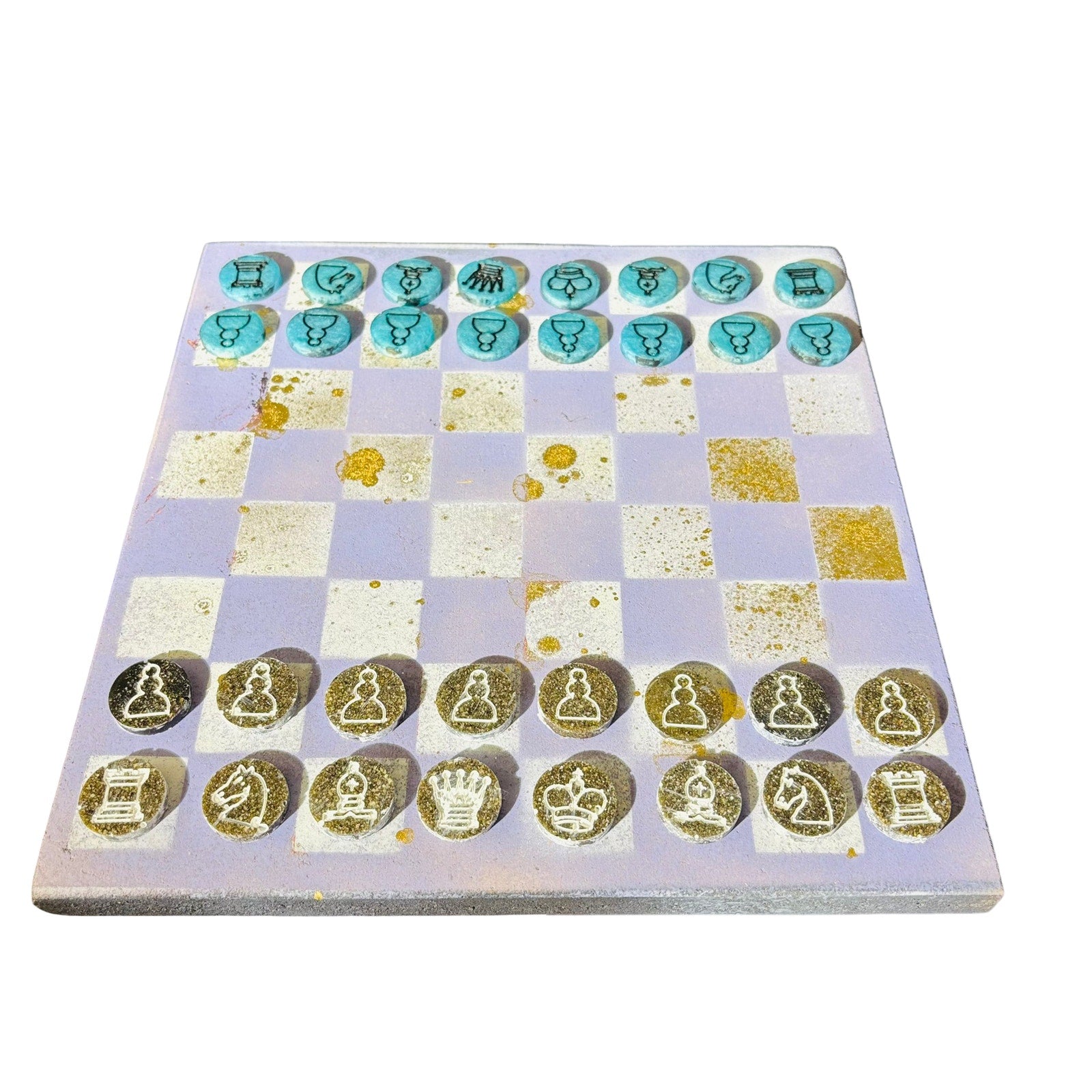 Introducing our exclusive Handcrafted Wooden Chess Set, meticulously designed with precision and care. Measuring 12 inches by 12 inches, this chess set features a beautifully painted Particle Board board that doubles as a work of art. Each set is a unique, one-of-a-kind creation, crafted by hand to ensure that no two sets are alike. Elevate your gaming experience with this exceptional chess set that combines vibrant design with the touch of artisan craftsmanship. This chess board comes with Resin chess pieces.