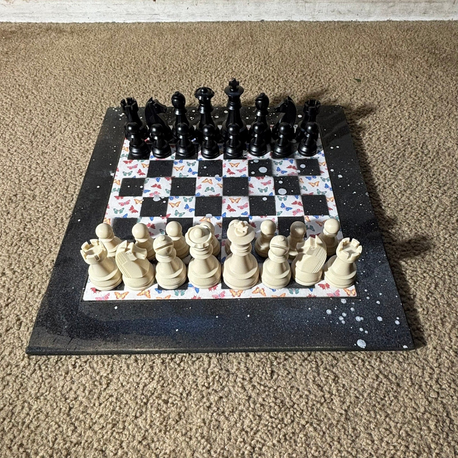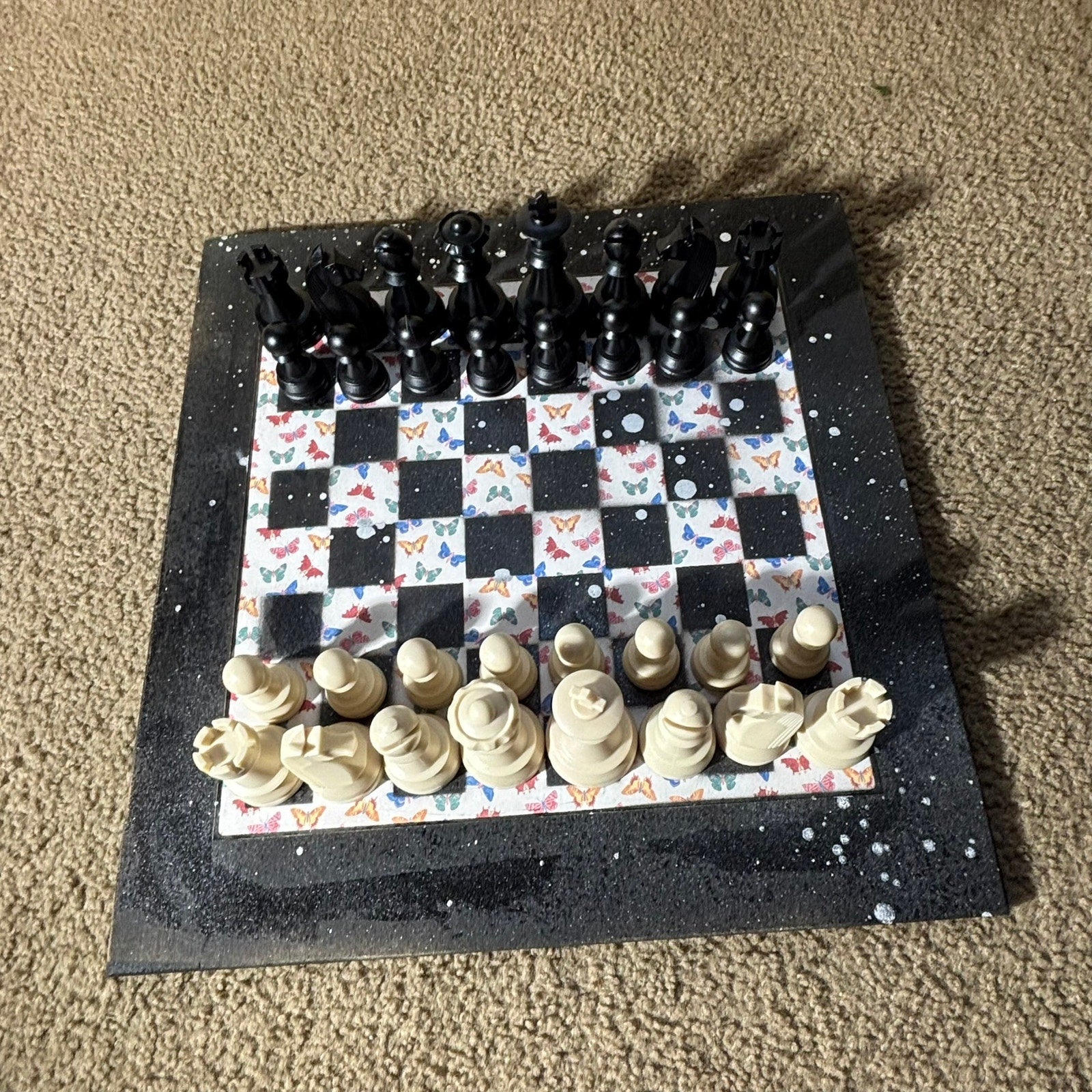 The chessboard is crafted from a 16x16 inch particle board, featuring a 12x12 inch scrapbook paper playing area. Both the board and squares are hand-painted with care, making each set truly unique. Add a touch of artistry to your game night with this beautiful chess set!