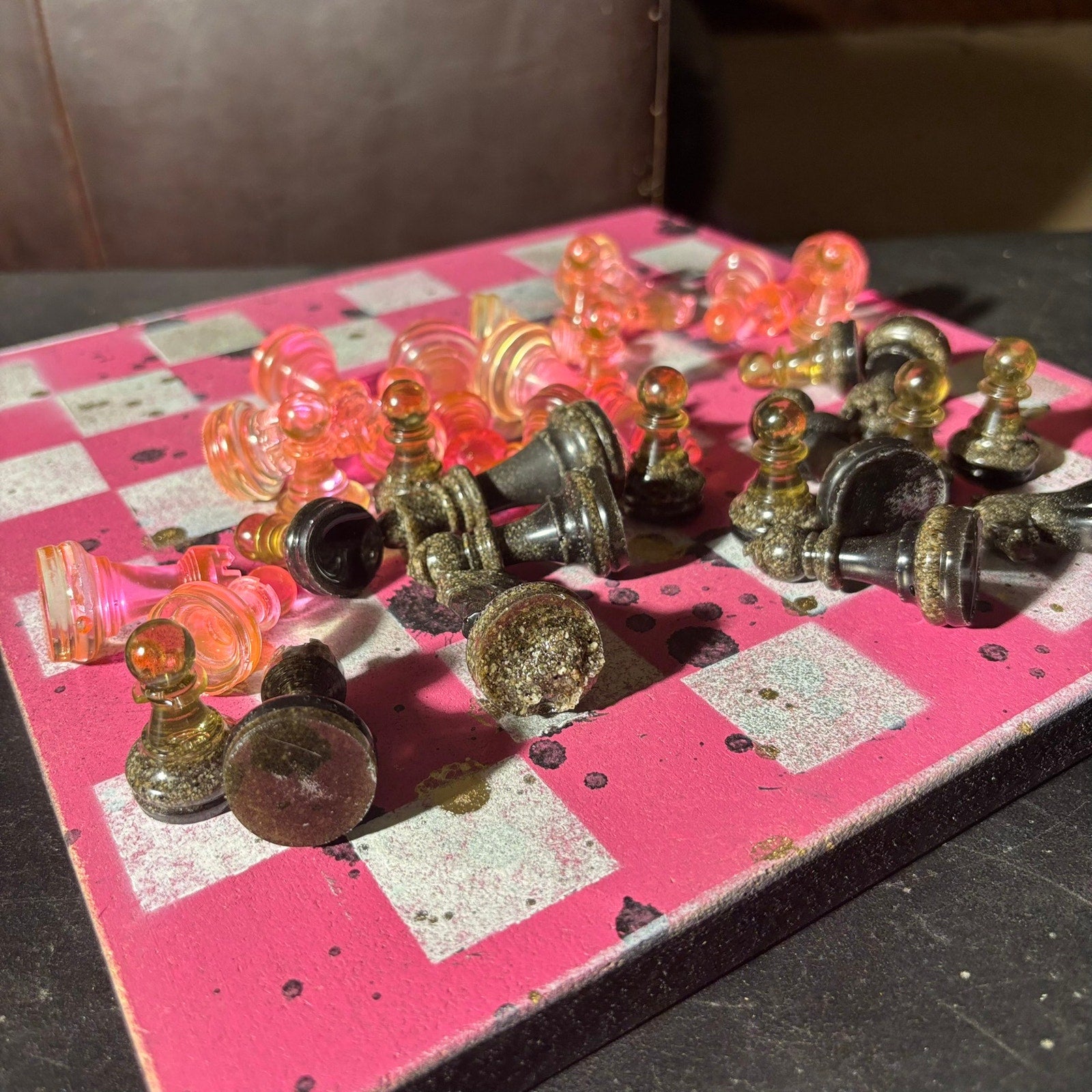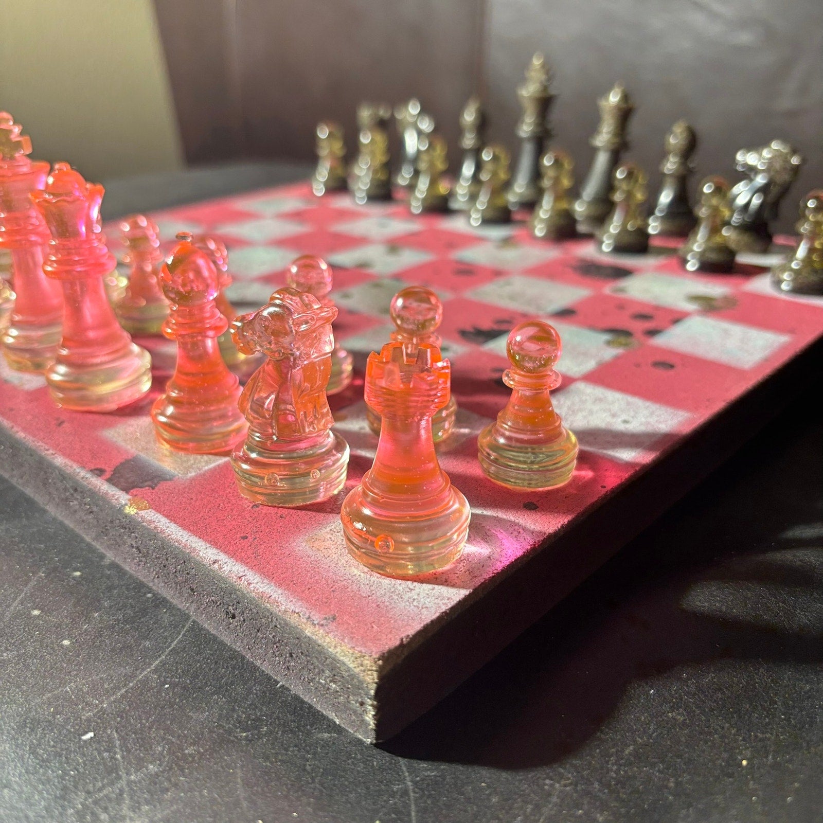 Introducing our exclusive Handcrafted Wooden Chess Set, meticulously designed with precision and care. Measuring 12 inches by 12 inches, this chess set features a beautifully painted Particle Board board that doubles as a work of art. Each set is a unique, one-of-a-kind creation, crafted by hand to ensure that no two sets are alike. Elevate your gaming experience with this exceptional chess set that combines vibrant design with the touch of artisan craftsmanship. This chess board comes with Resin chess pieces.