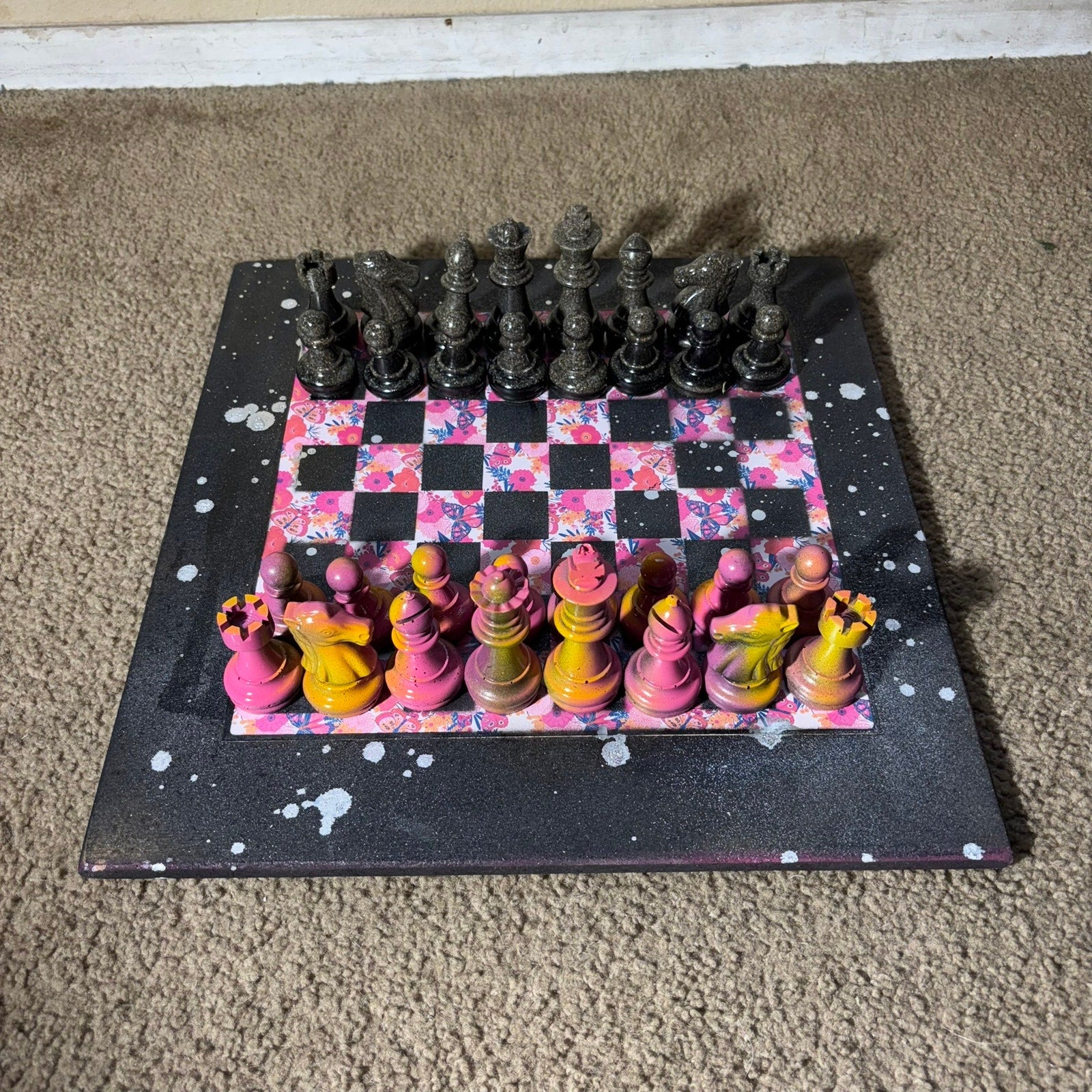 The chessboard is crafted from a 16x16 inch particle board, featuring a 12x12 inch scrapbook paper playing area. Both the board and squares are hand-painted with care, making each set truly unique. Add a touch of artistry to your game night with this beautiful chess set!