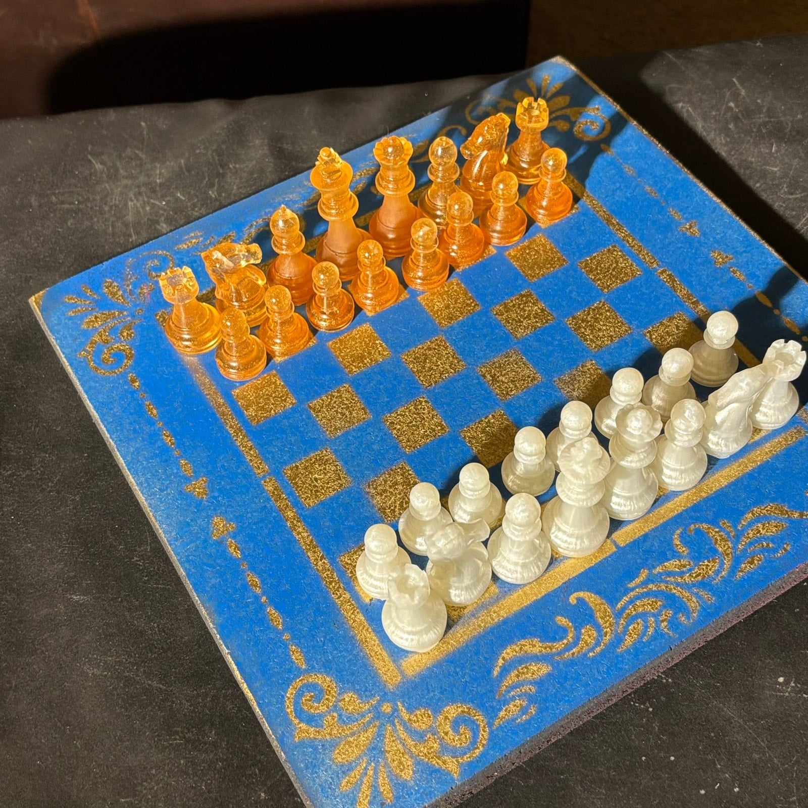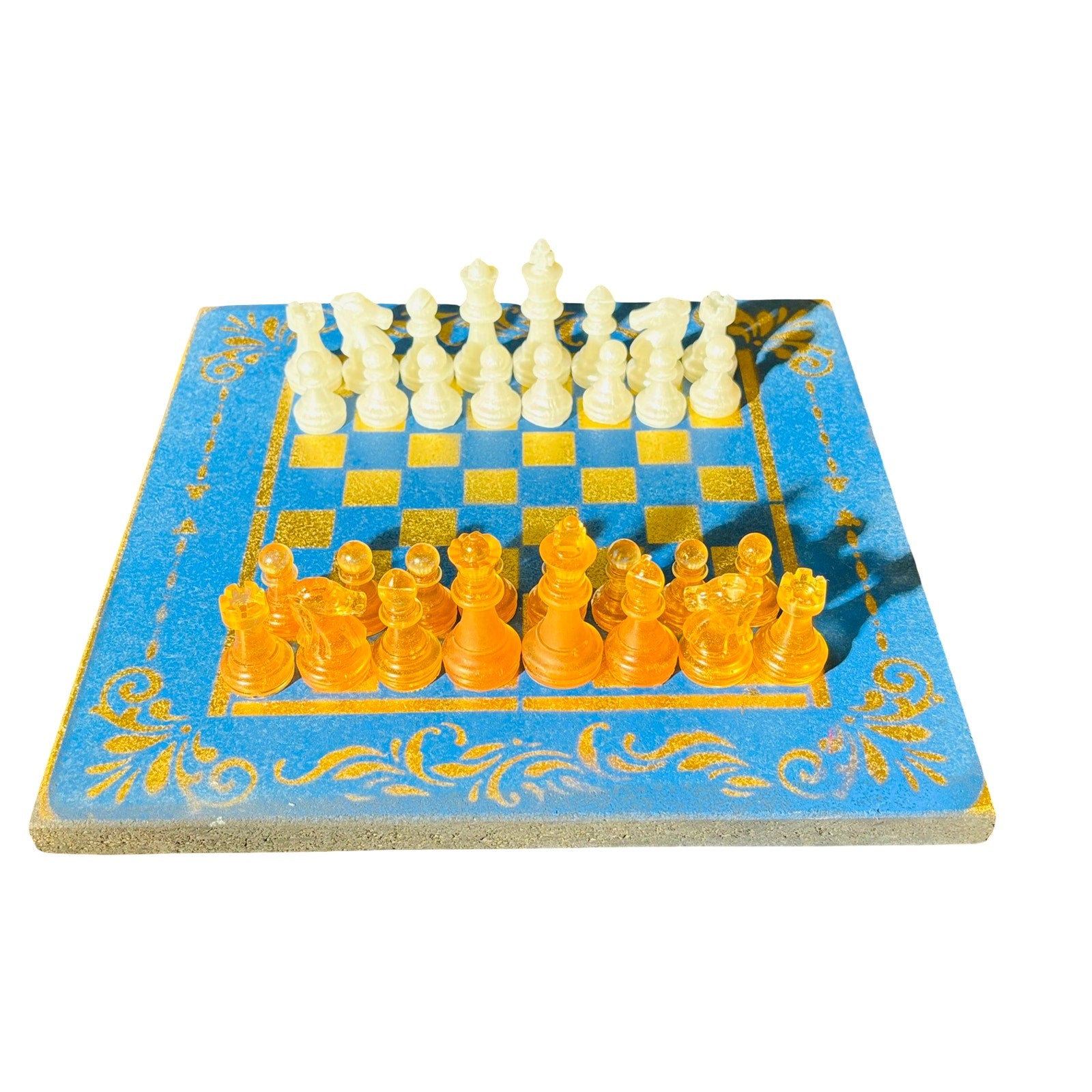 Introducing our exclusive Handcrafted Wooden Chess Set, meticulously designed with precision and care. Measuring 12 inches by 12 inches, this chess set features a beautifully painted Particle Board board that doubles as a work of art. Each set is a unique, one-of-a-kind creation, crafted by hand to ensure that no two sets are alike. Elevate your gaming experience with this exceptional chess set that combines vibrant design with the touch of artisan craftsmanship. This chess board comes with Resin chess pieces.