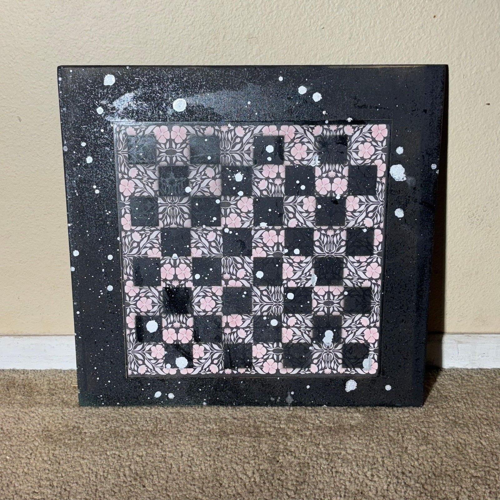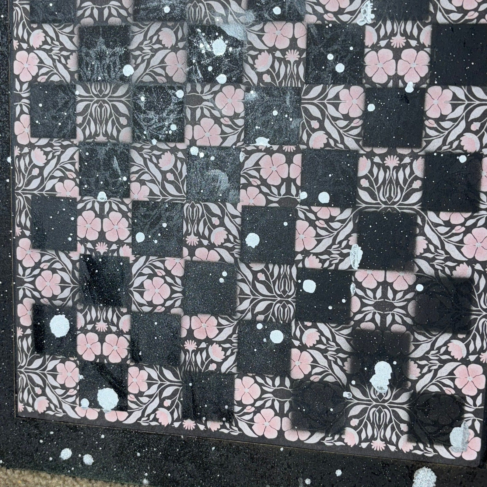 The board is crafted from durable particle board, painted with care to create the classic chess square pattern. What makes this board special is the unique 12x12 piece of scrapbook paper inlaid in the center, adding a personal touch to your game.