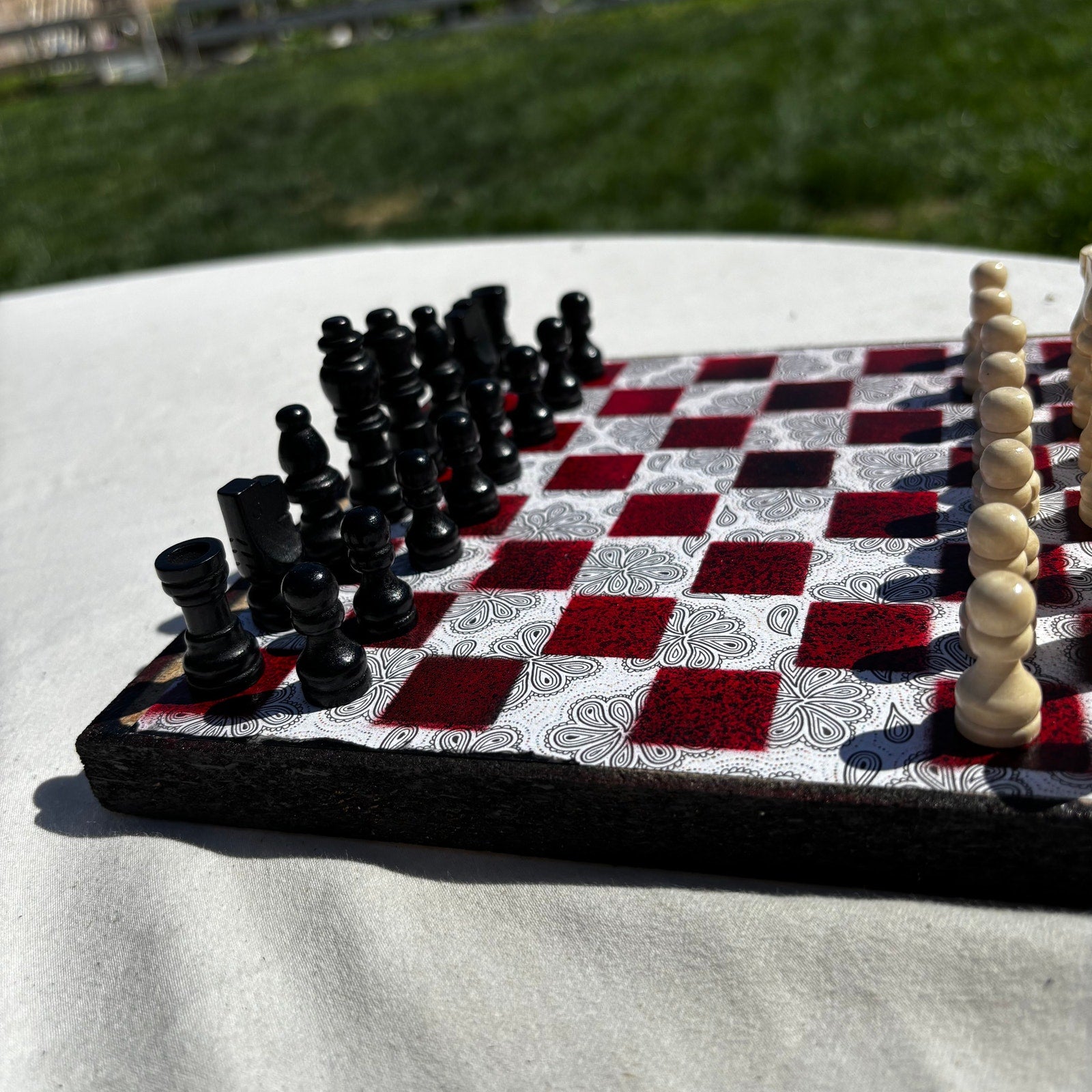 Introducing our exclusive Handcrafted Wooden Chess Set, meticulously designed with precision and care. Measuring 8 inches by 8 inches, this chess set features a beautifully painted particle board layered with a sheet of scrapbook paper board that doubles as a work of art. Each set is a unique, one-of-a-kind creation, crafted by hand to ensure that no two sets are alike. Elevate your gaming experience with this exceptional chess set that combines vibrant design with the touch of artisan craftsmanship. This chess board comes with chess pieces and is handcrafted as a one of one