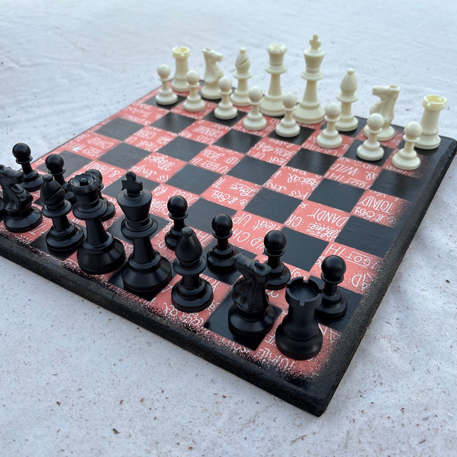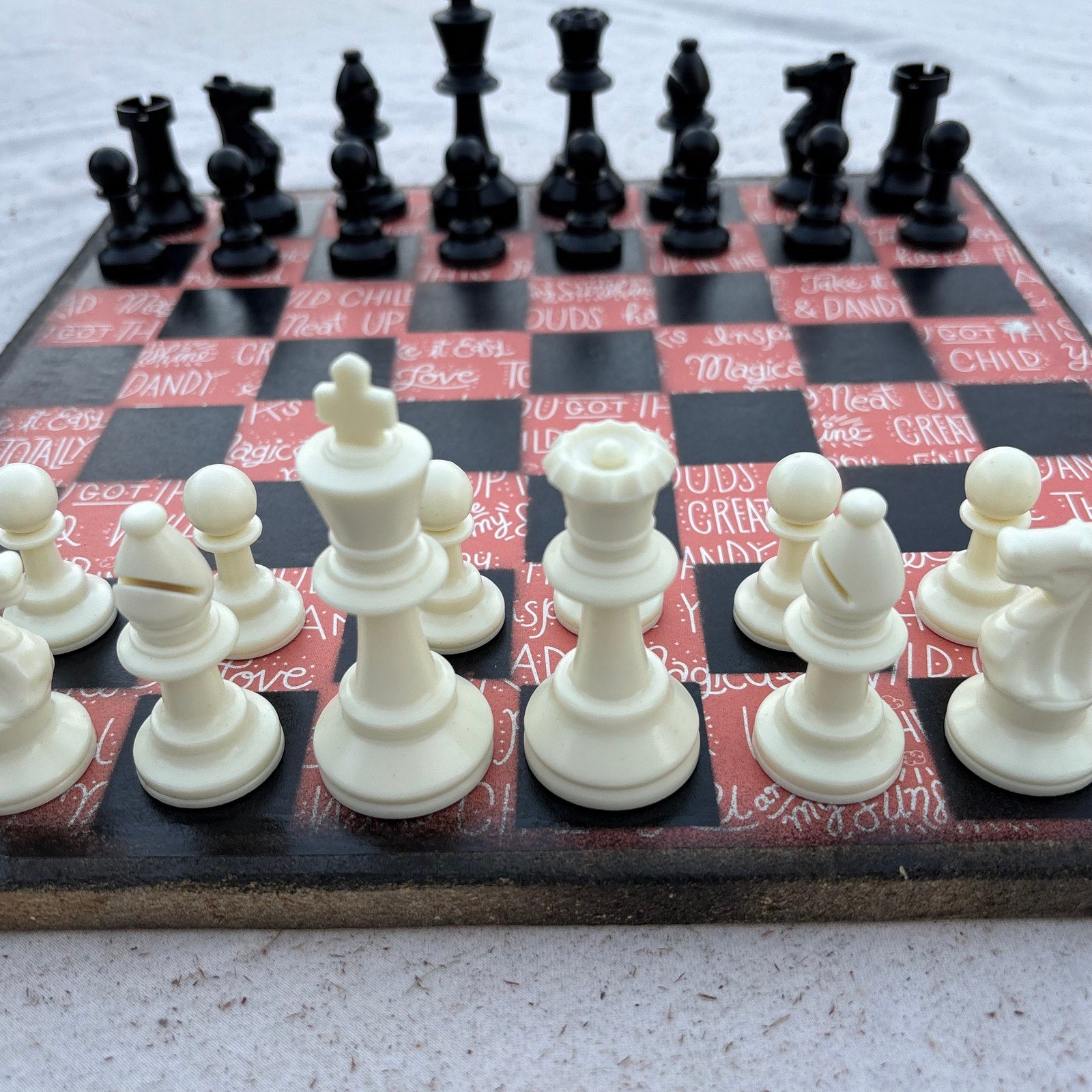 Introducing our exclusive Handcrafted Wooden Chess Set, meticulously designed with precision and care. Measuring 12 inches by 12 inches, this chess set features a beautifully painted particle board layered with a sheet of scrapbook paper board that doubles as a work of art. Each set is a unique, one-of-a-kind creation, crafted by hand to ensure that no two sets are alike. Elevate your gaming experience with this exceptional chess set that combines vibrant design with the touch of artisan craftsmanship. This chess board comes with chess pieces and is handcrafted as a one of one