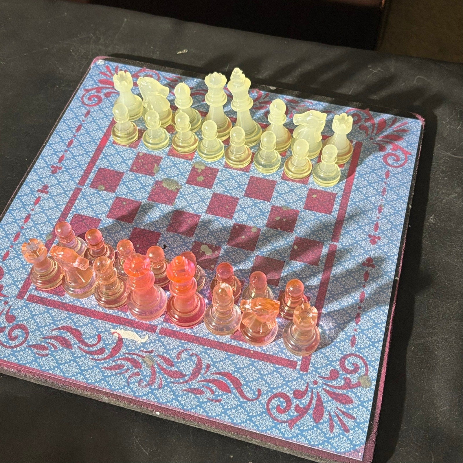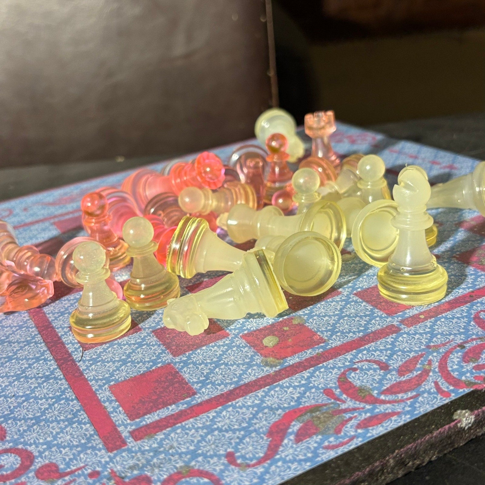 *** PLEASE READ: The resin pieces that have clear transparent parts will slowly turn royal amber as time goes on (Clear see through resin turn amber with time). Most of the sets are solid or colored so there is no need to expect a change at all, but some have clear transparent bottoms that will turn amber. I write this because some of our chess sets may not sell for a year or two and the photos are taken when the item is listed online. Meaning the photos will have slight difference. Rest assured, the amber is beautiful and vintage!