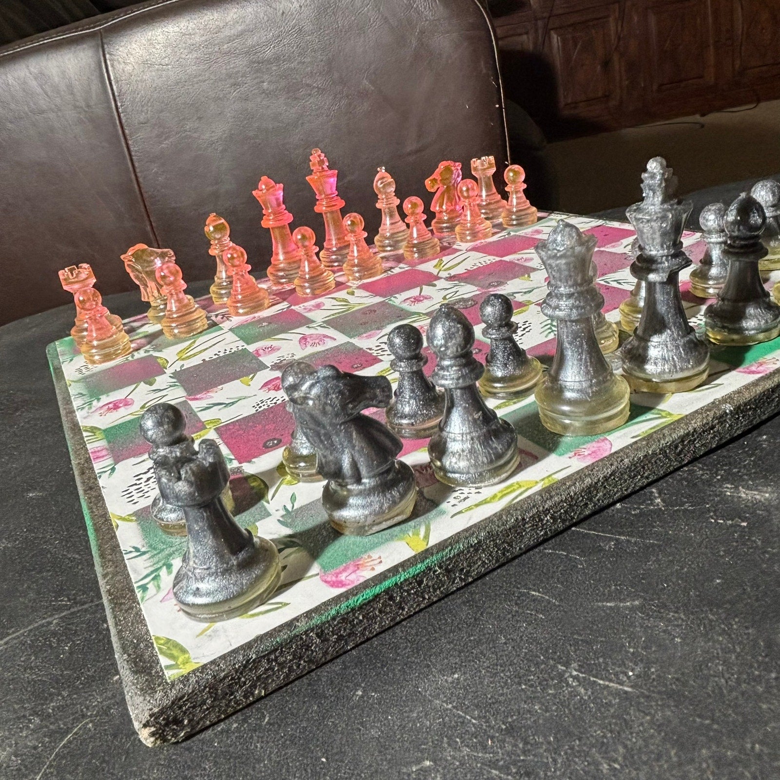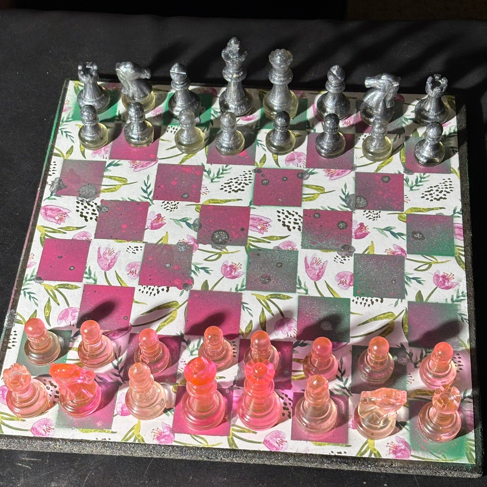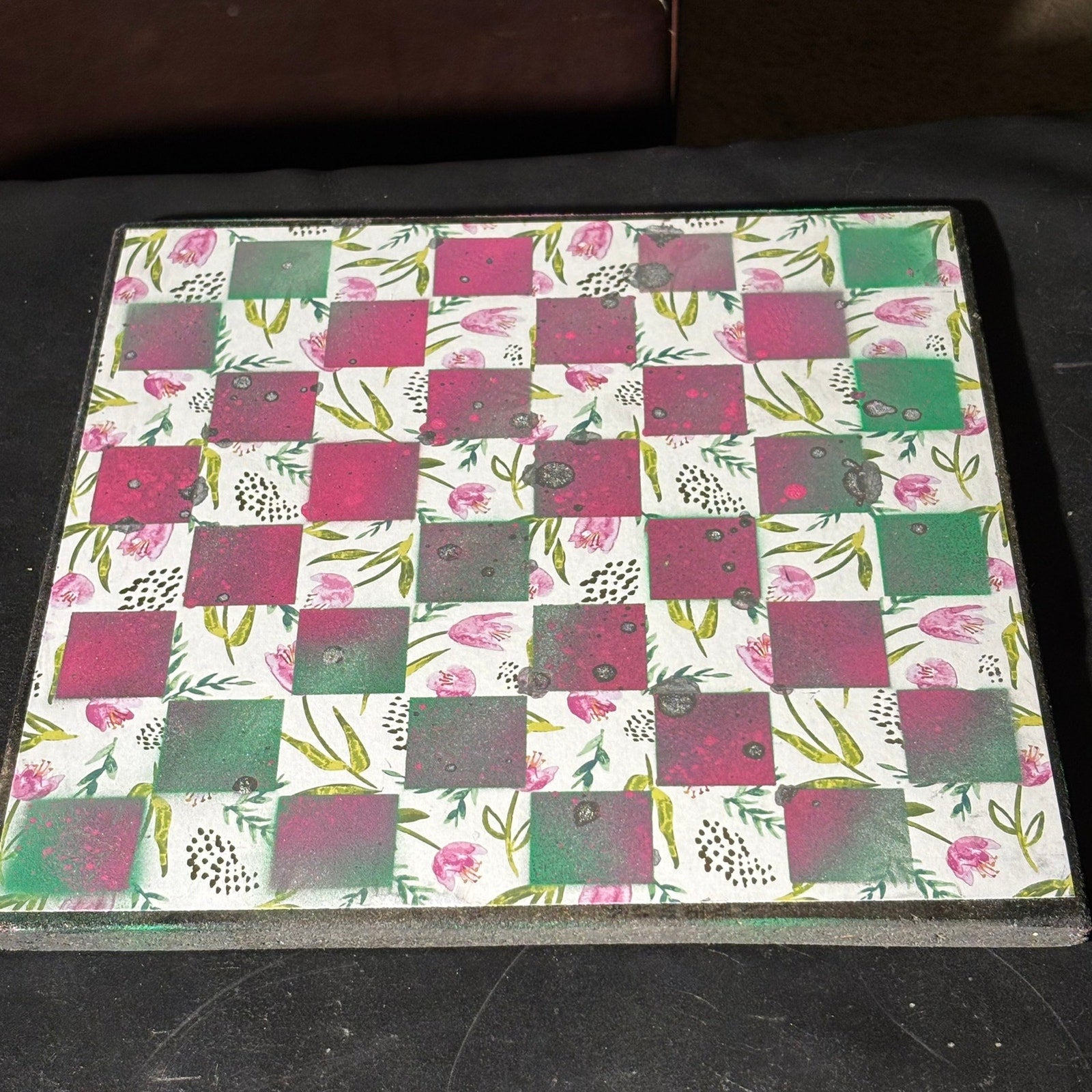 Introducing our exclusive Handcrafted Wooden Chess Set, meticulously designed with precision and care. Measuring 12 inches by 12 inches, this chess set features a beautifully painted particle board layered with a sheet of scrapbook paper board that doubles as a work of art. Each set is a unique, one-of-a-kind creation, crafted by hand to ensure that no two sets are alike. Elevate your gaming experience with this exceptional chess set that combines vibrant design with the touch of artisan craftsmanship. This chess board comes with chess pieces and is handcrafted as a one of one
