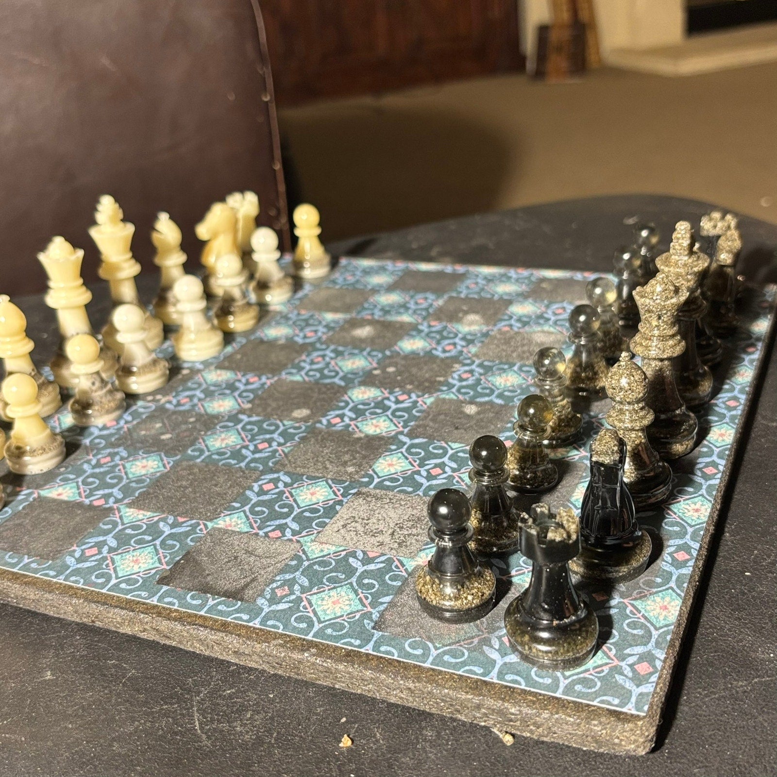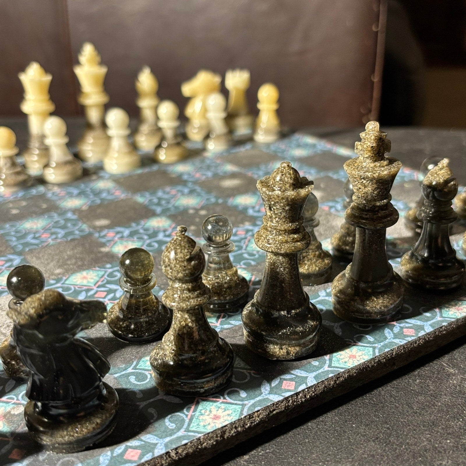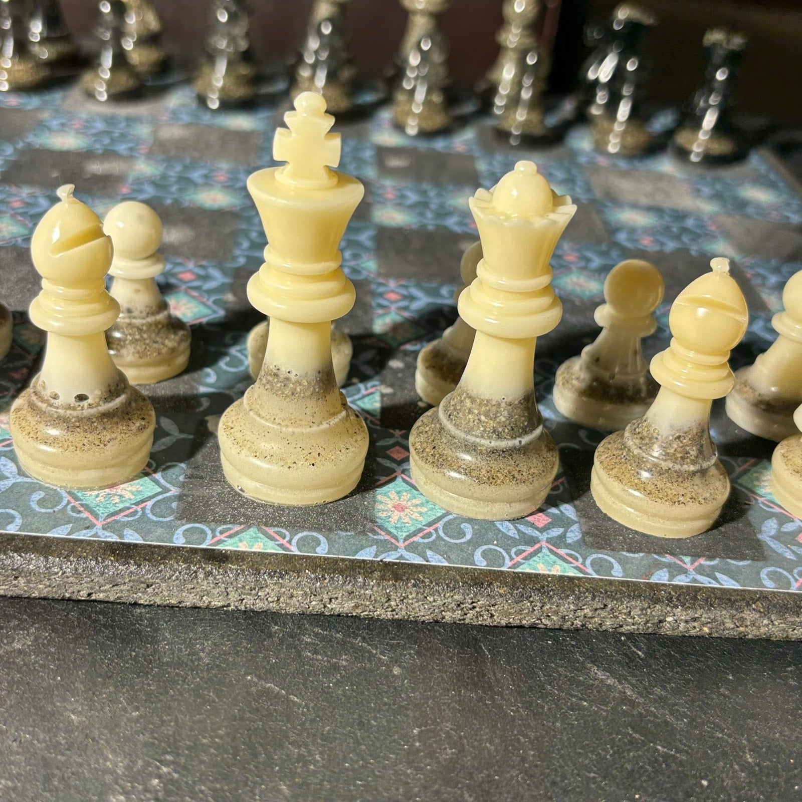 *** PLEASE READ: The resin pieces that have clear transparent parts will slowly turn royal amber as time goes on (Clear see through resin turn amber with time). Most of the sets are solid or colored so there is no need to expect a change at all, but some have clear transparent bottoms that will turn amber. I write this because some of our chess sets may not sell for a year or two and the photos are taken when the item is listed online. Meaning the photos will have slight difference. Rest assured, the amber is beautiful and vintage!