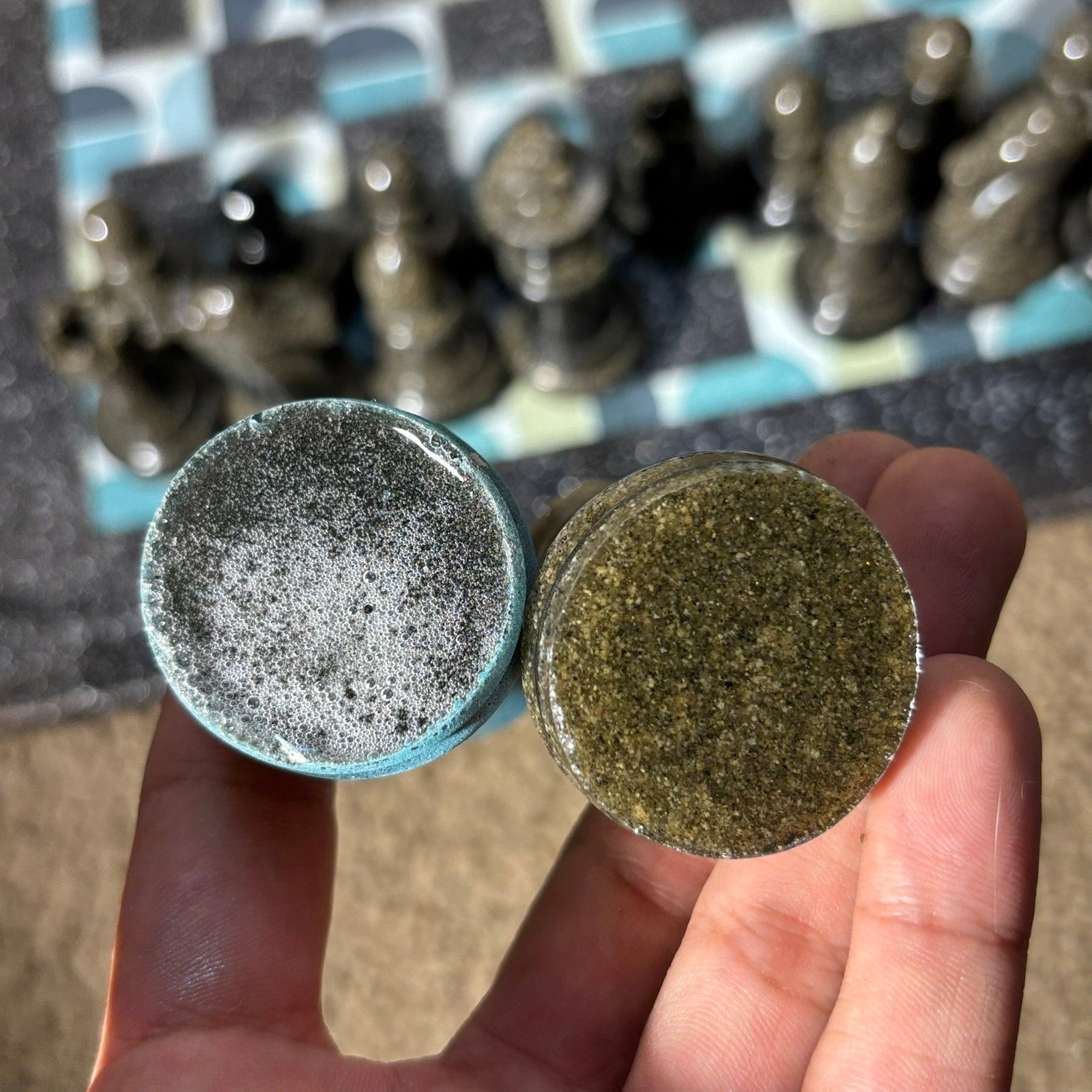 This unique chess set is a one-of-a-kind creation, perfect for chess enthusiasts and collectors! The chess pieces are handmade from resin and mixed with sand rock, giving them a substantial and satisfying weight.