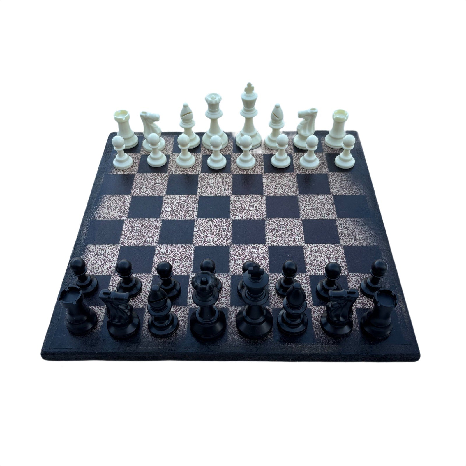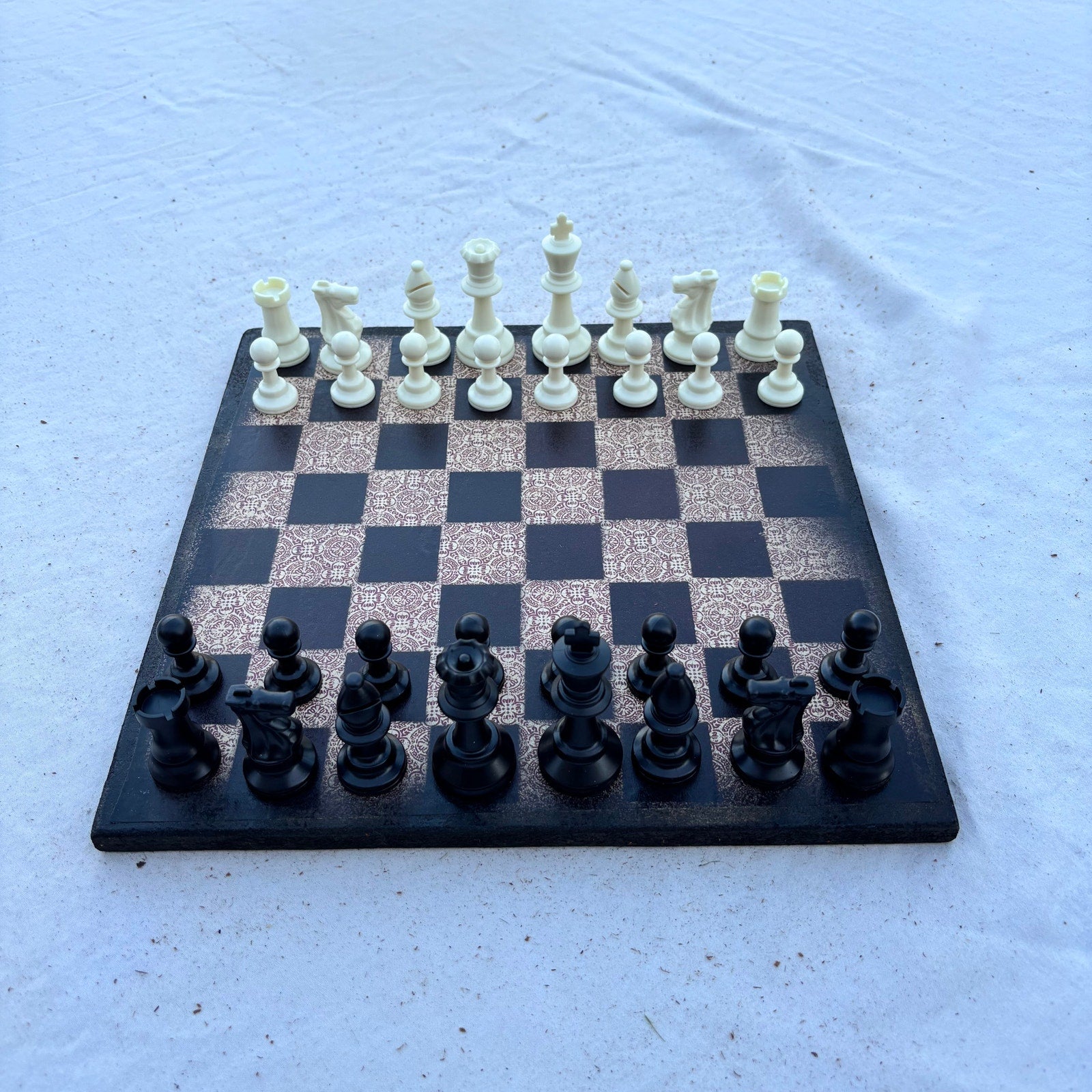 Introducing our exclusive Handcrafted Wooden Chess Set, meticulously designed with precision and care. Measuring 12 inches by 12 inches, this chess set features a beautifully painted particle board layered with a sheet of scrapbook paper board that doubles as a work of art. Each set is a unique, one-of-a-kind creation, crafted by hand to ensure that no two sets are alike. Elevate your gaming experience with this exceptional chess set that combines vibrant design with the touch of artisan craftsmanship. This chess board comes with chess pieces and is handcrafted as a one of one