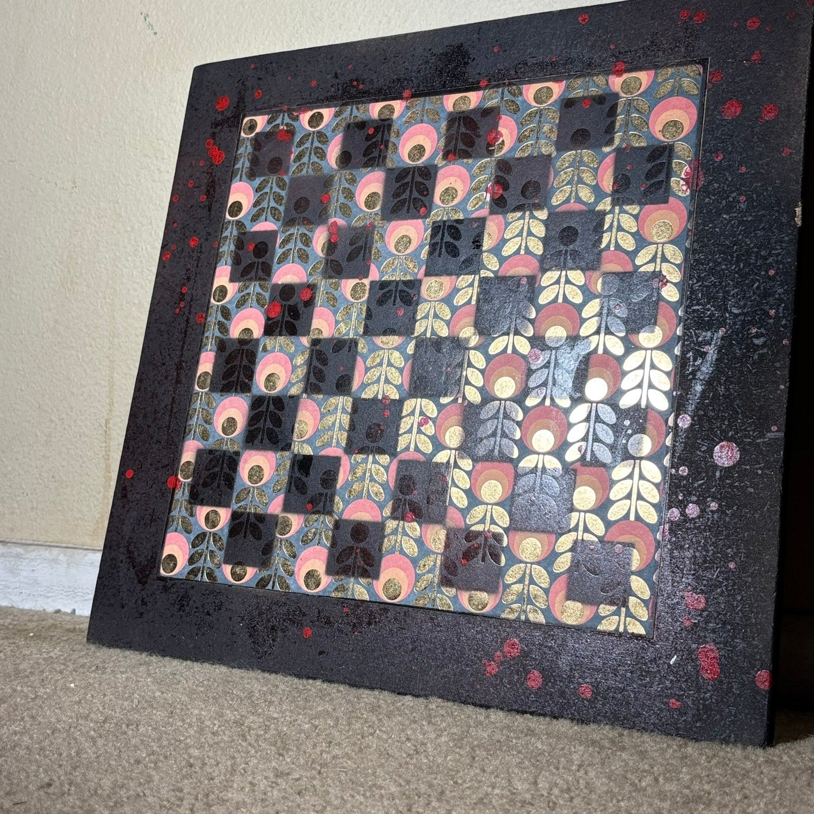 The board is crafted from durable particle board, painted with care to create the classic chess square pattern. What makes this board special is the unique 12x12 piece of scrapbook paper inlaid in the center, adding a personal touch to your game.