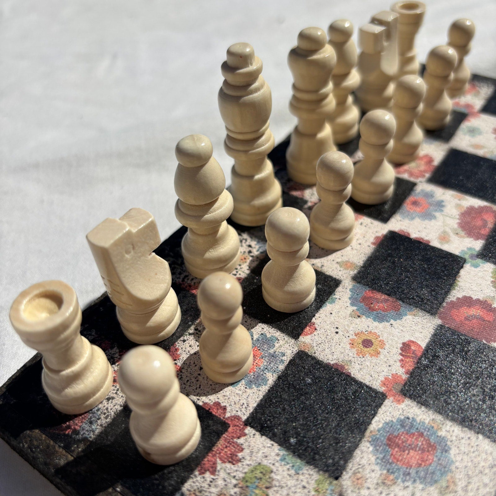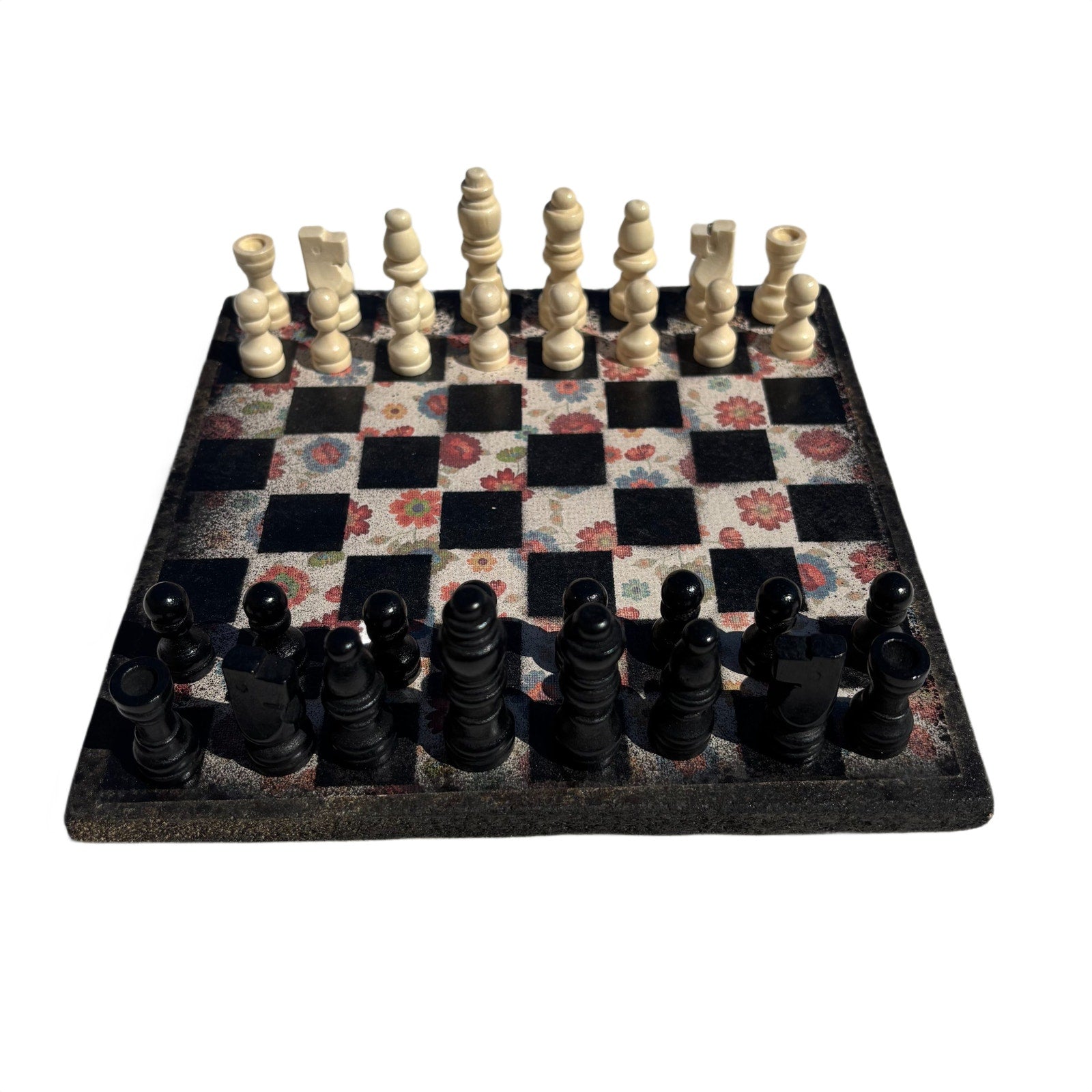 Introducing our exclusive Handcrafted Wooden Chess Set, meticulously designed with precision and care. Measuring 8 inches by 8 inches, this chess set features a beautifully painted particle board layered with a sheet of scrapbook paper board that doubles as a work of art. Each set is a unique, one-of-a-kind creation, crafted by hand to ensure that no two sets are alike. Elevate your gaming experience with this exceptional chess set that combines vibrant design with the touch of artisan craftsmanship. This chess board comes with chess pieces and is handcrafted as a one of one