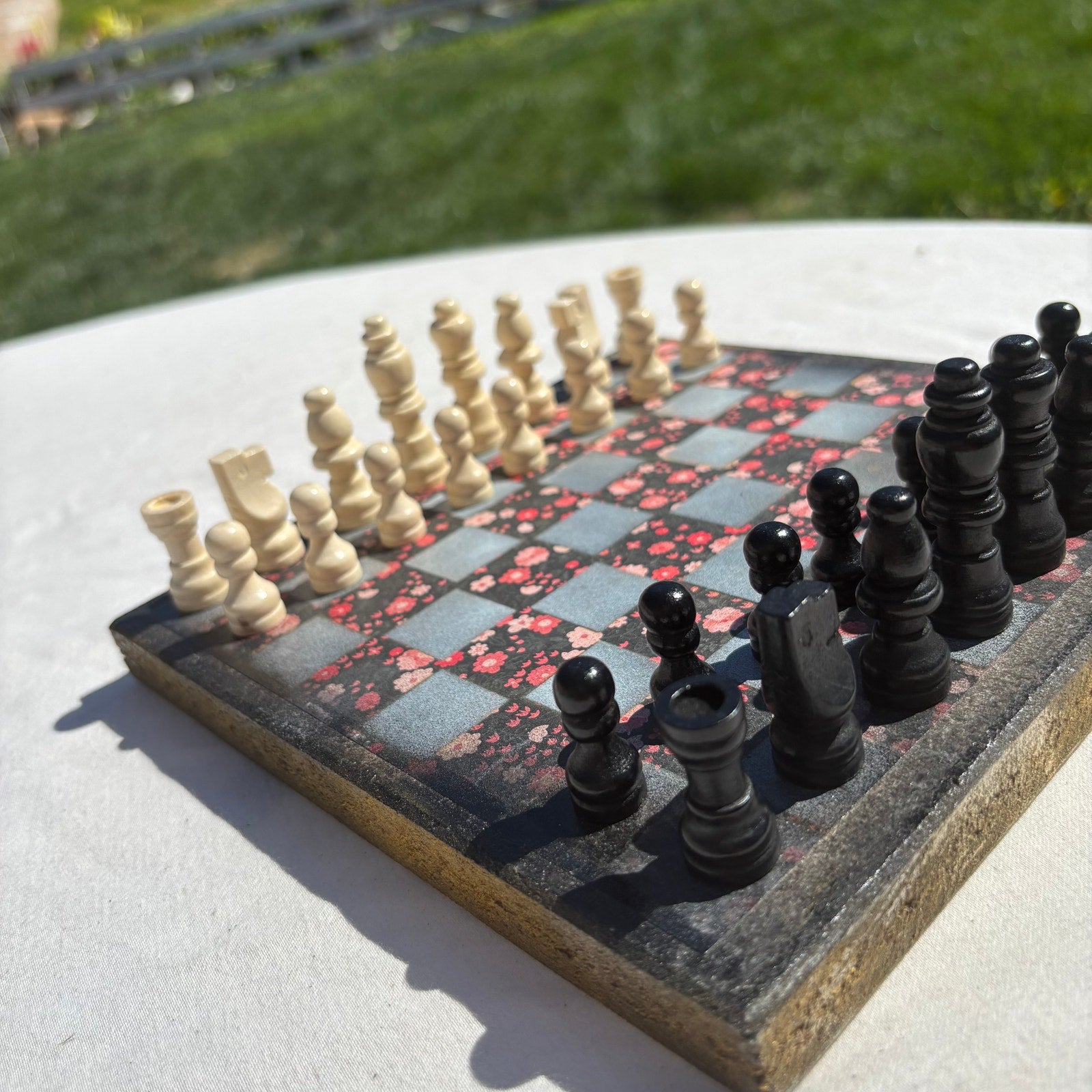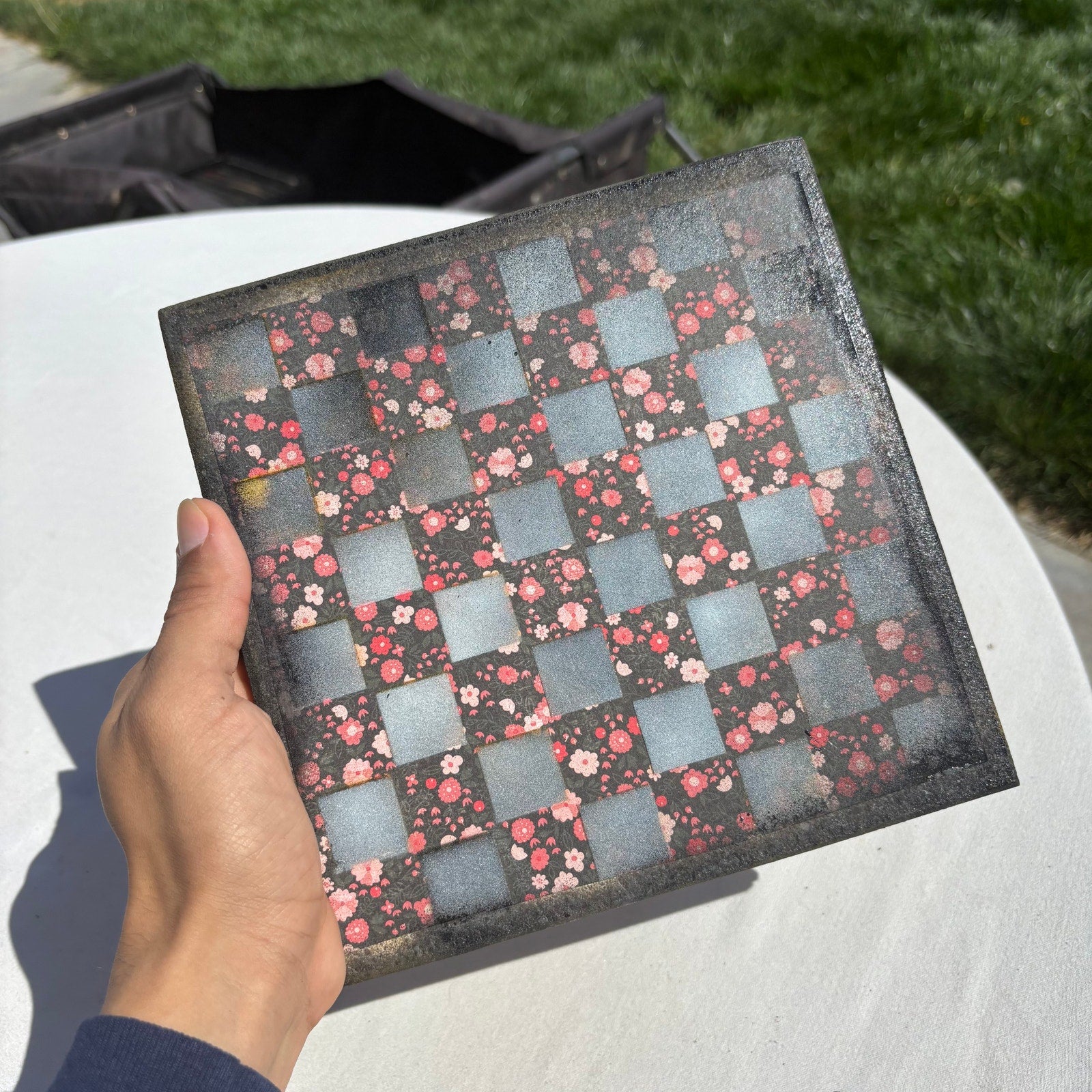 Introducing our exclusive Handcrafted Wooden Chess Set, meticulously designed with precision and care. Measuring 8 inches by 8 inches, this chess set features a beautifully painted particle board layered with a sheet of scrapbook paper board that doubles as a work of art. Each set is a unique, one-of-a-kind creation, crafted by hand to ensure that no two sets are alike. Elevate your gaming experience with this exceptional chess set that combines vibrant design with the touch of artisan craftsmanship. This chess board comes with chess pieces and is handcrafted as a one of one
