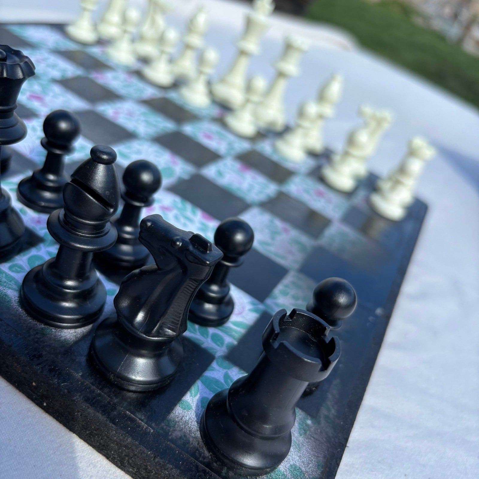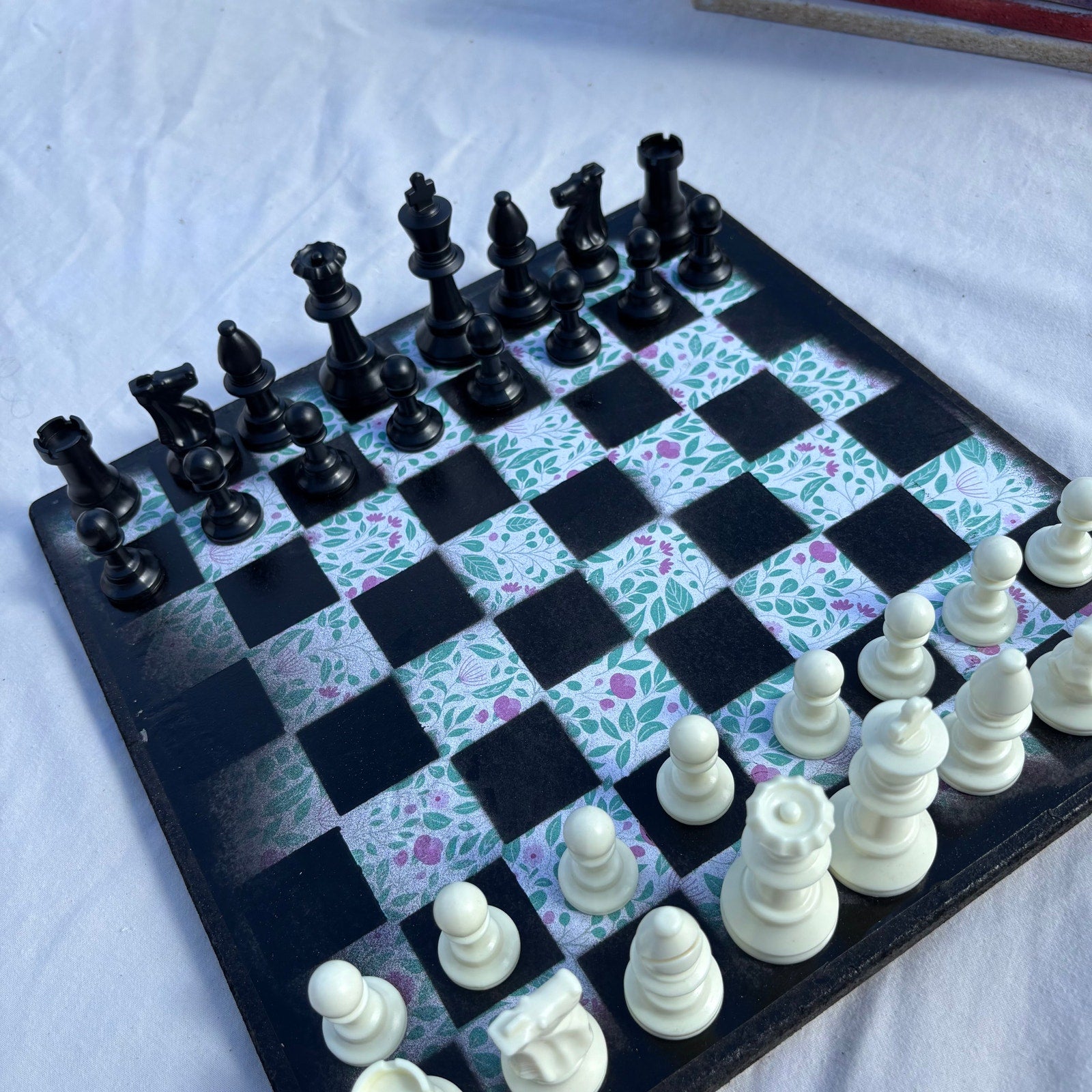 Introducing our exclusive Handcrafted Wooden Chess Set, meticulously designed with precision and care. Measuring 12 inches by 12 inches, this chess set features a beautifully painted particle board layered with a sheet of scrapbook paper board that doubles as a work of art. Each set is a unique, one-of-a-kind creation, crafted by hand to ensure that no two sets are alike. Elevate your gaming experience with this exceptional chess set that combines vibrant design with the touch of artisan craftsmanship. This chess board comes with chess pieces and is handcrafted as a one of one