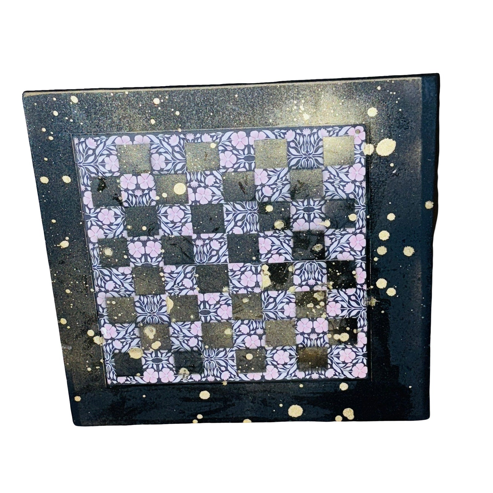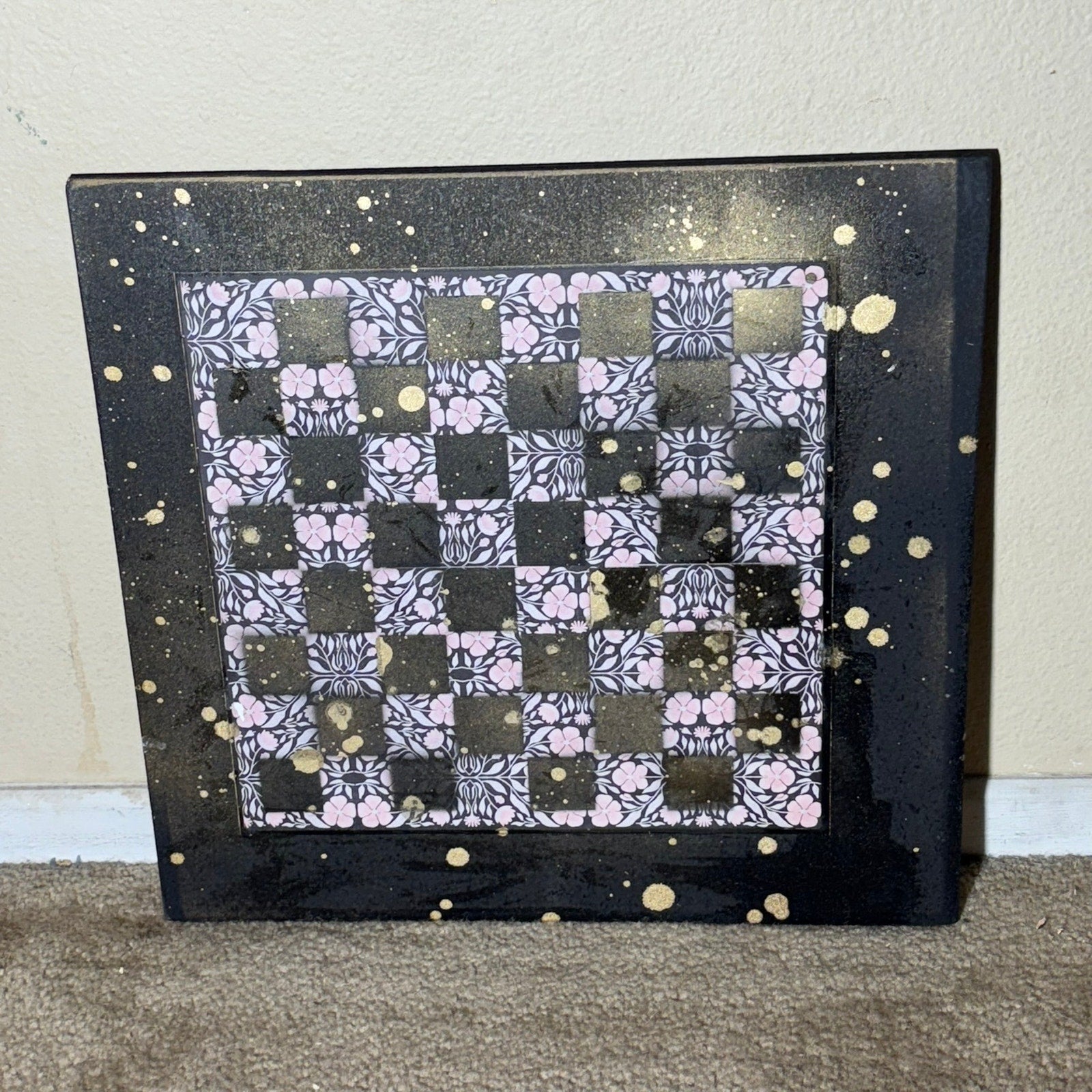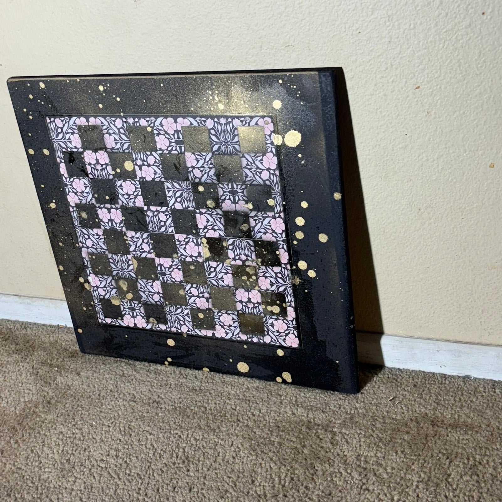 The board is crafted from durable particle board, painted with care to create the classic chess square pattern. What makes this board special is the unique 12x12 piece of scrapbook paper inlaid in the center, adding a personal touch to your game.