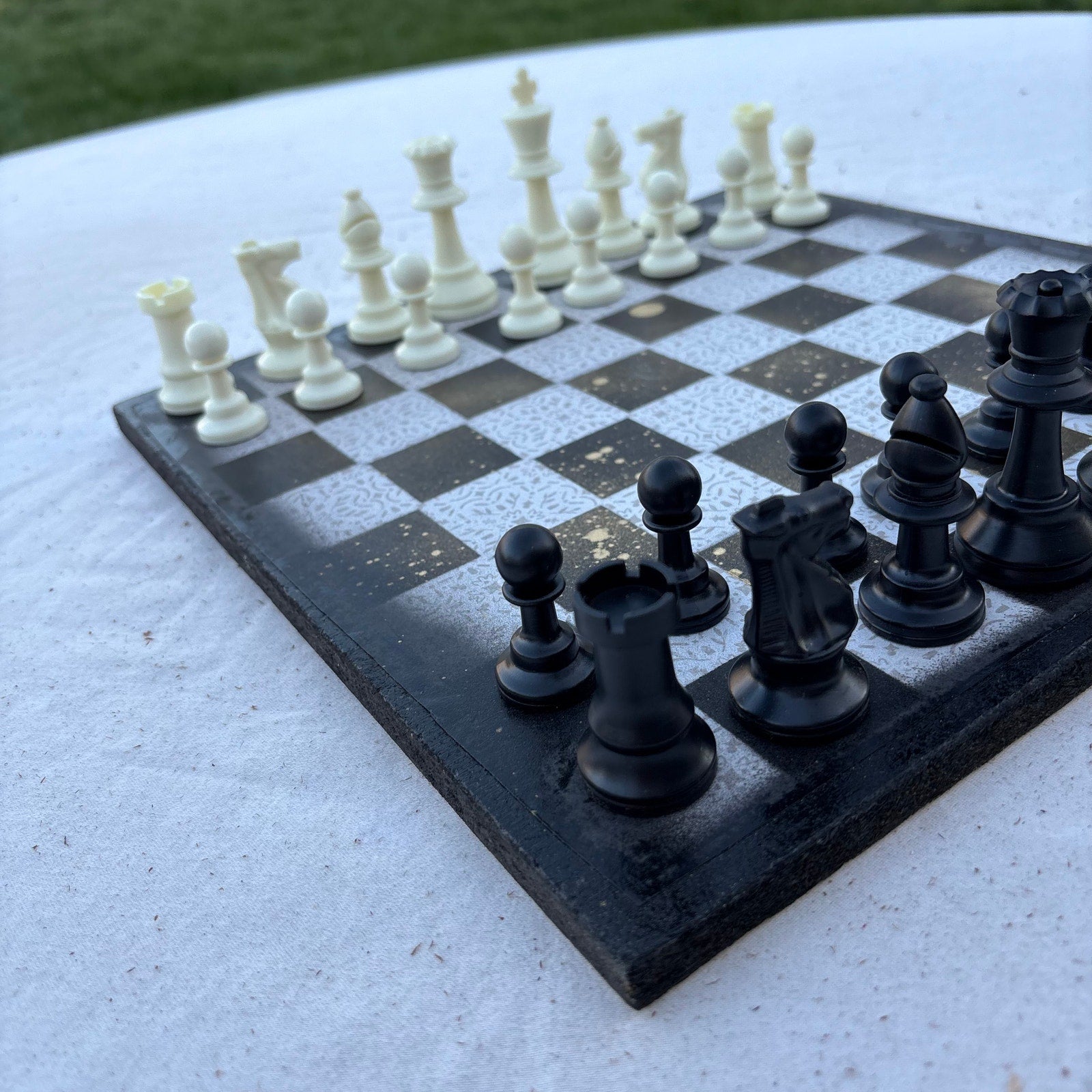 Introducing our exclusive Handcrafted Wooden Chess Set, meticulously designed with precision and care. Measuring 12 inches by 12 inches, this chess set features a beautifully painted particle board layered with a sheet of scrapbook paper board that doubles as a work of art. Each set is a unique, one-of-a-kind creation, crafted by hand to ensure that no two sets are alike. Elevate your gaming experience with this exceptional chess set that combines vibrant design with the touch of artisan craftsmanship. This chess board comes with chess pieces and is handcrafted as a one of one