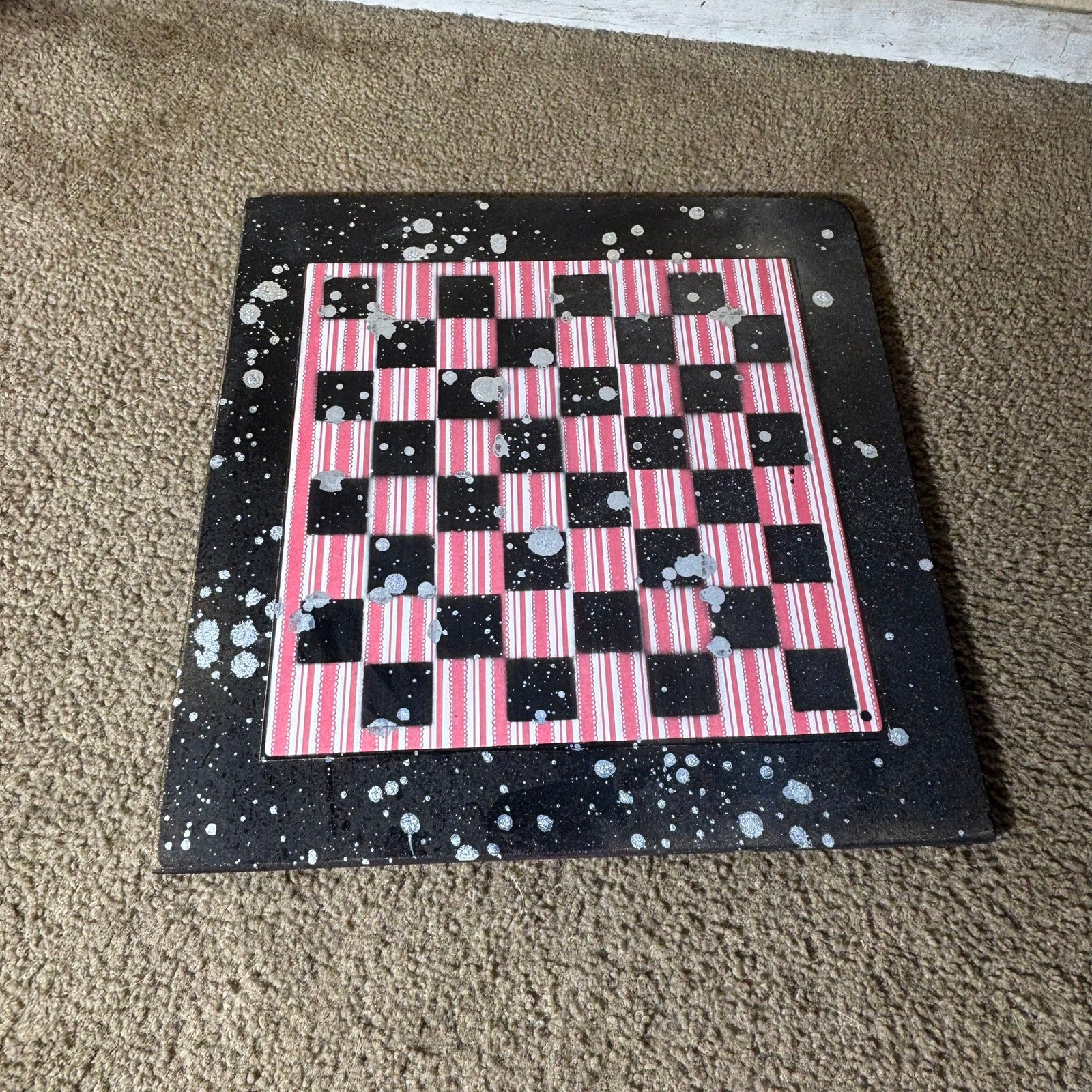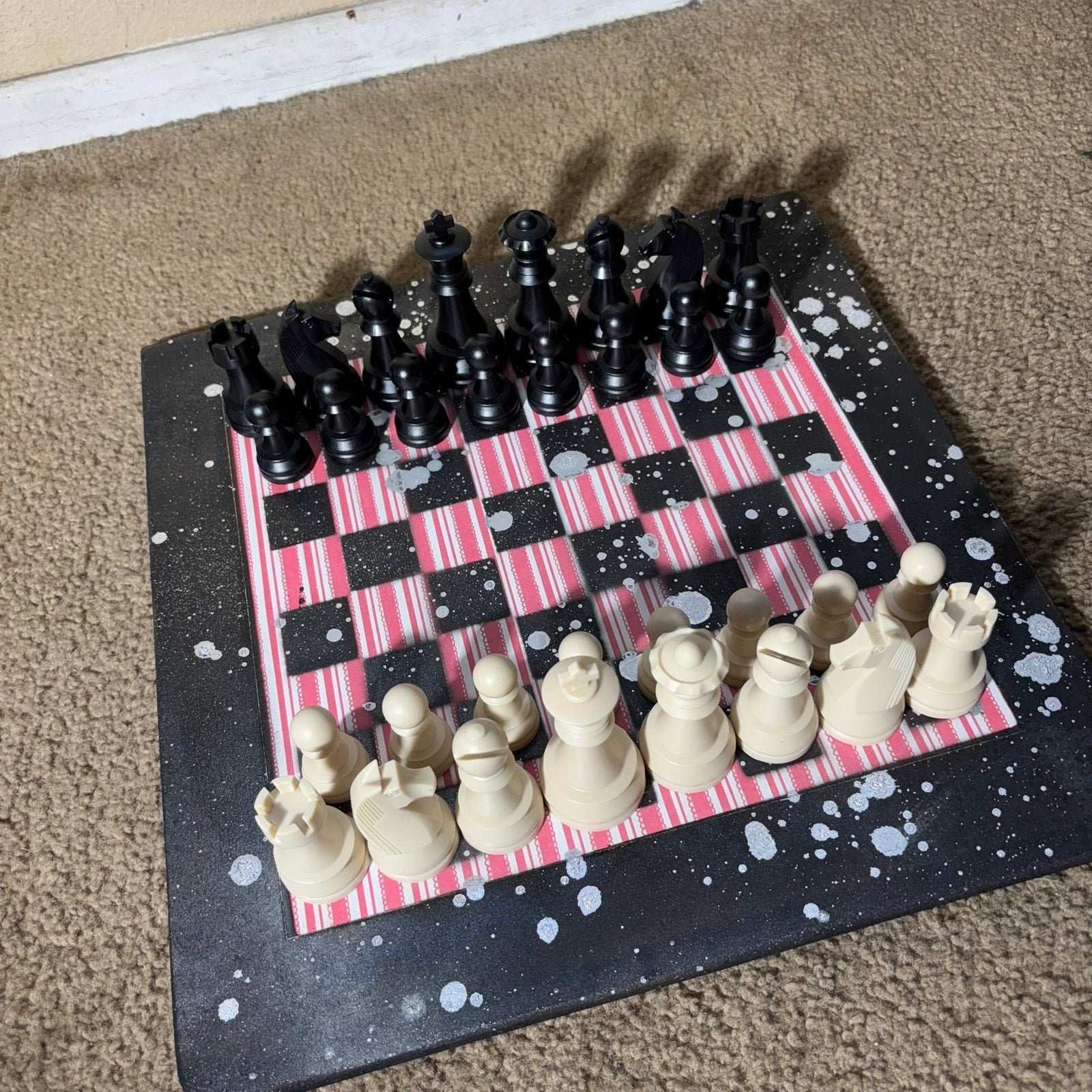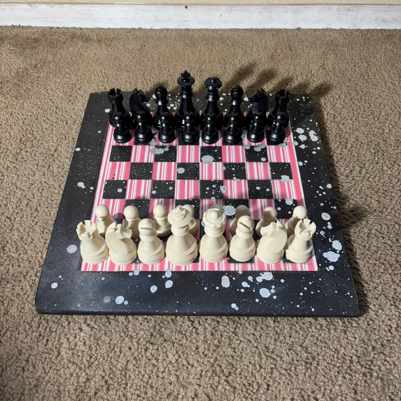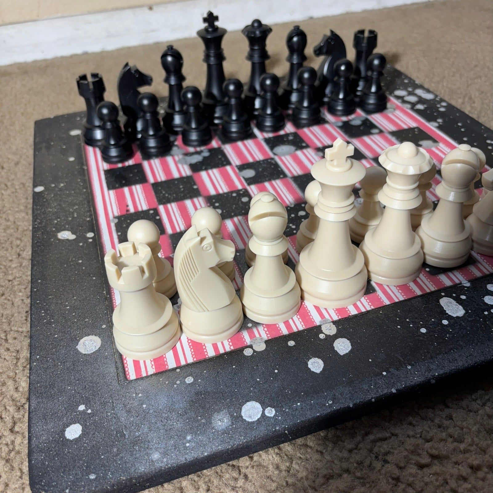 The chessboard is crafted from a 16x16 inch particle board, featuring a 12x12 inch scrapbook paper playing area. Both the board and squares are hand-painted with care, making each set truly unique. Add a touch of artistry to your game night with this beautiful chess set!